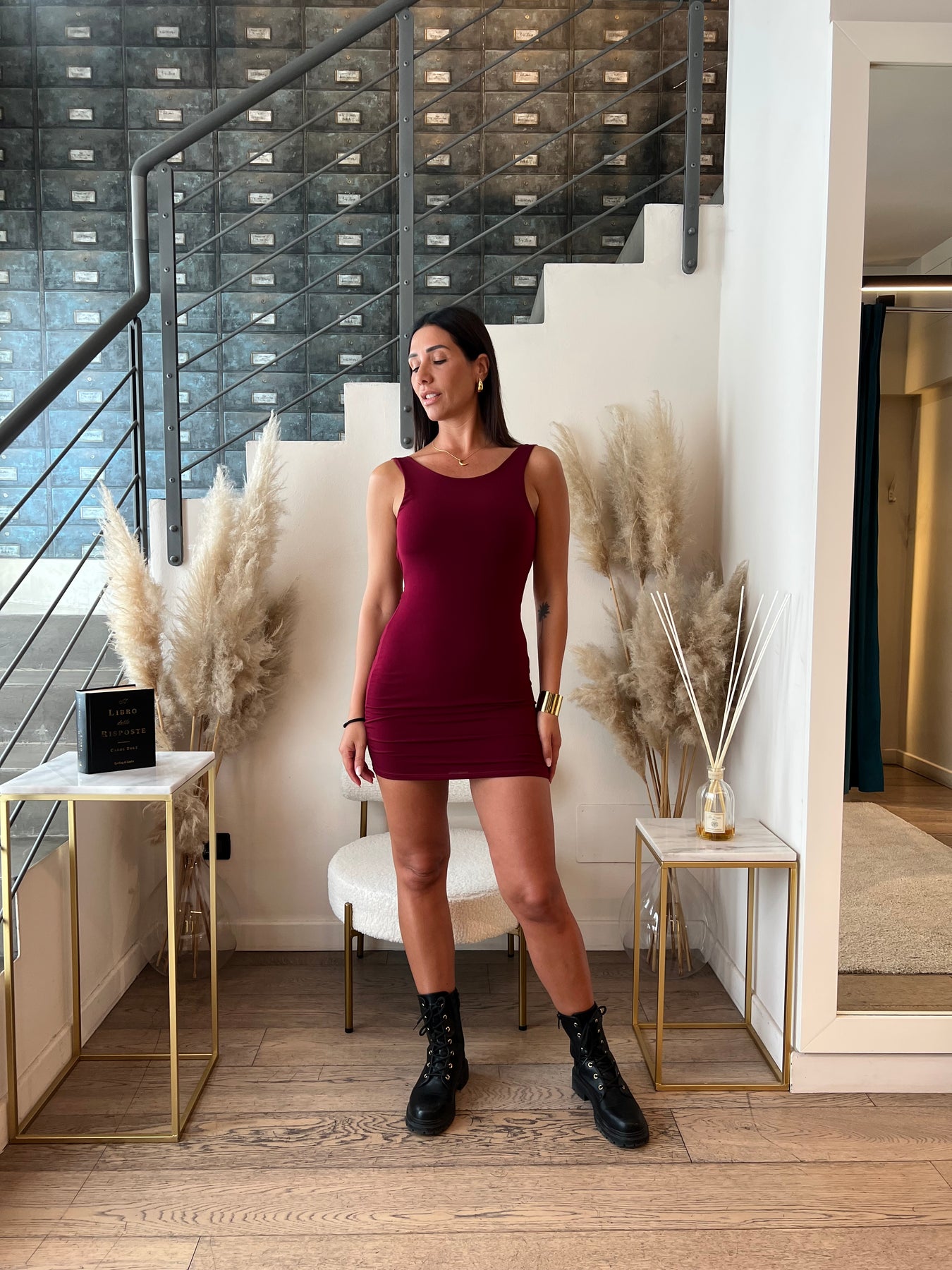 Abito corto doppiato dalla modellatura slim con scollo profondo nella schina. Veste dalla 40 alla 44