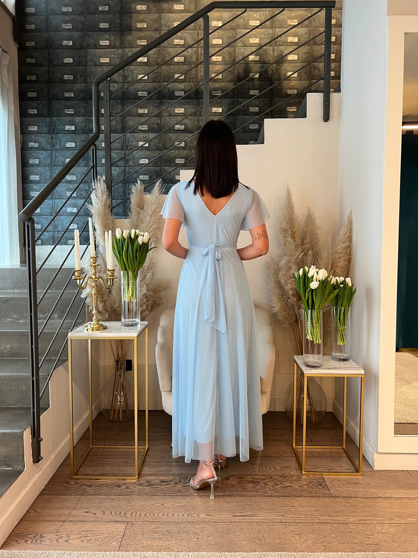 Abito lungo in tulle doppiato morbidissimo. Corpetto con scollo incrociato, coppette preformate  e maniche a petalo. Gonna lunga e fascia in vita regolabile nella schiena con un fiocco. Veste dalla 40 alla 46