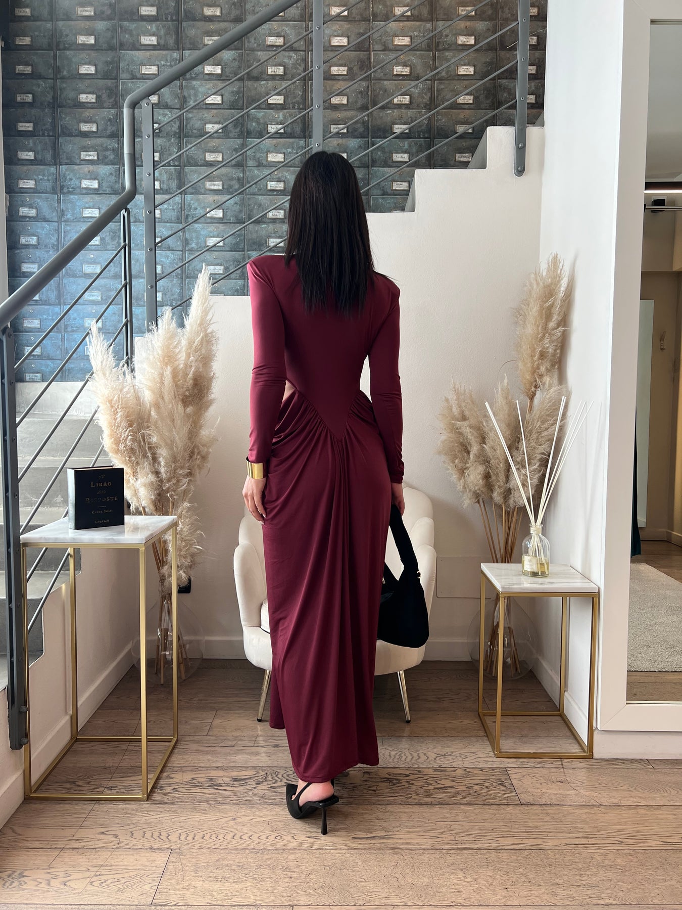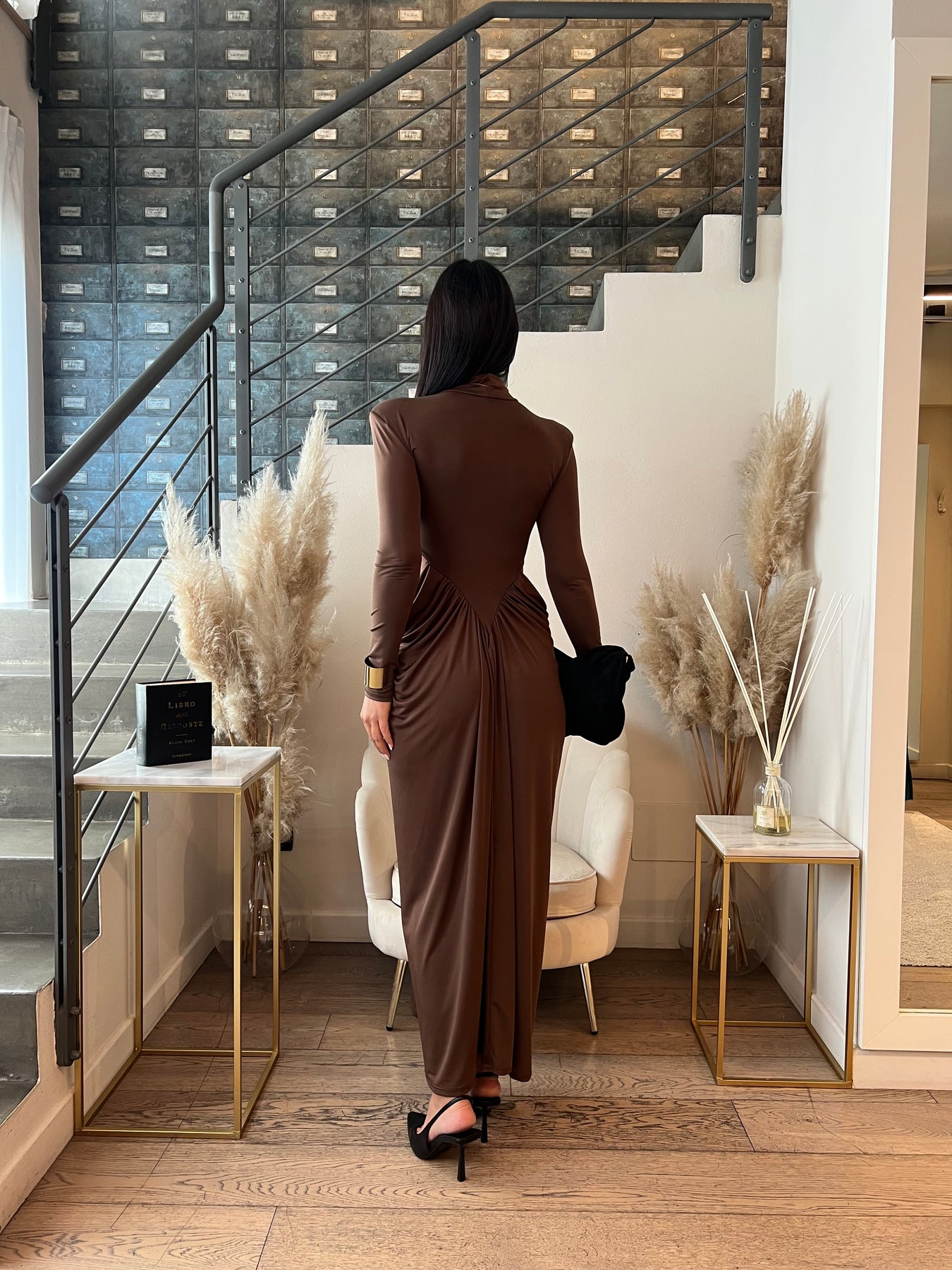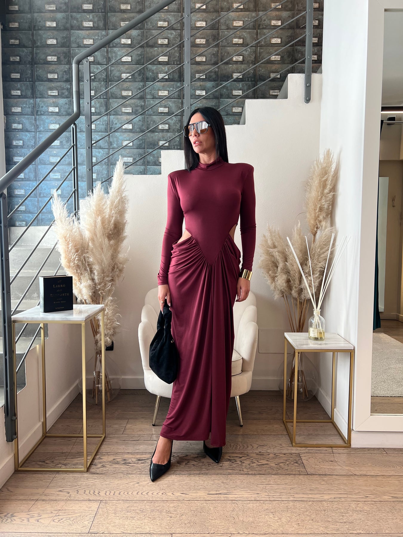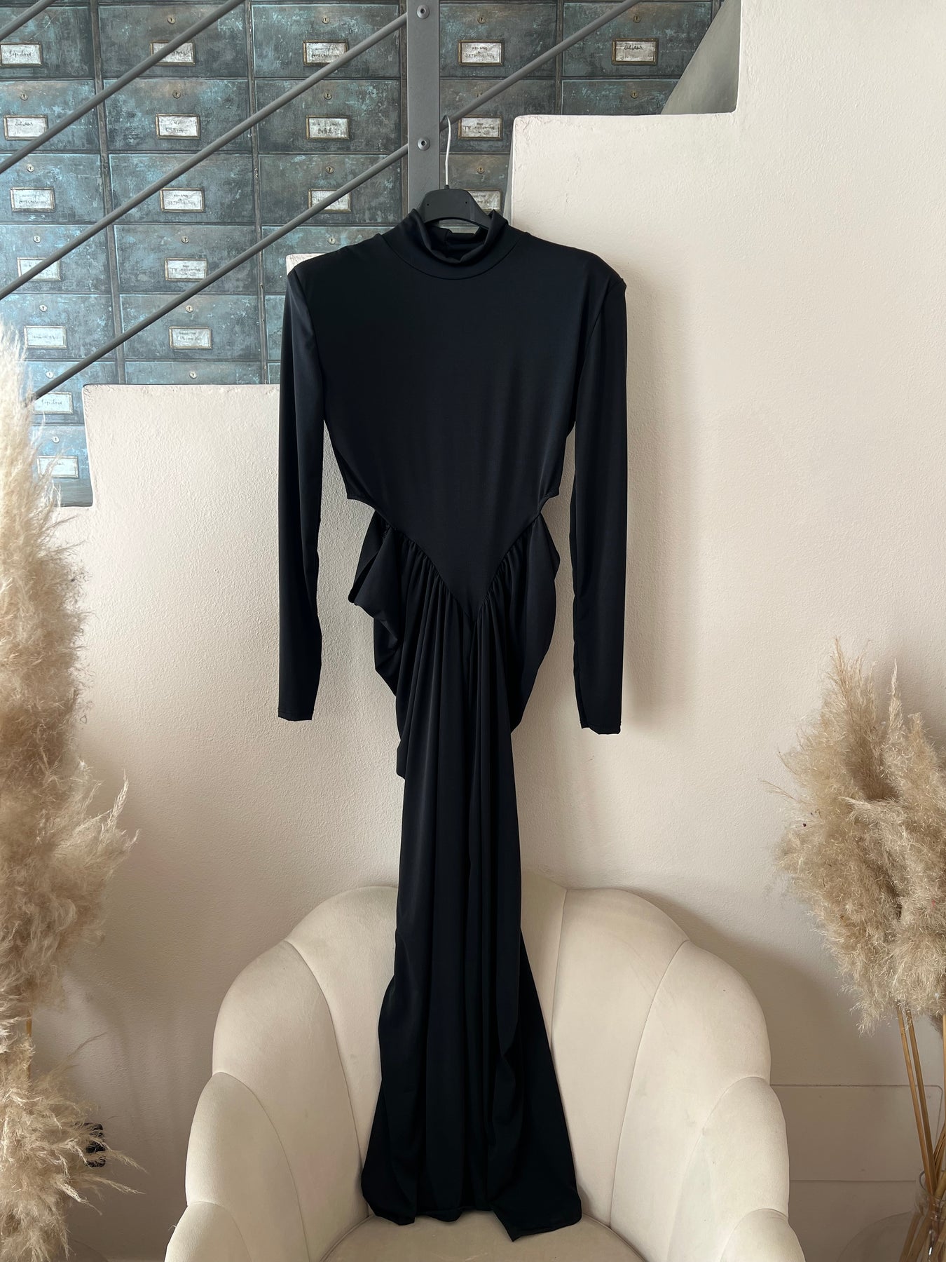 Abito lungo in maglia elasticizzata a maniche lunghe con apertura sui fianchi e arricciatura al centro. Veste dalla 40 alla 44