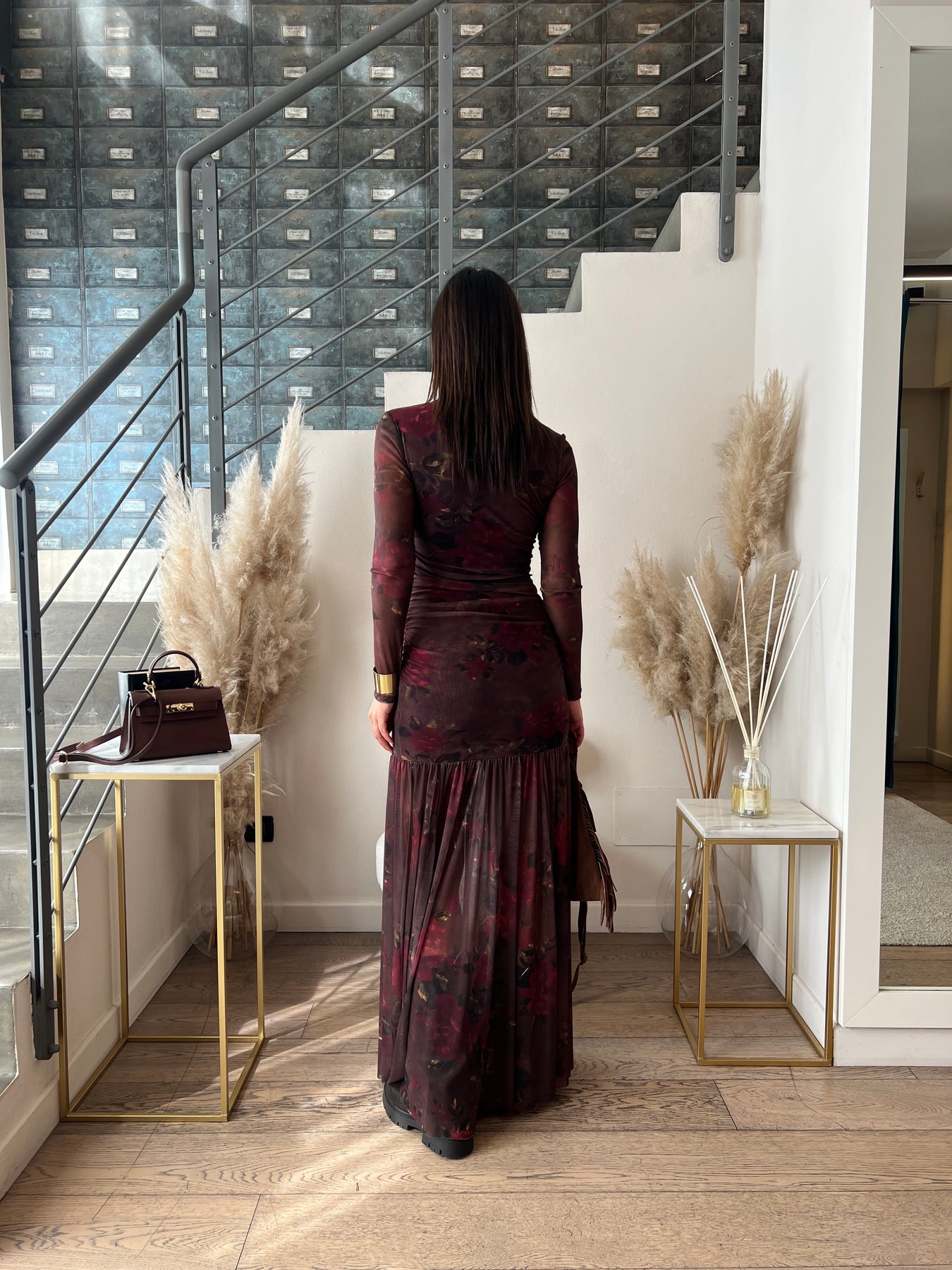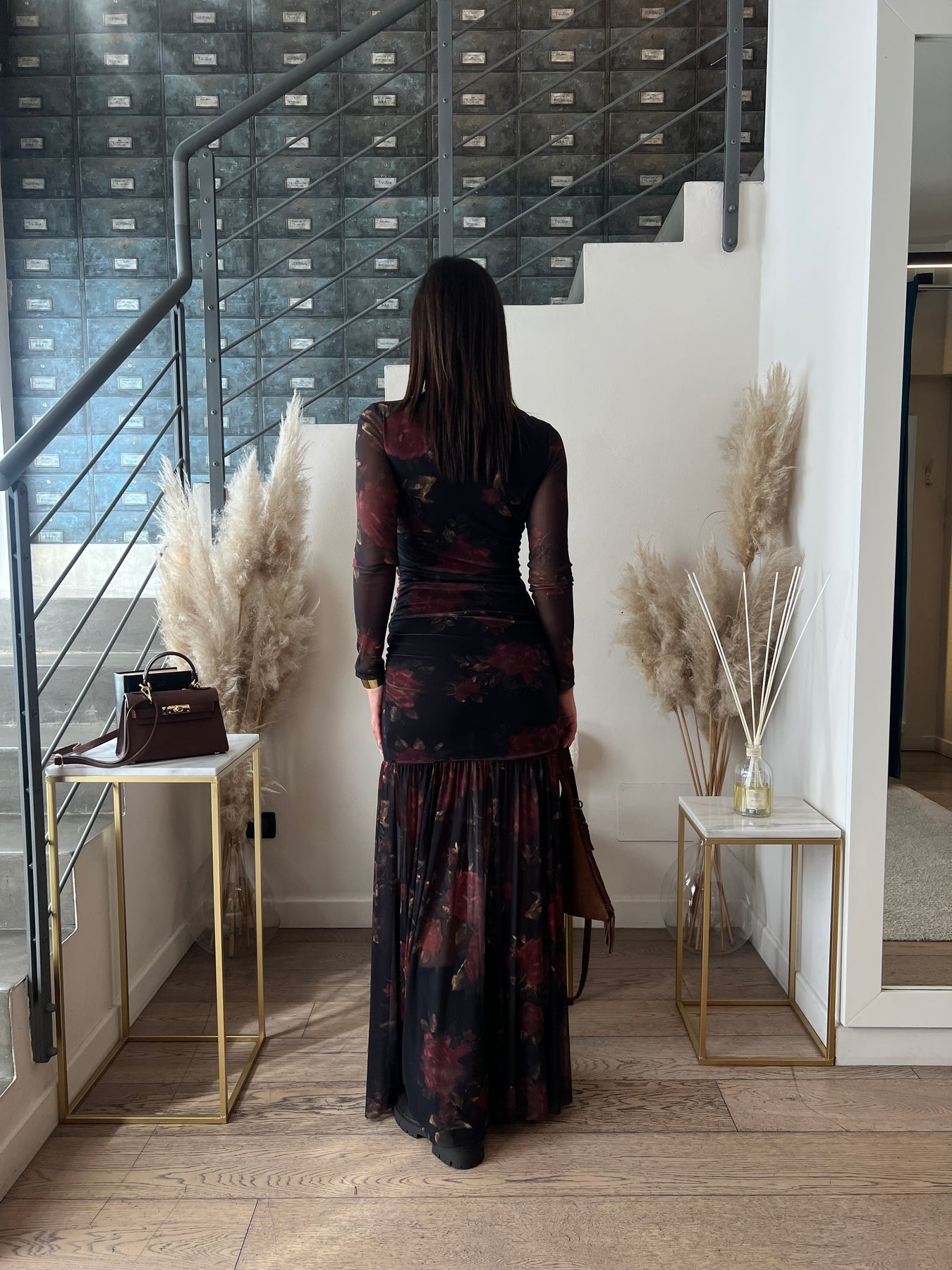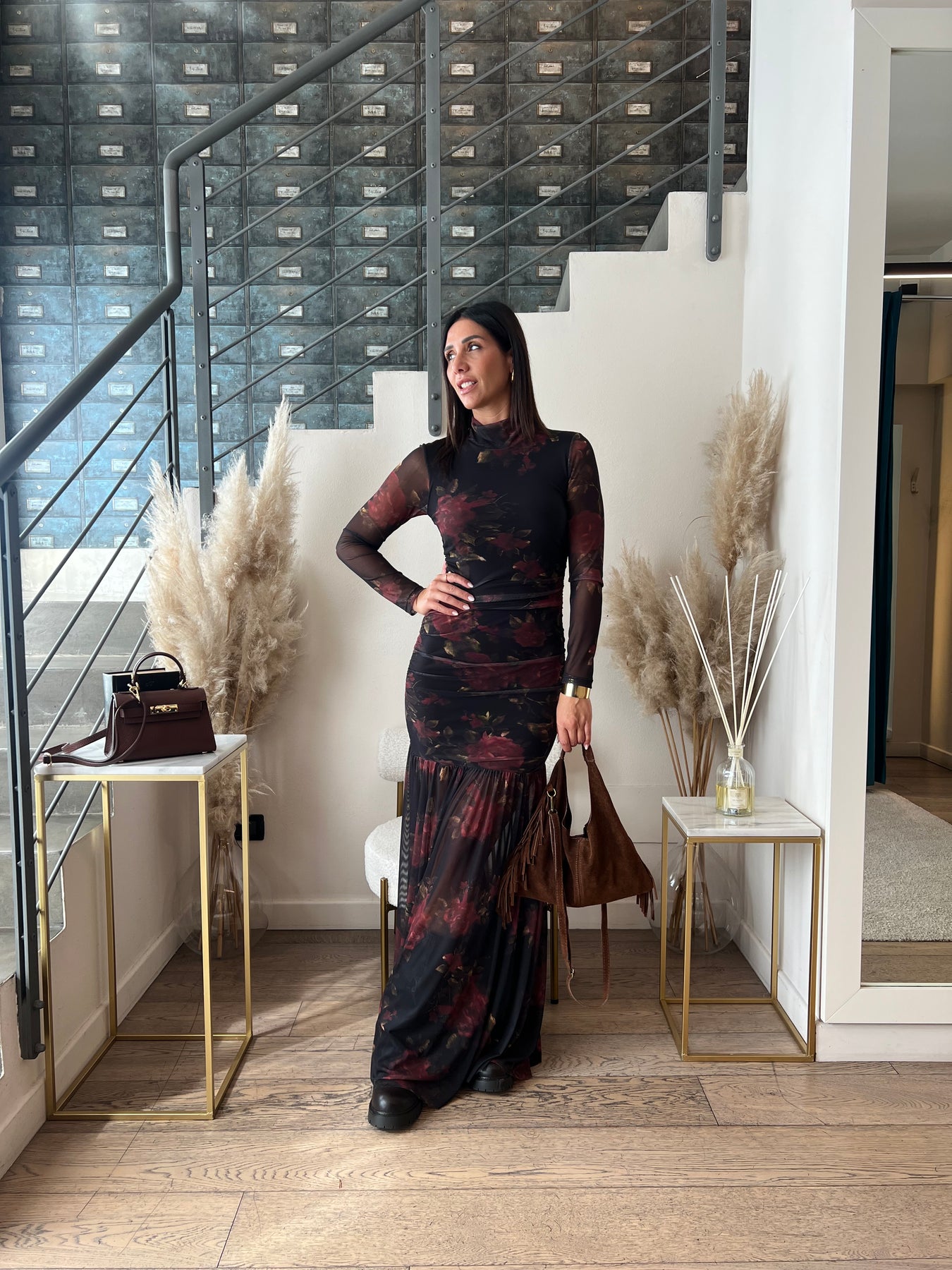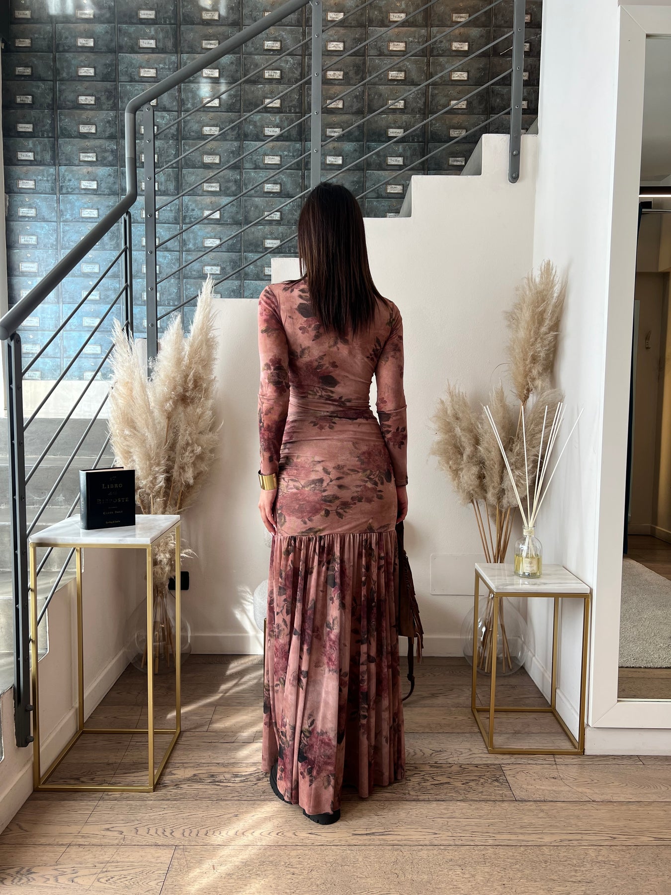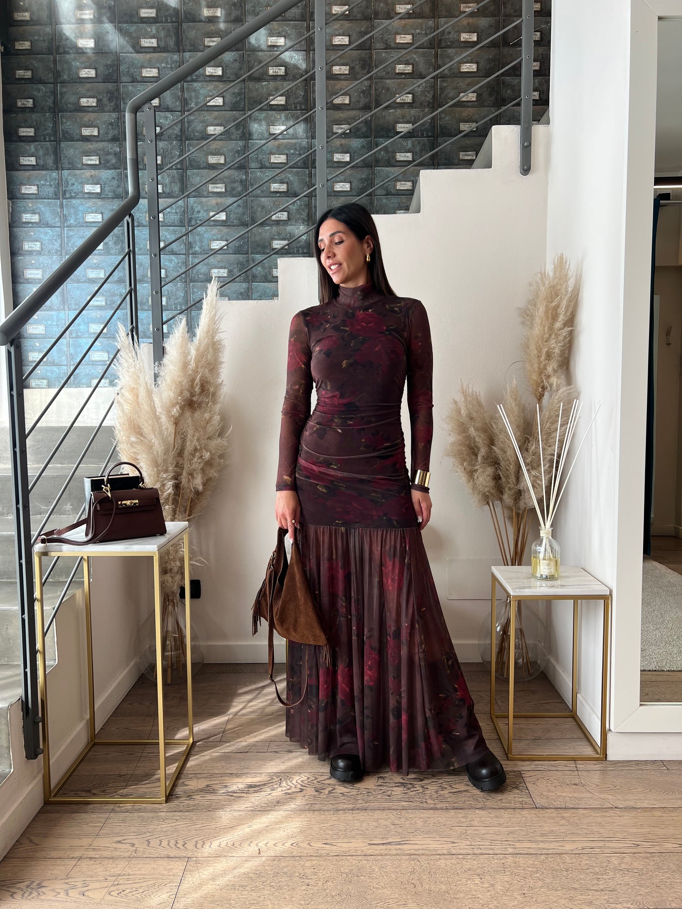 Abito lungo in tulle semitrasparente stampato con top asciutto doppiato e gonna morbida.