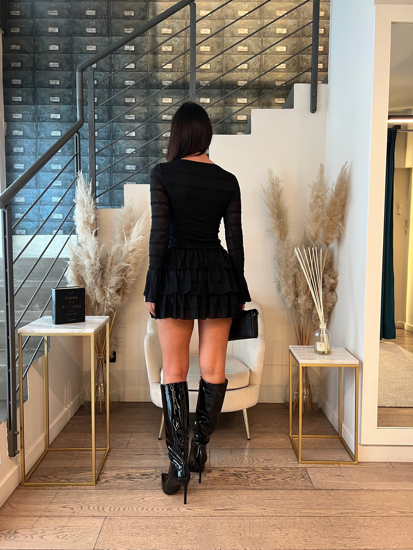 Abito corto in pizzo con top asciutto e gonna con balze. Veste dalla 40 alla 44