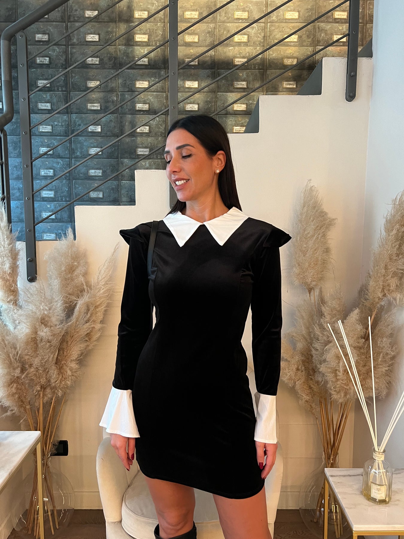 Abito in velluto elasticizzato modello tubino con dettaglio collo e polsi bianchi. Veste dalla 40 alla 44