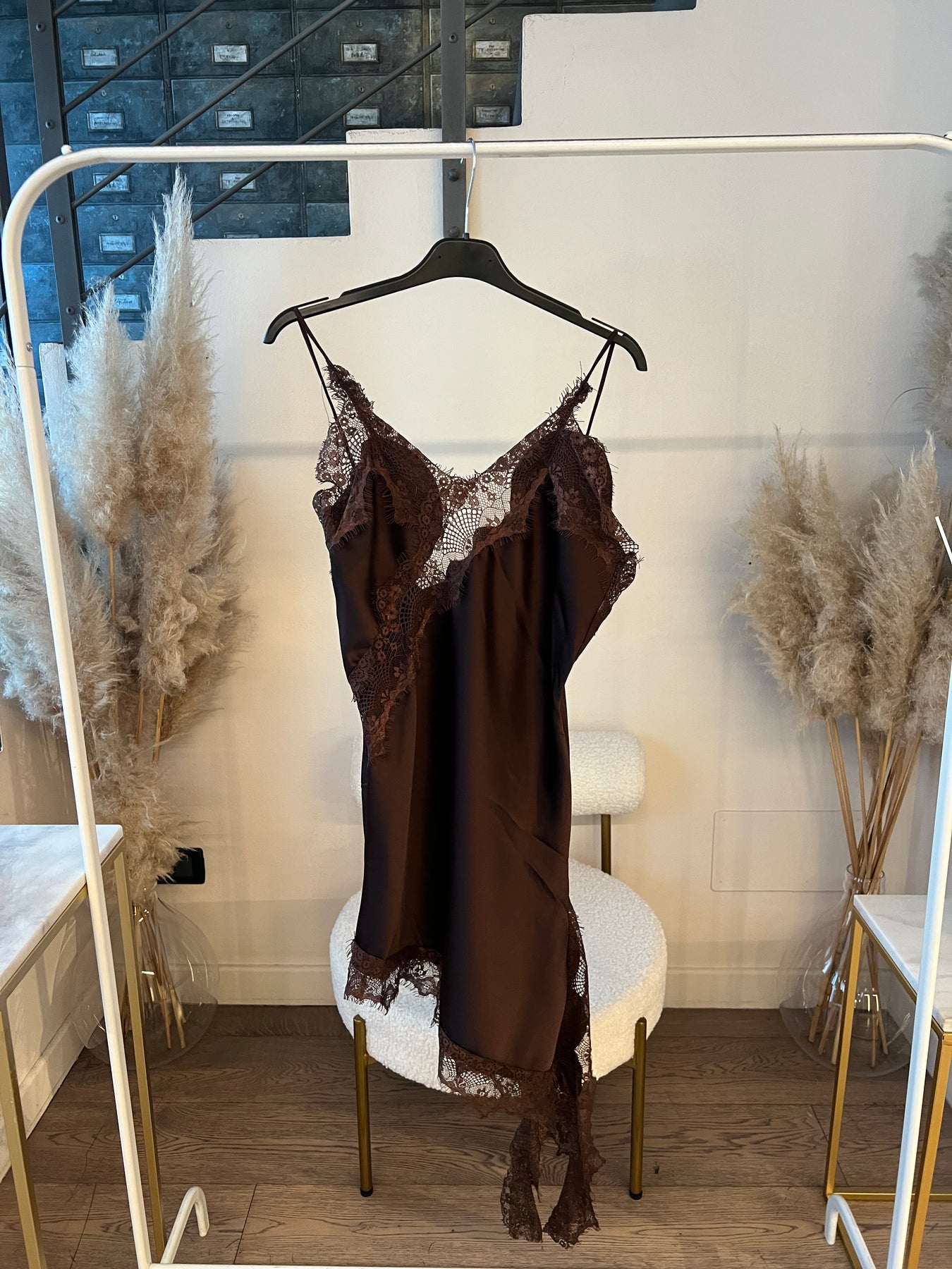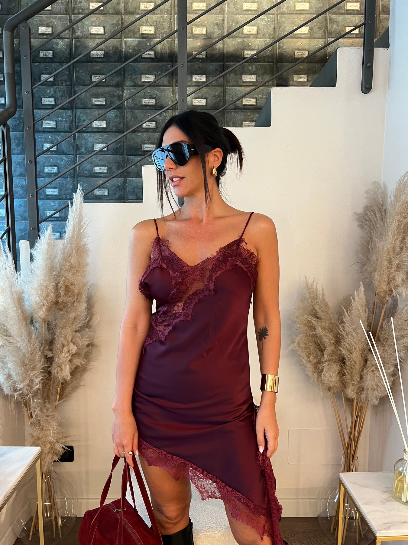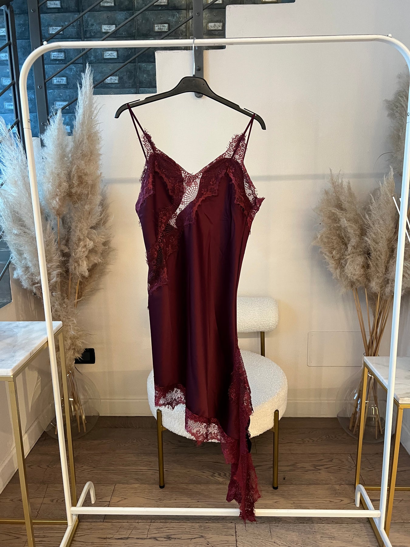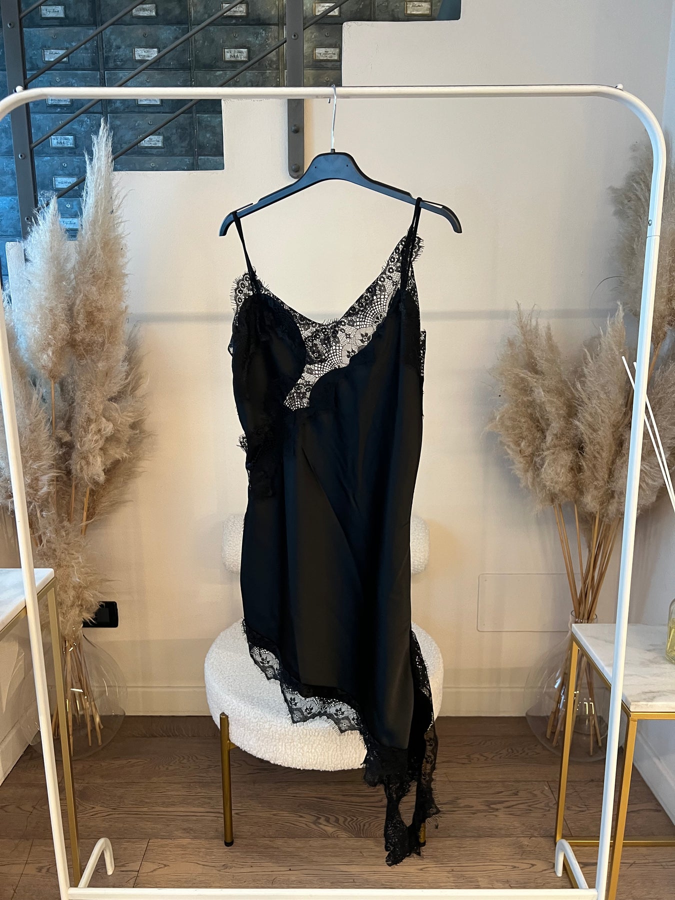 Mini abito satin con bordo in pizzo dalla modellatura slim con taglio asimmetrico. Veste dalla 38 alla 42