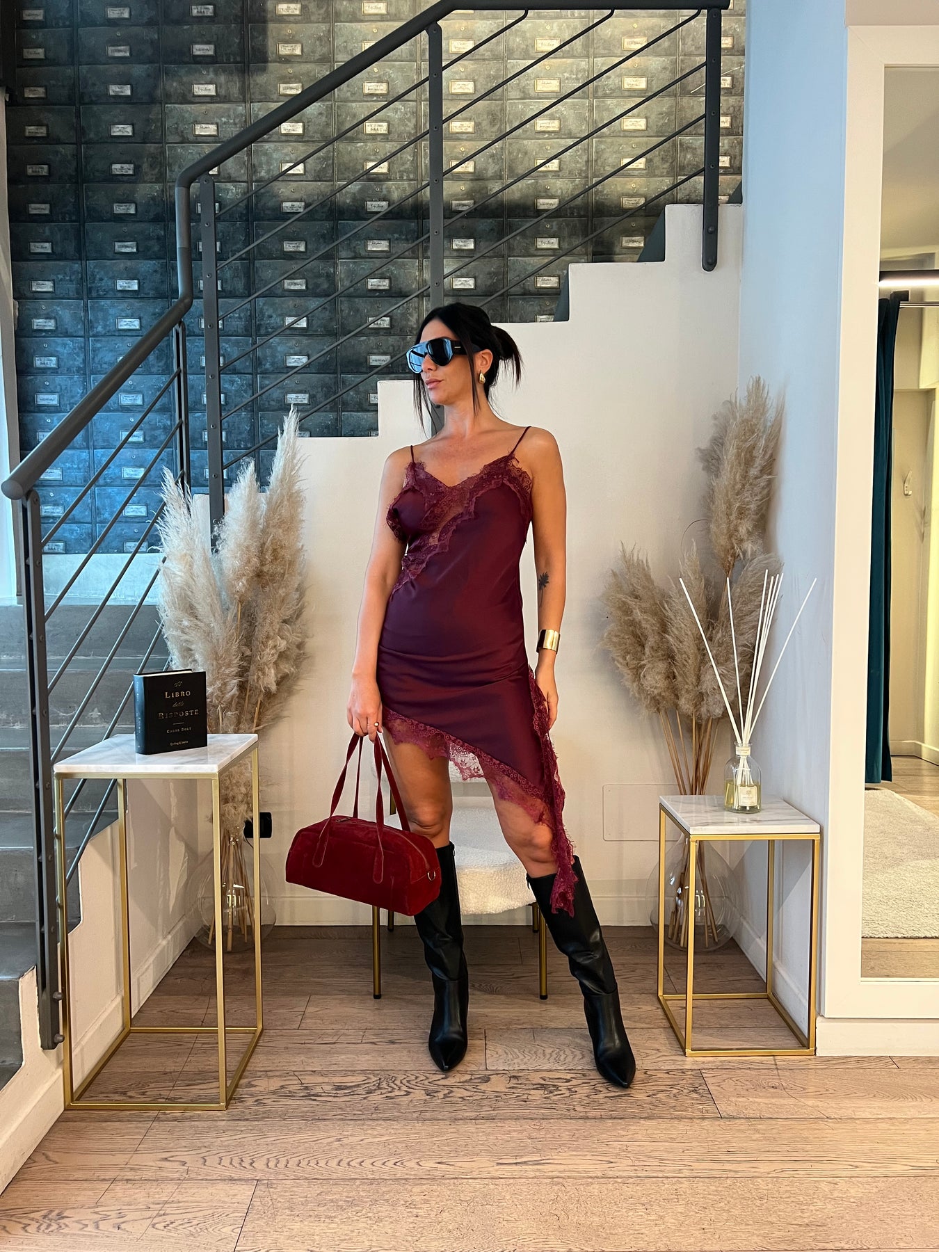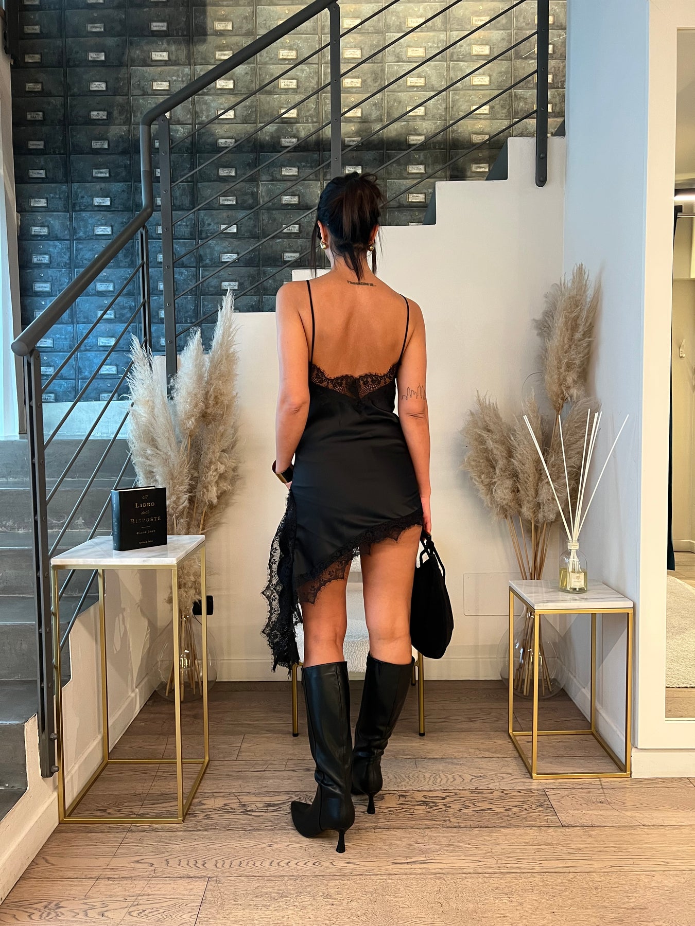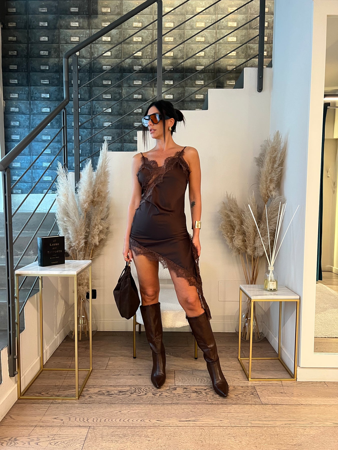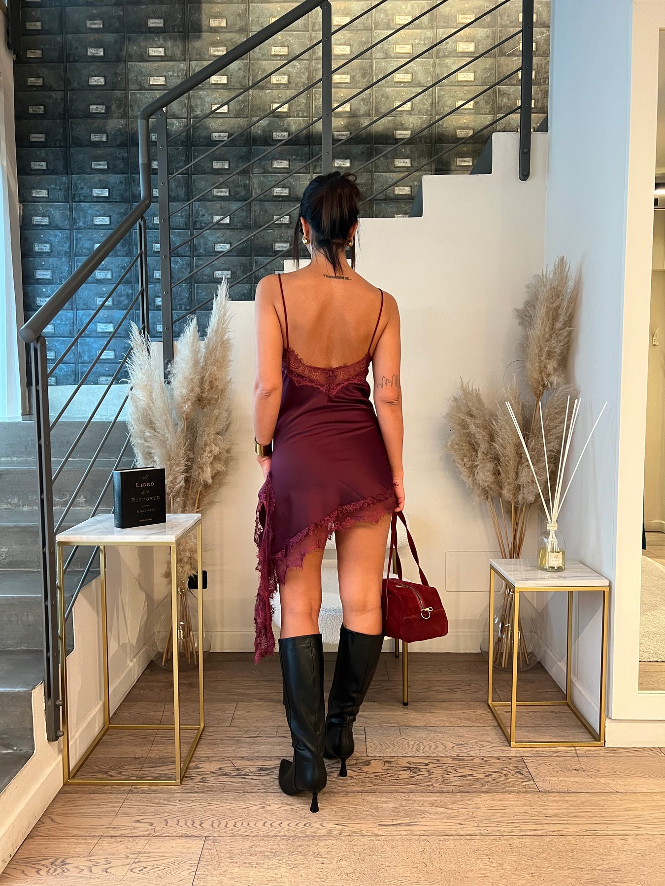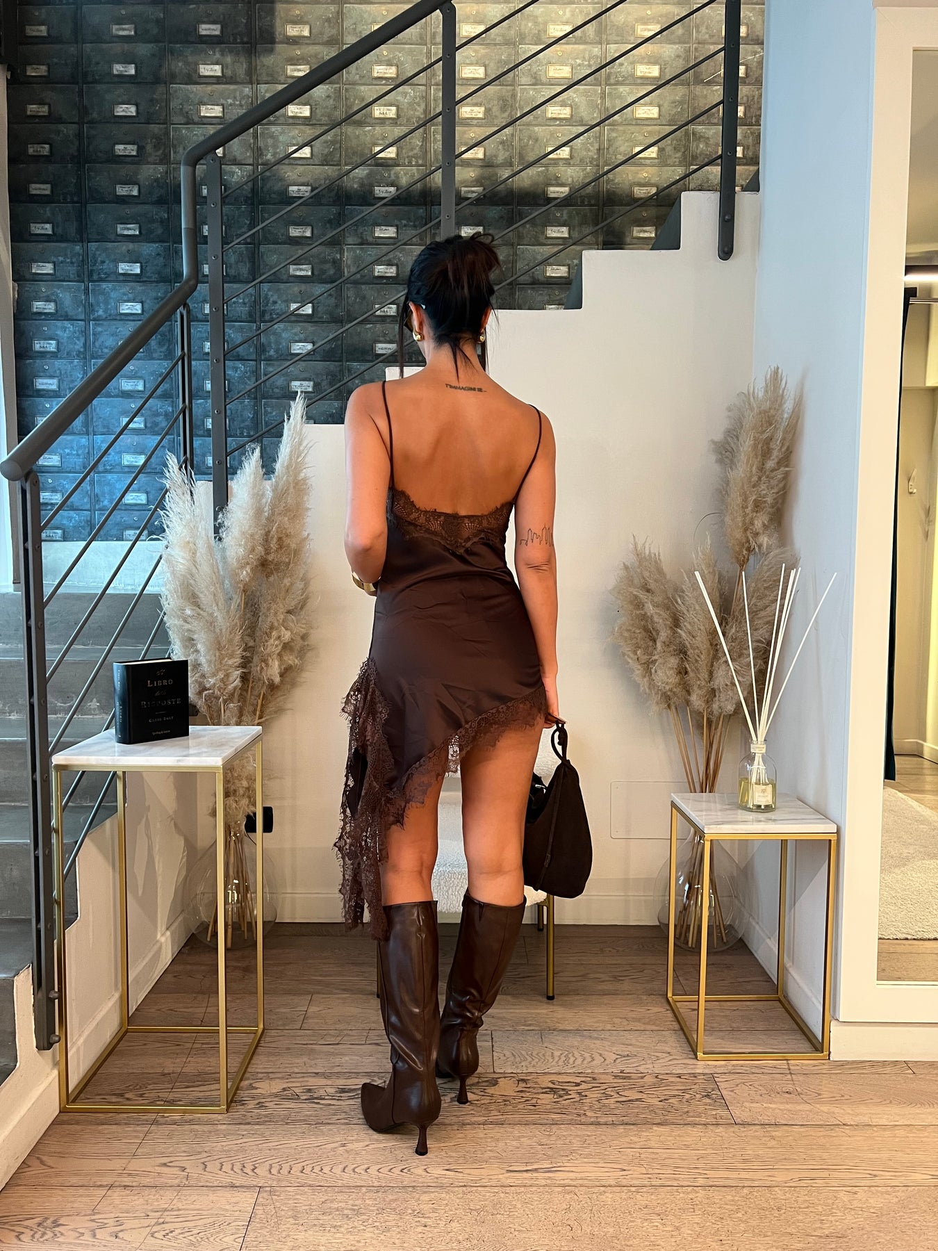 Mini abito satin con bordo in pizzo dalla modellatura slim con taglio asimmetrico. Veste dalla 38 alla 42