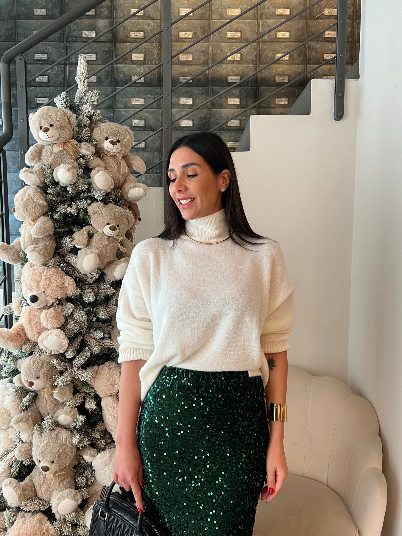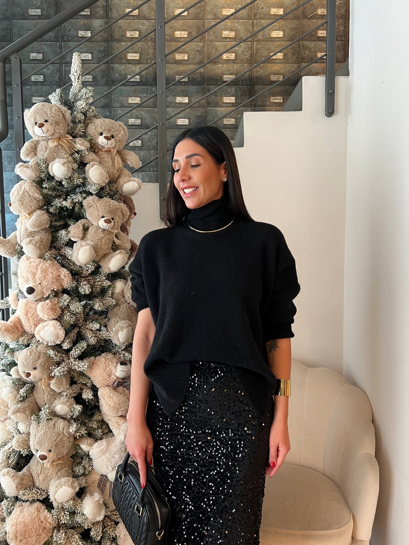 Maglione misto lana a collo alto dalla vestibilità ampia con spacchi laterali e retro più lungo. Veste dalla 40 alla 44