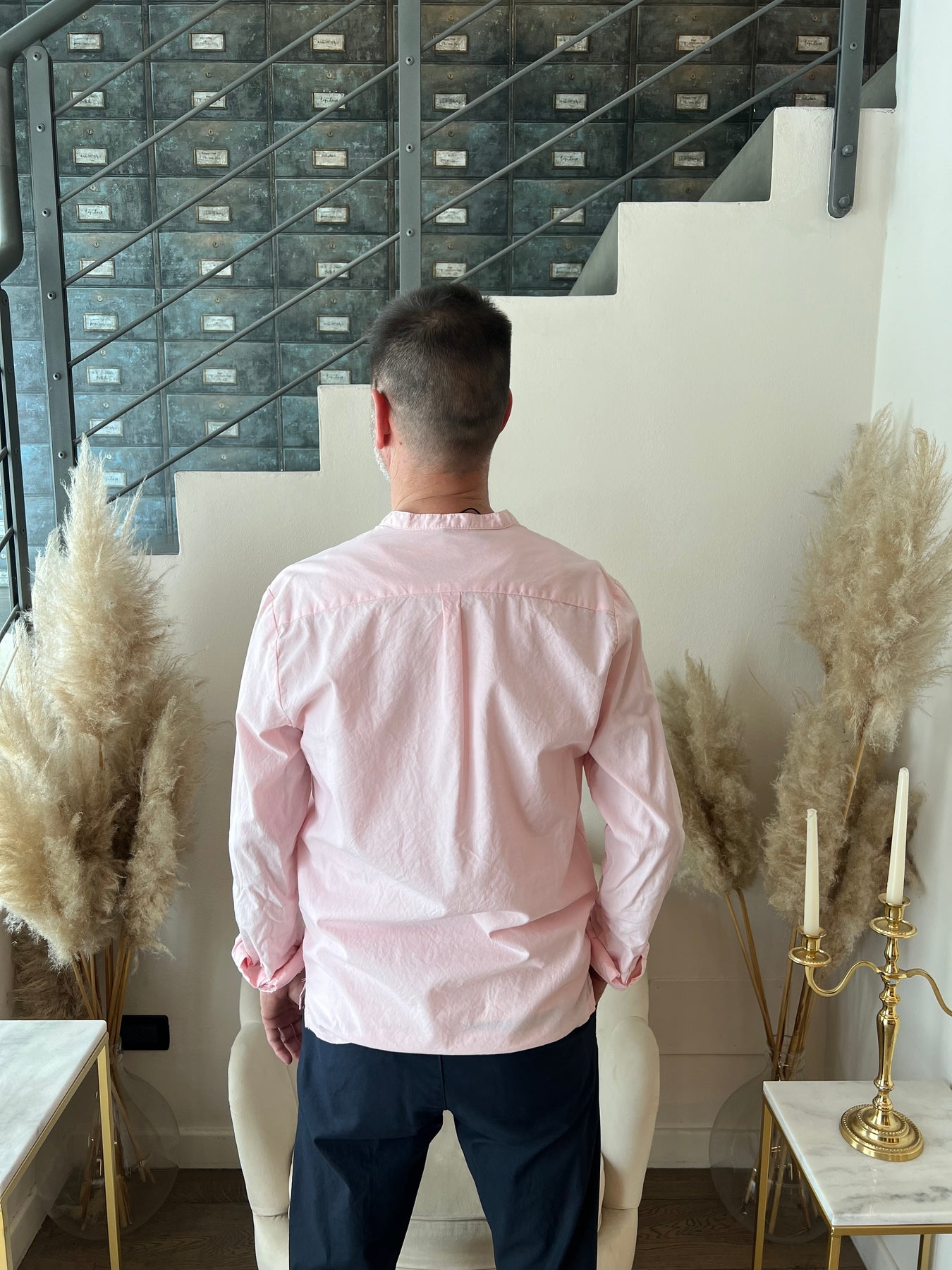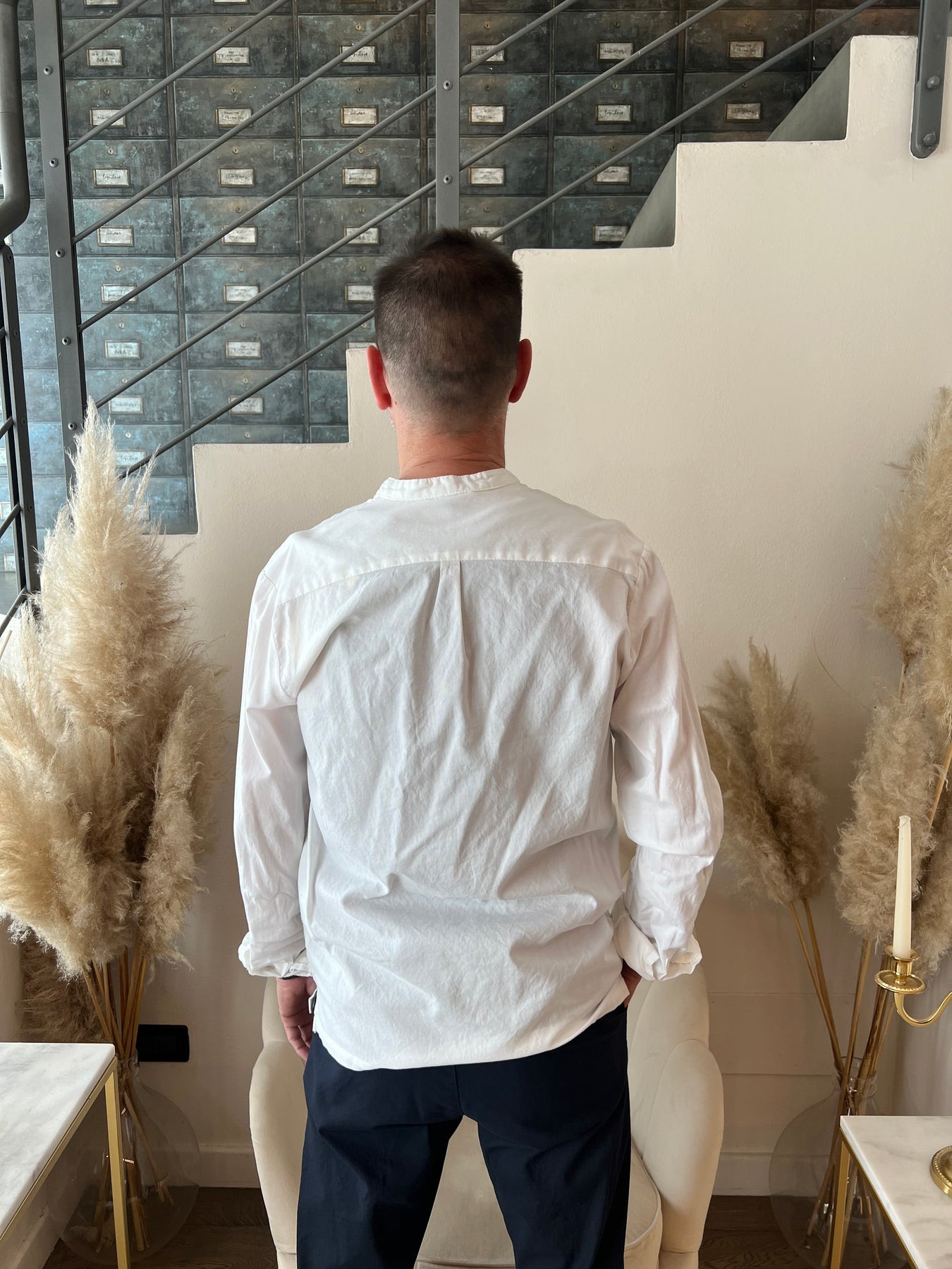 Camicia in cotone dalla modellatura dritta con collo a cinturino e scollo a Polo.