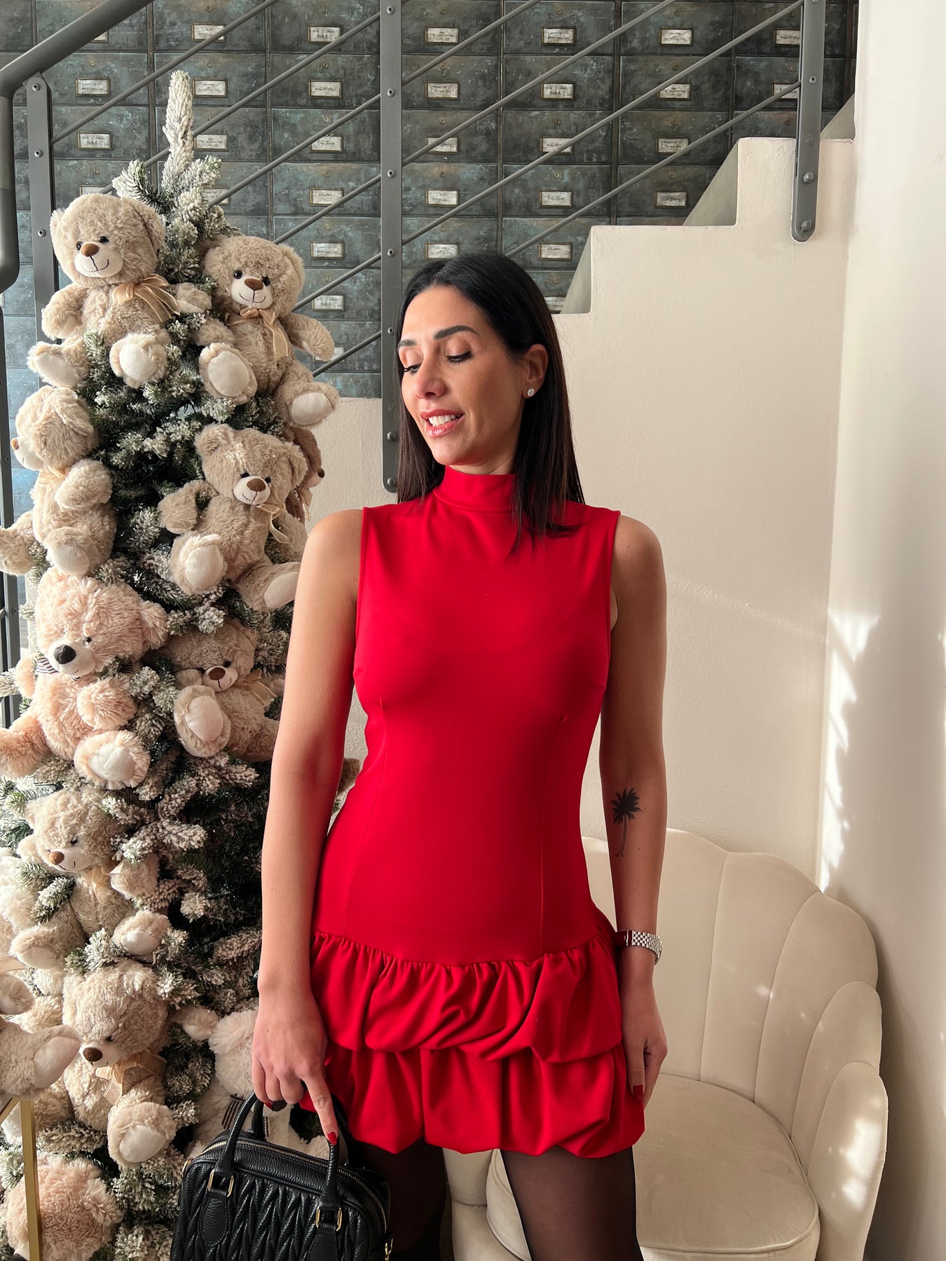 Abito corto in maglia elasticizzato con collo a lupetto e balza finale. Veste dalla 40 alla 44