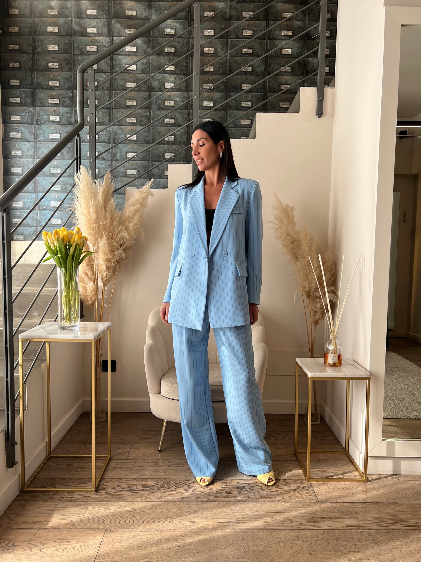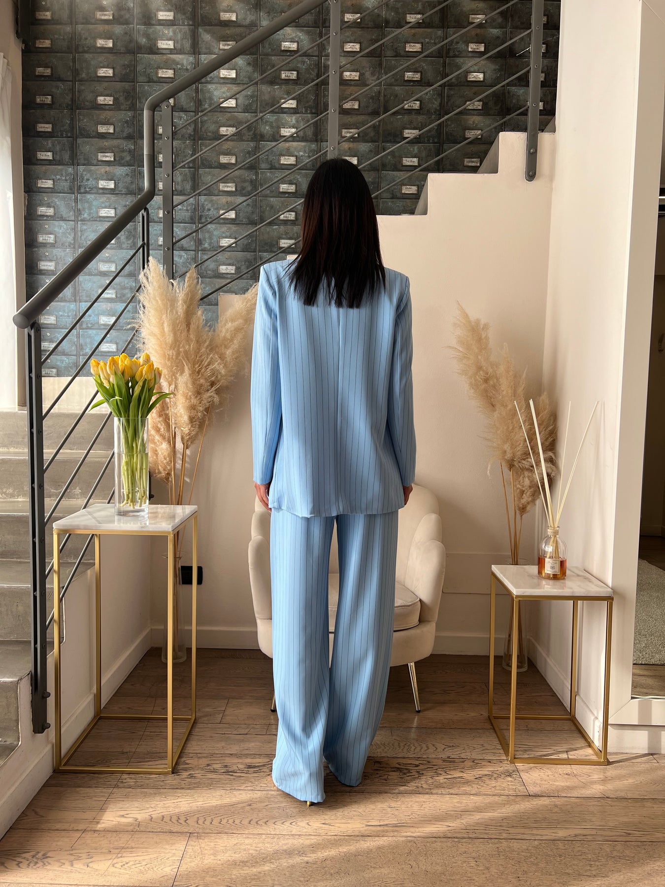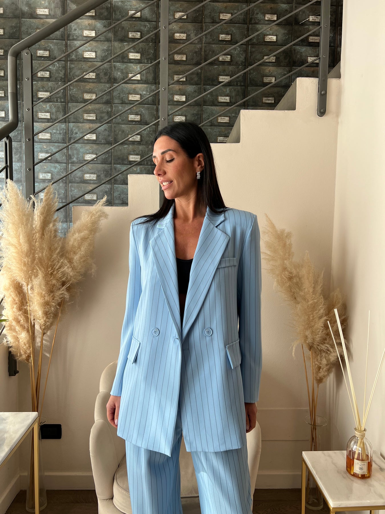 Completo in fantasia gessata dalla vestibilità ampia composto da giacca dritta con chiusura doppiopetto e pantaloni a palazzo con elastico nella parte posteriore della vita. Veste dalla 40 alla 44