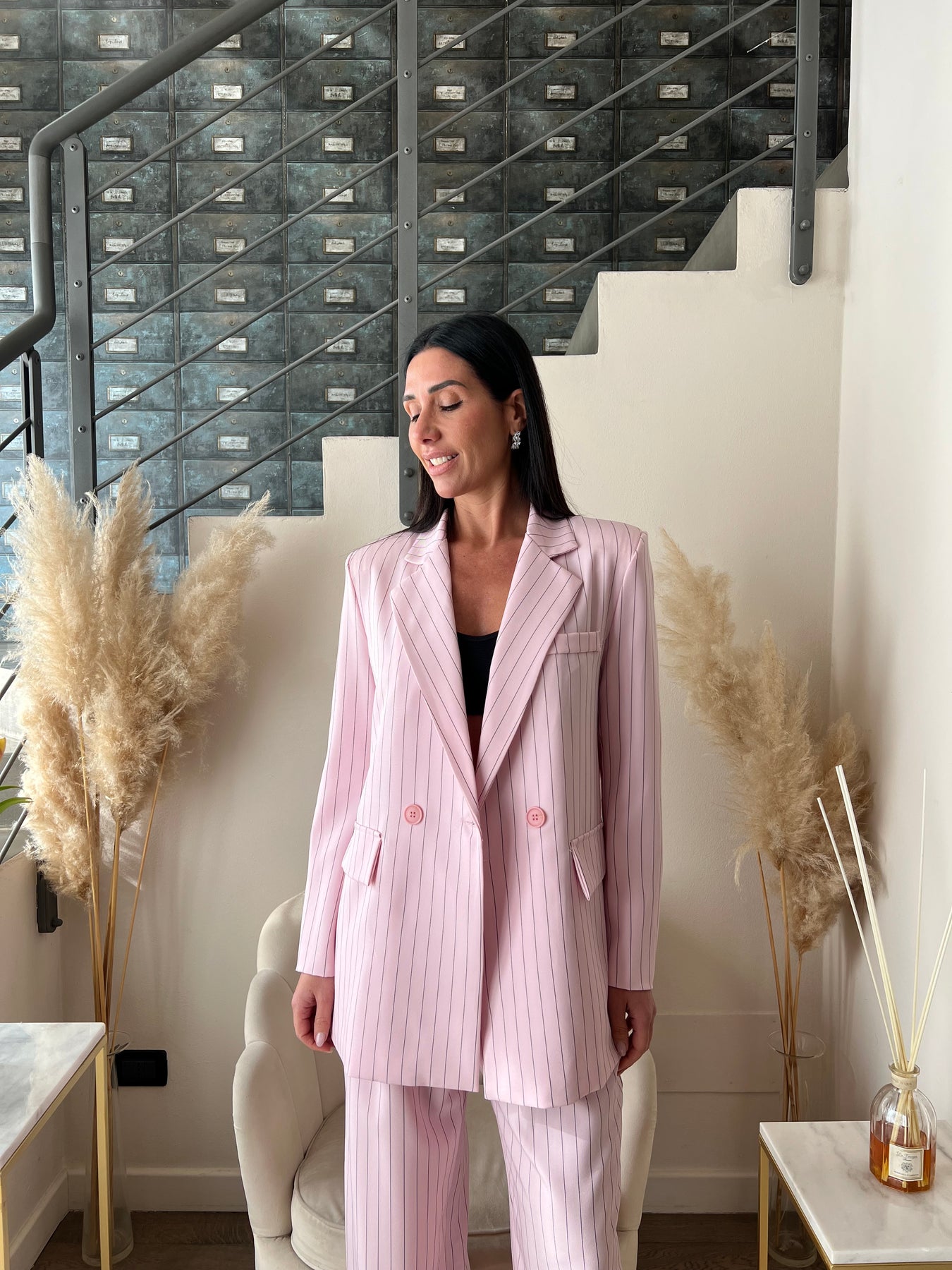 Completo in fantasia gessata dalla vestibilità ampia composto da giacca dritta con chiusura doppiopetto e pantaloni a palazzo con elastico nella parte posteriore della vita. Veste dalla 40 alla 44