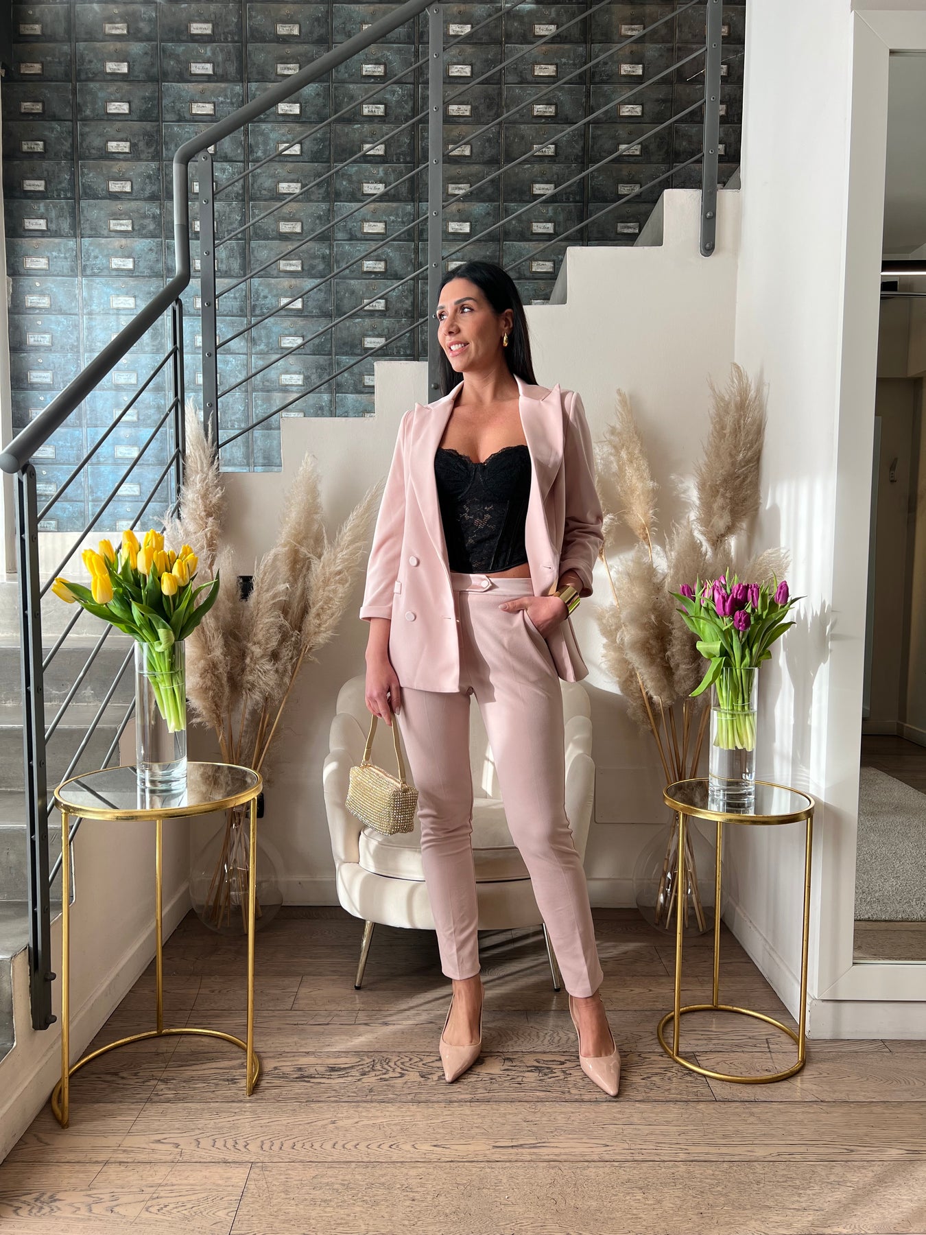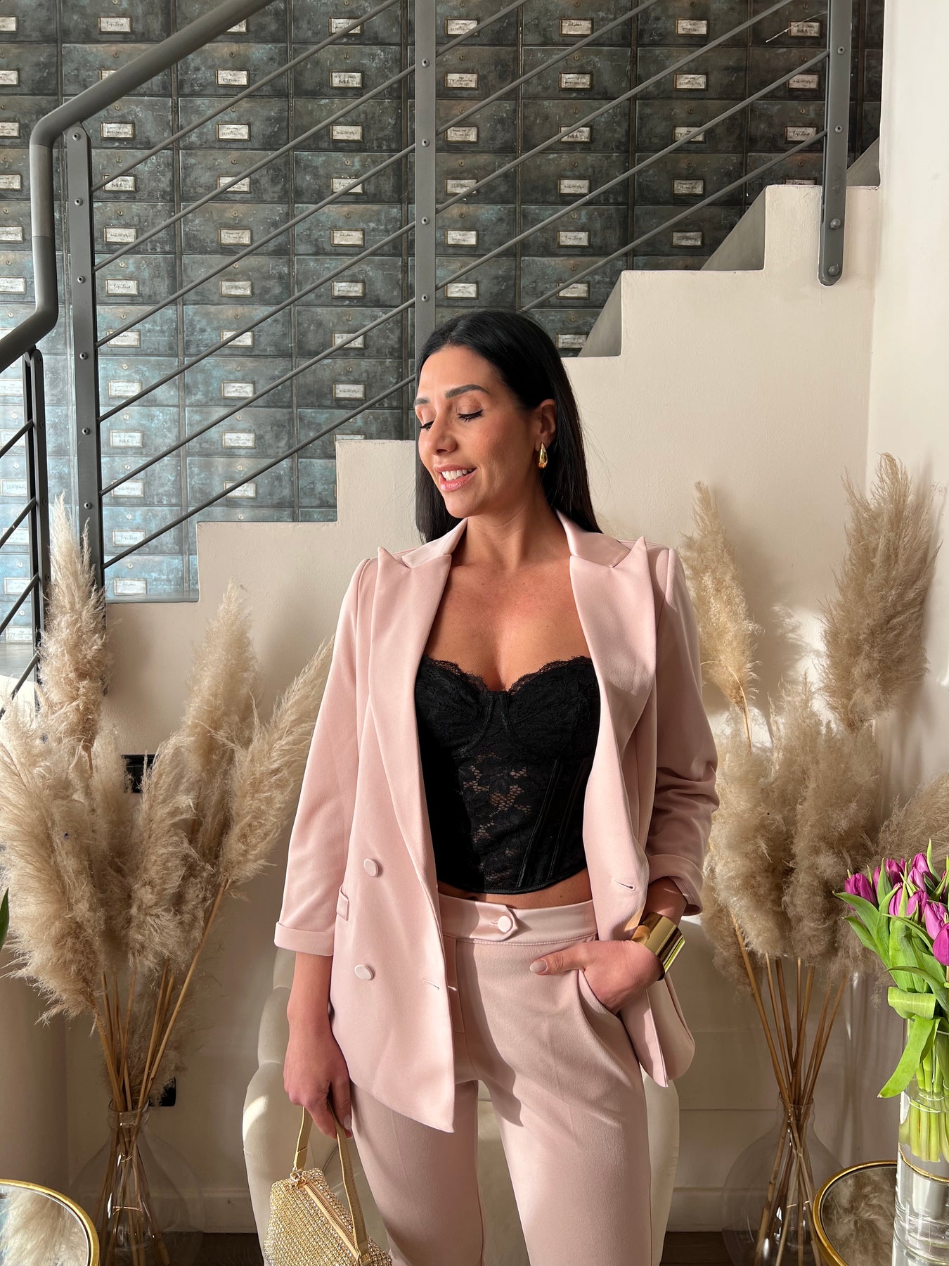 Completo in punto milano leggero elasticizzato composto da giacca doppiopetto e pantaloni a sigaretta con dettagli satin S=40 M=42 L=44