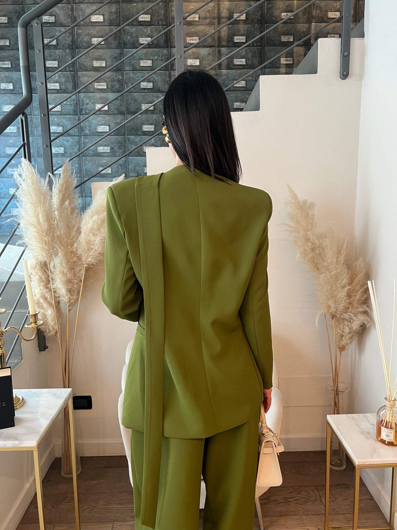 Giacca foderata dalla vestibilità morbida senza collo con sciarpa lunga e chiusura sovrapposta.
