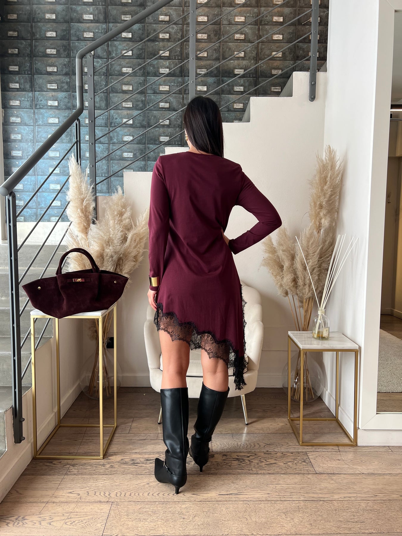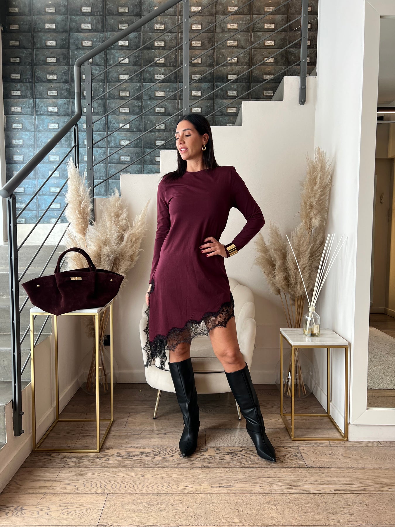 Abito in maglia con spalline dalla modellatura dritta con fondo asimmetrico e bordo in pizzo