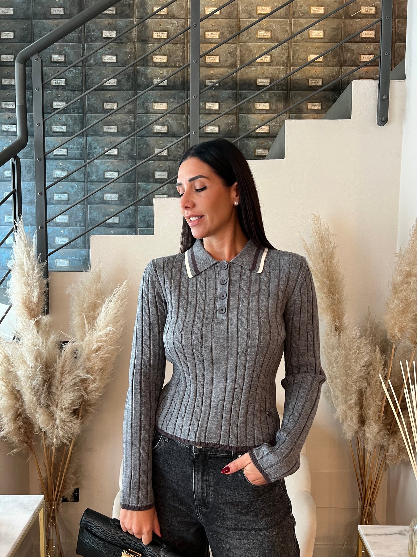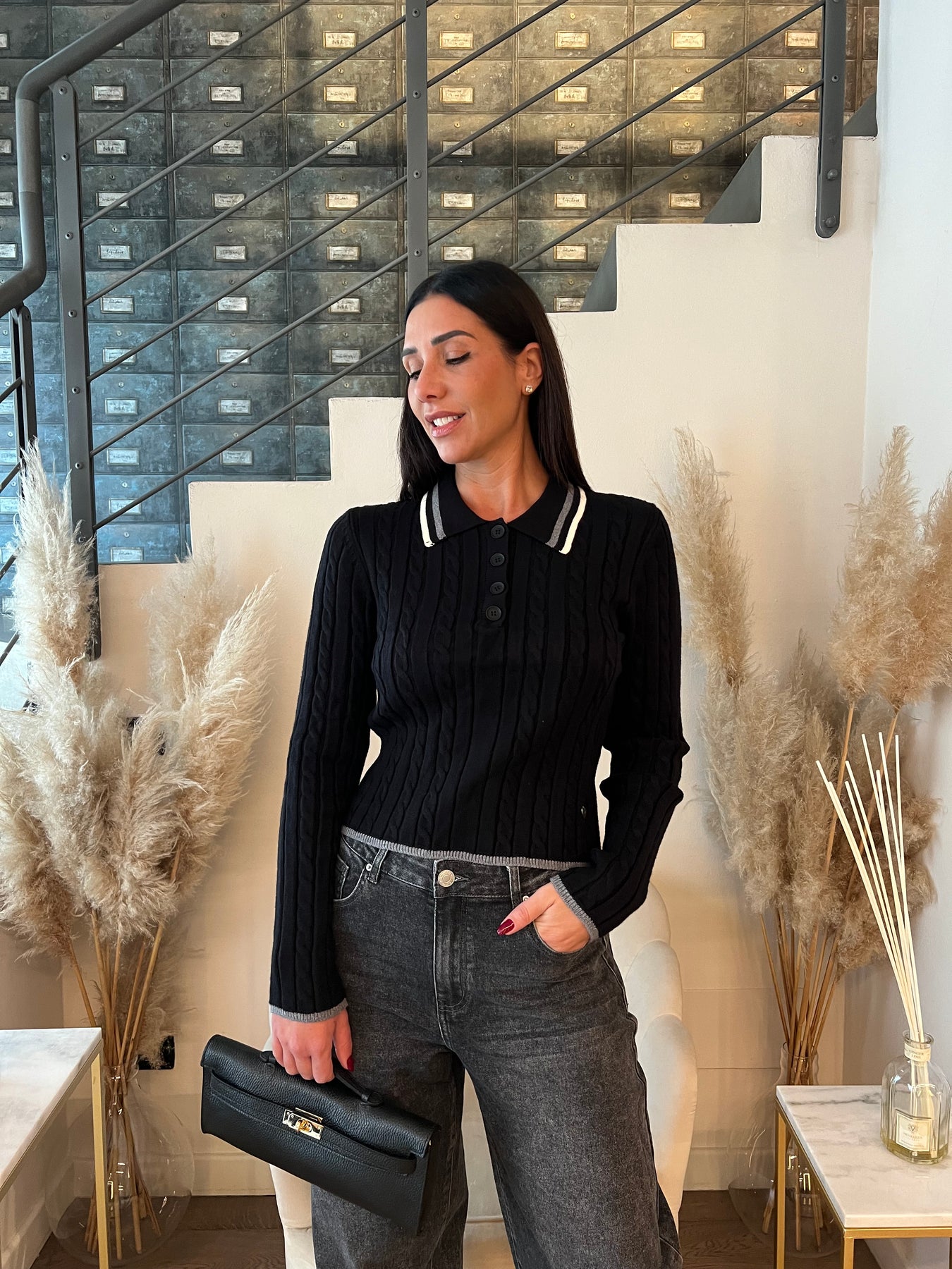 Polo in viscosa elastica con lavorazione a trecce e bordi. Veste dalla 40 alla 44