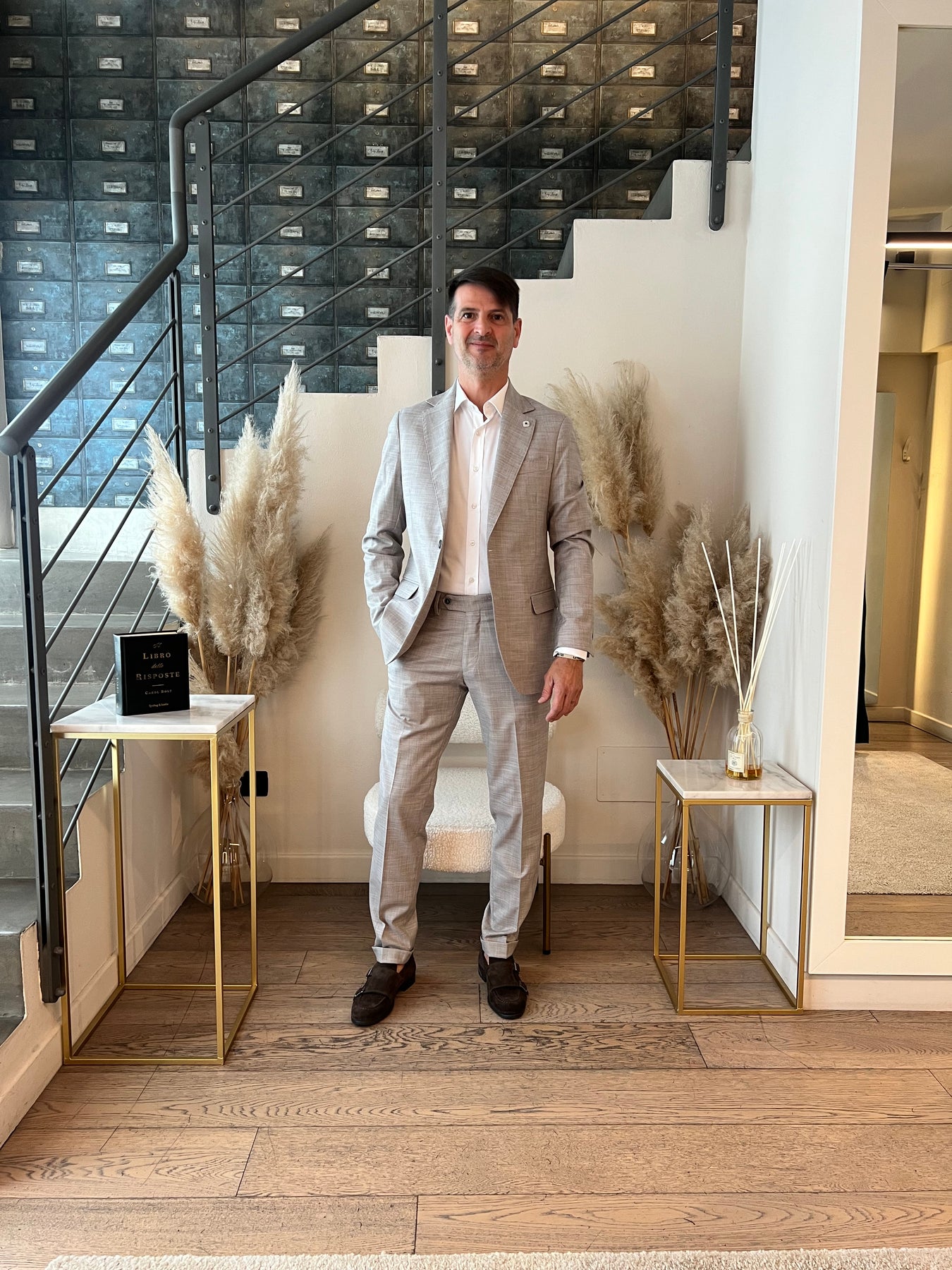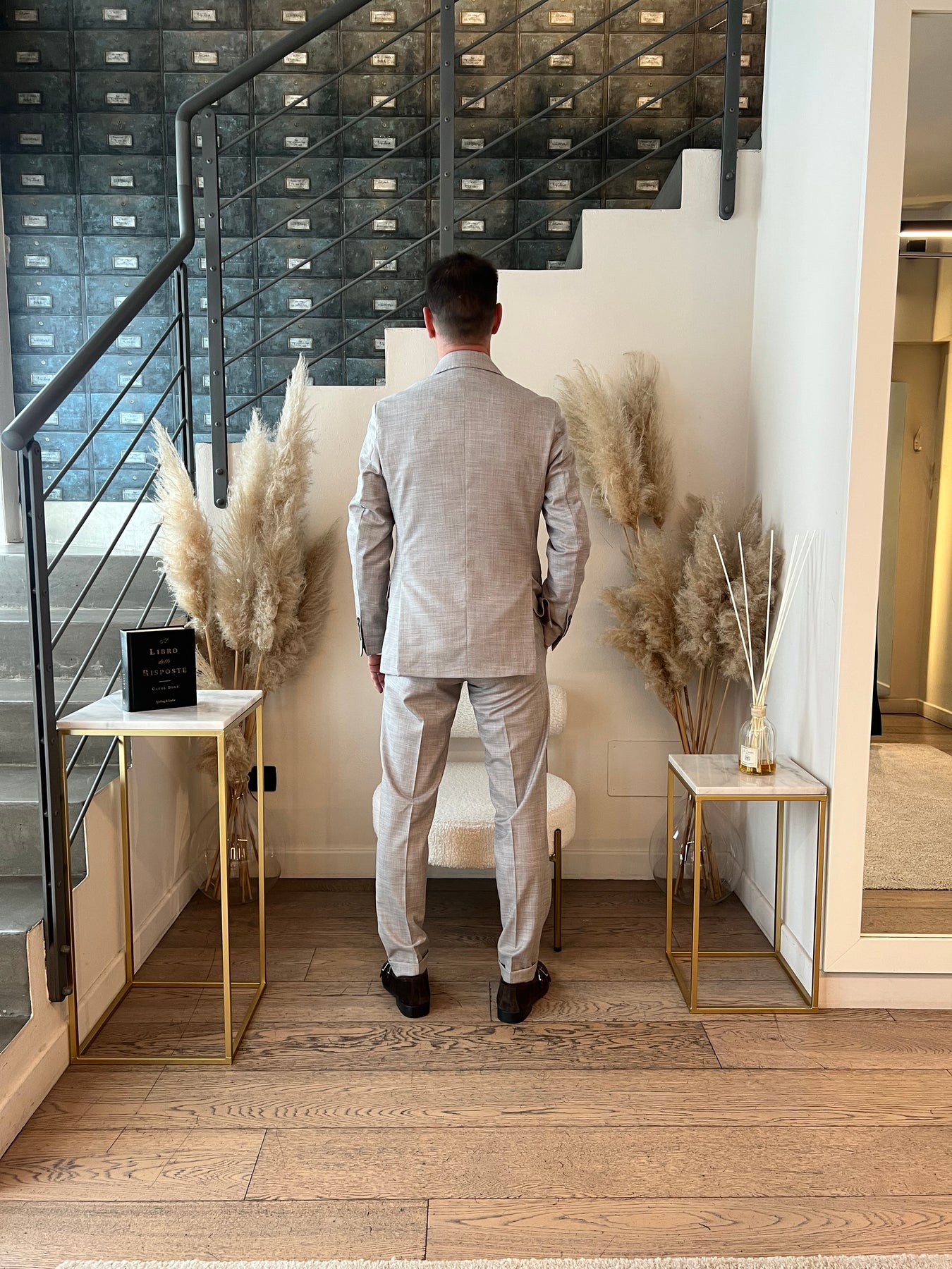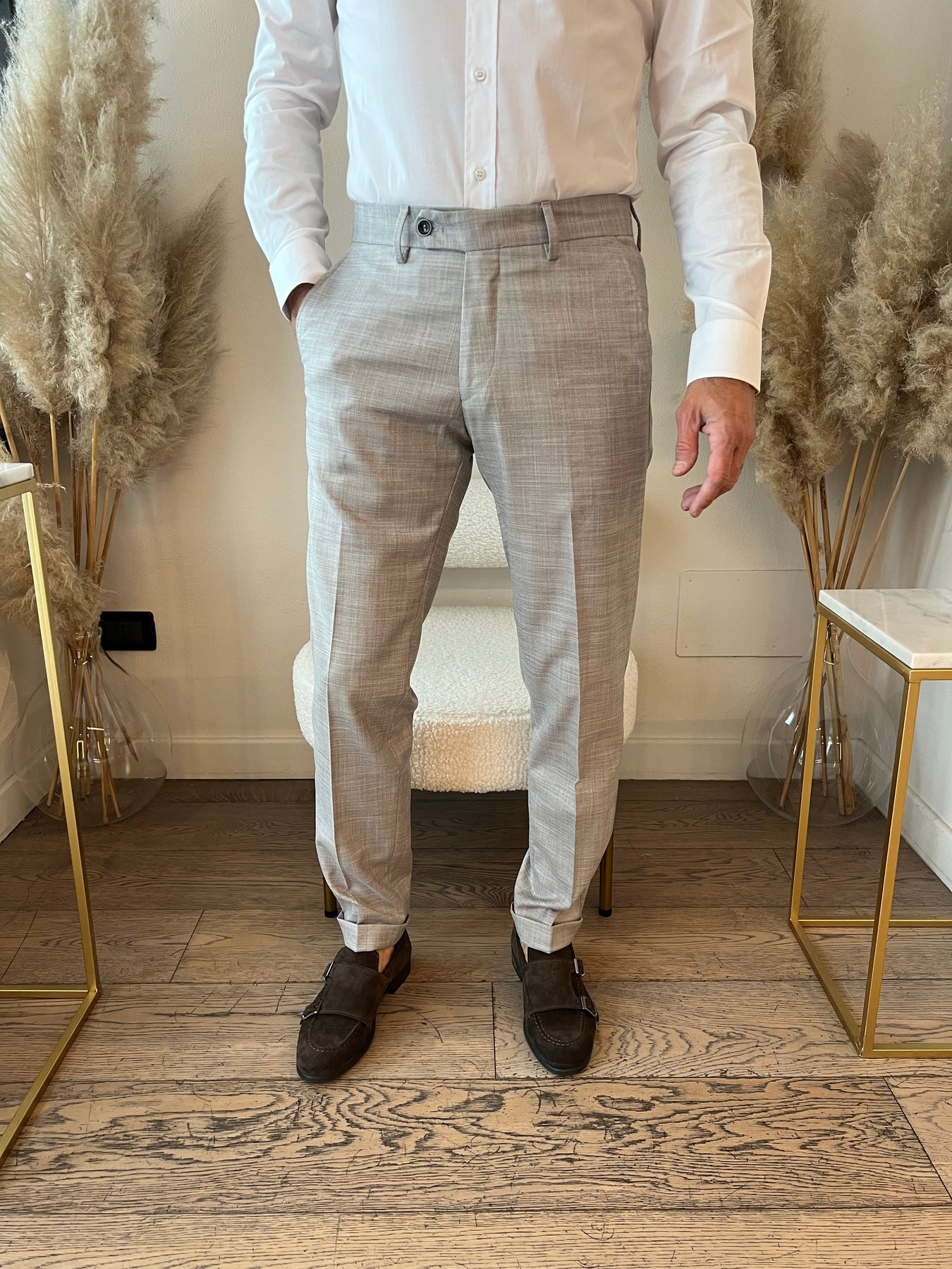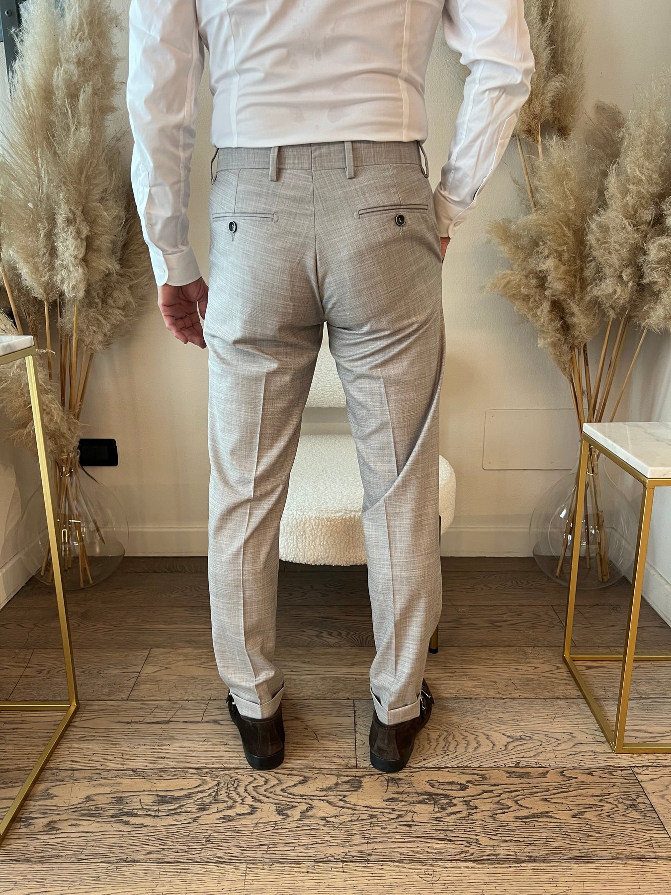 Completo composto da giacca monopetto foderata con doppio spacco e pantaloni slim a vita regolare.