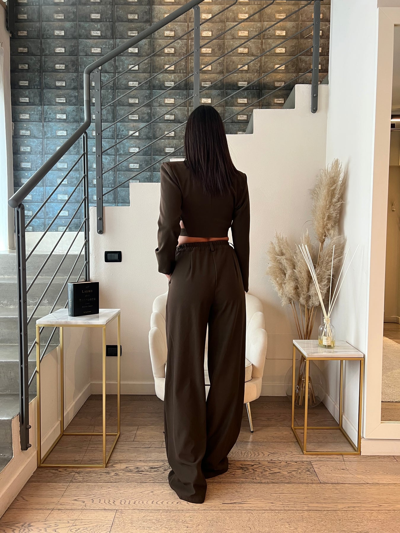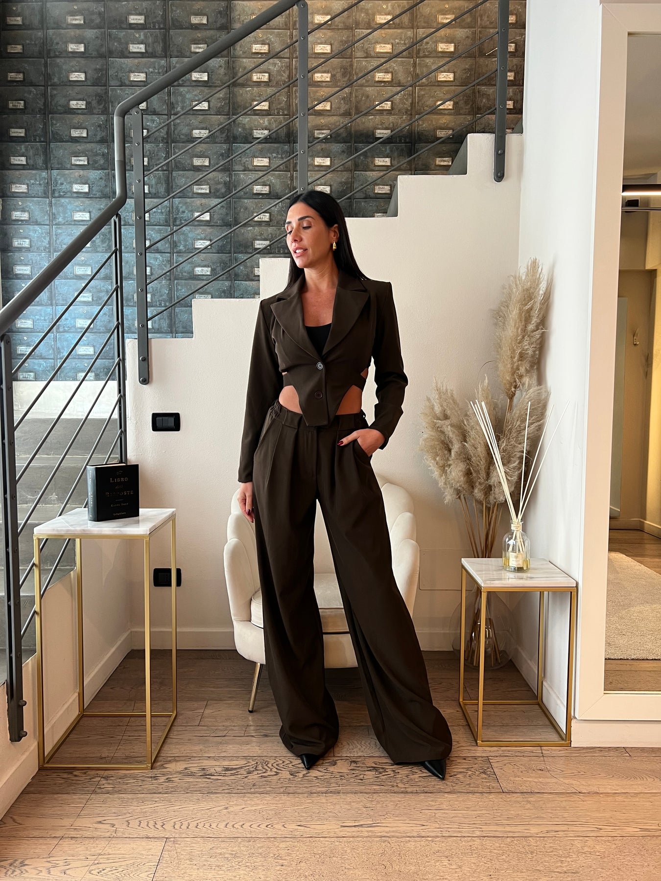 Set coordinato composto da giacca corta con aperture sui lati e pantaloni a palazzo con elastico nella parte posteriore della vita e tasche. Veste dalla 40 alla 44