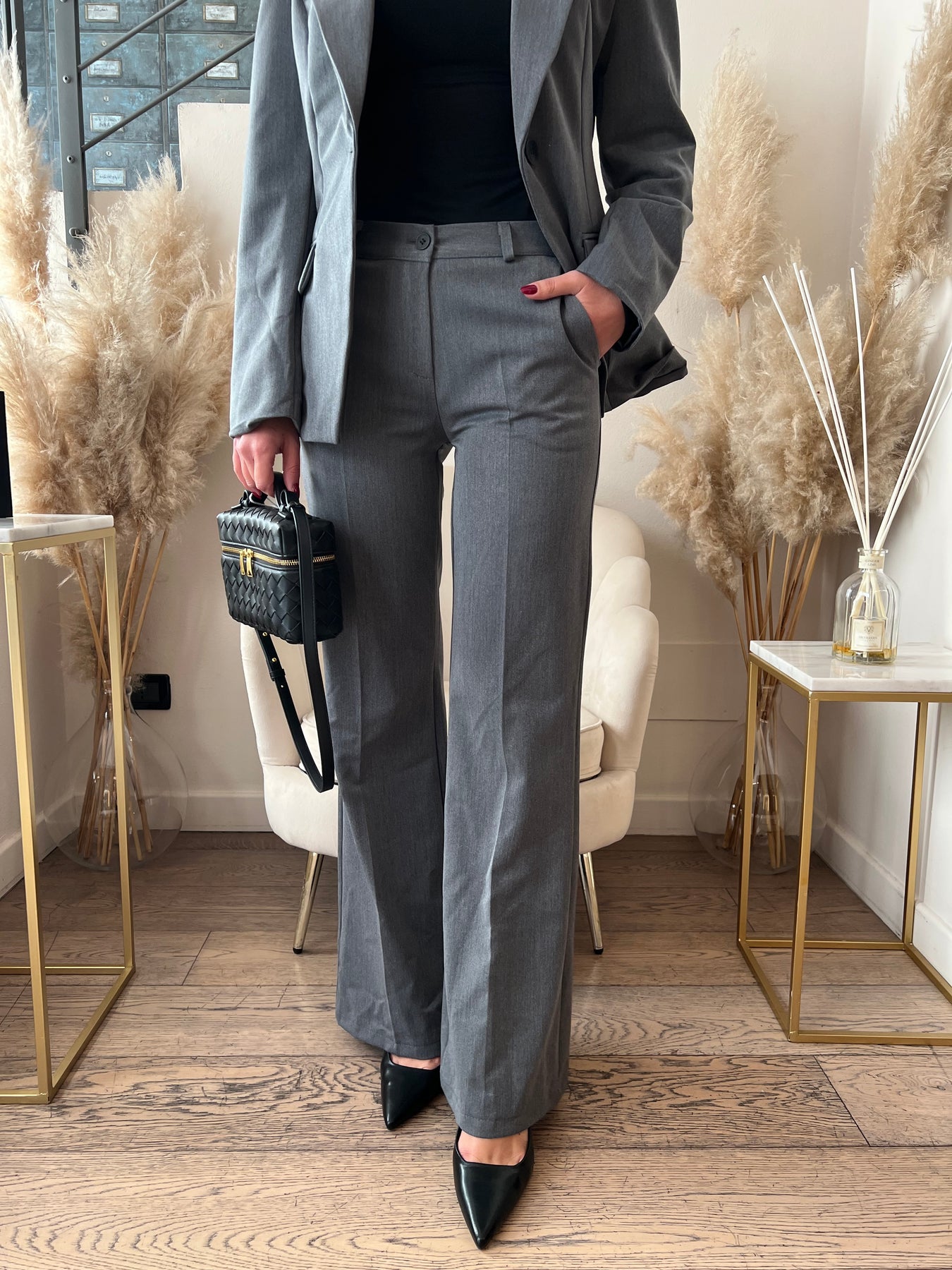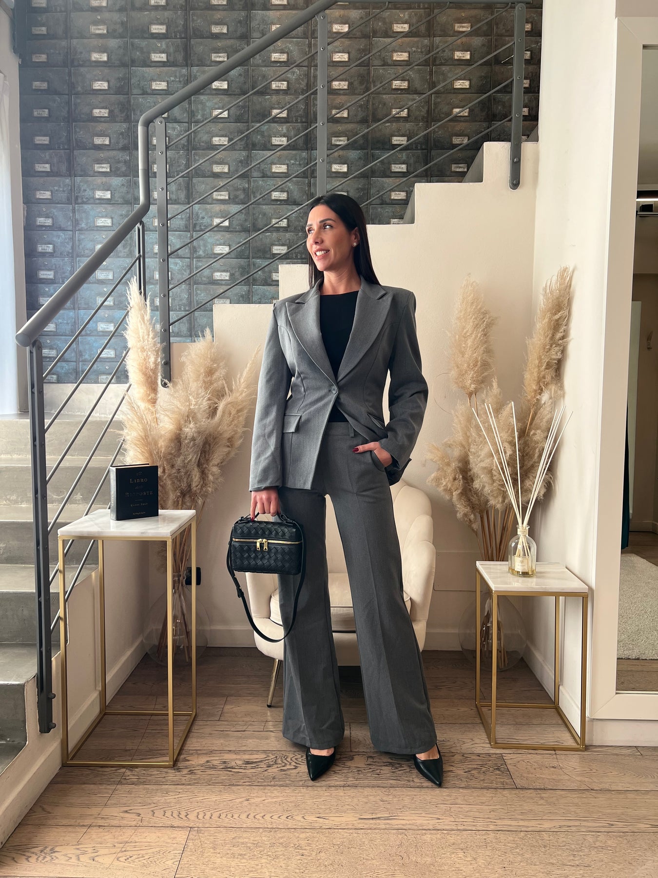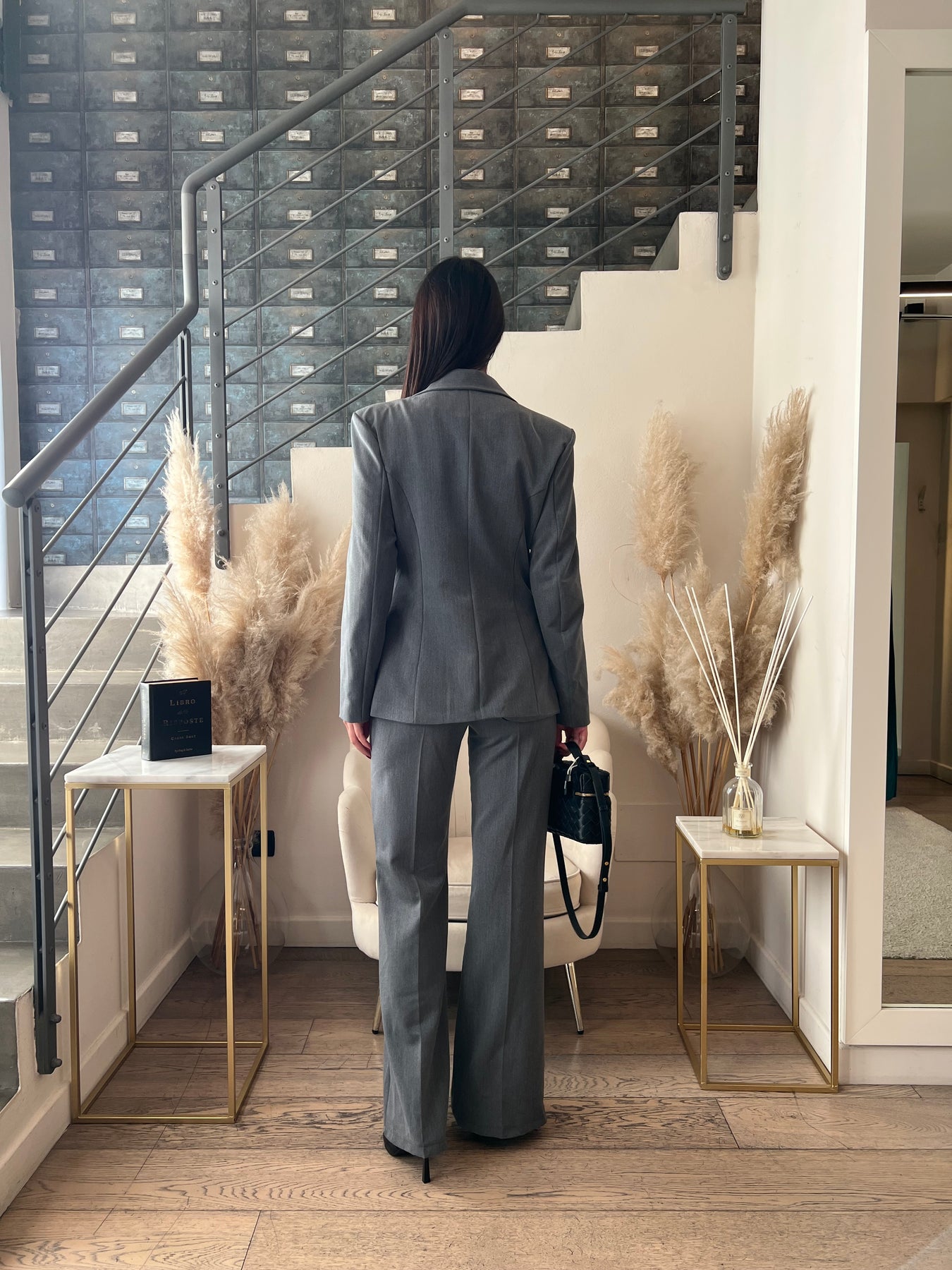 Set coordinato composto da giacca con chiusura monopetto e pantaloni a zampa.