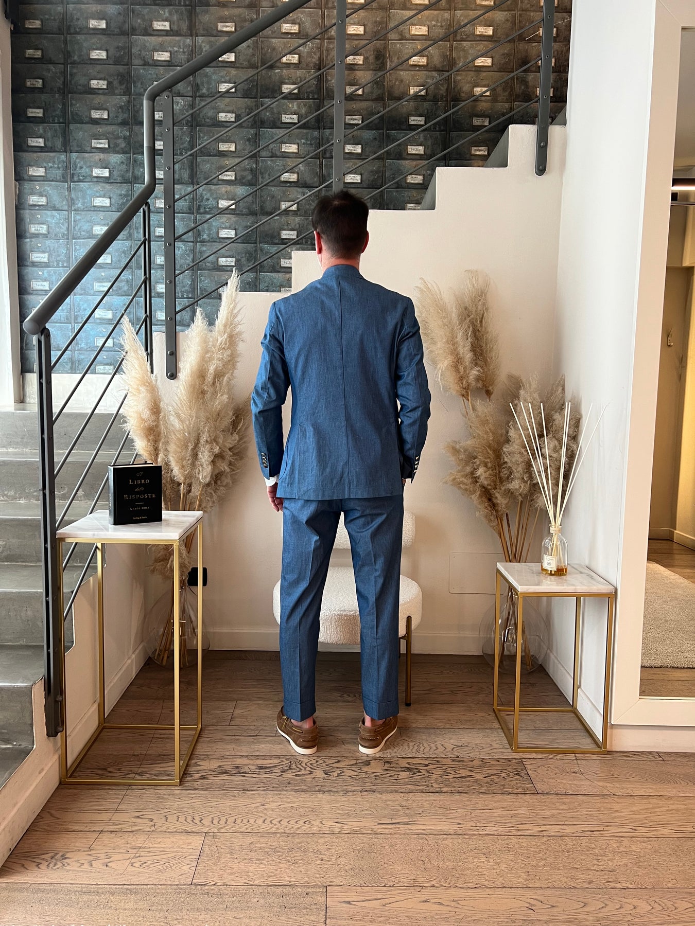 Completo dalla modellatura slim composto da giacca sfoderata con chiusura doppiopetto e pantaloni a vita alta con pinces e fibbia per regolare il punto vita.