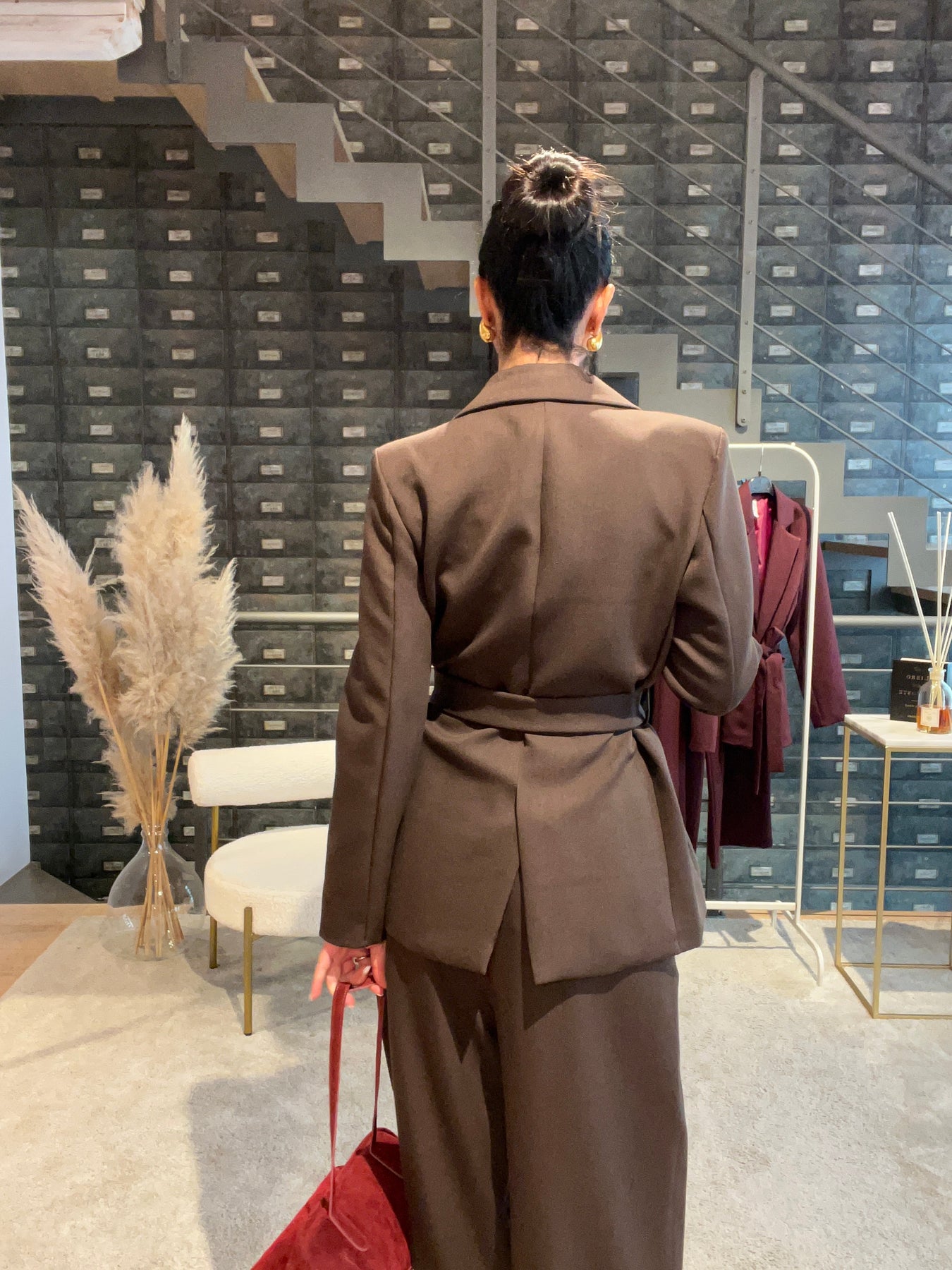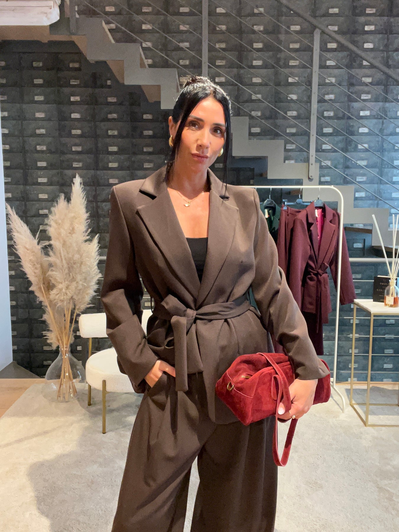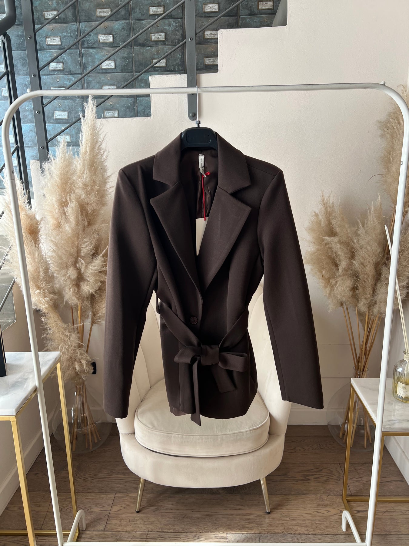 Giacca in tessuto corposo foderata con cintura per segnare il punto vita.