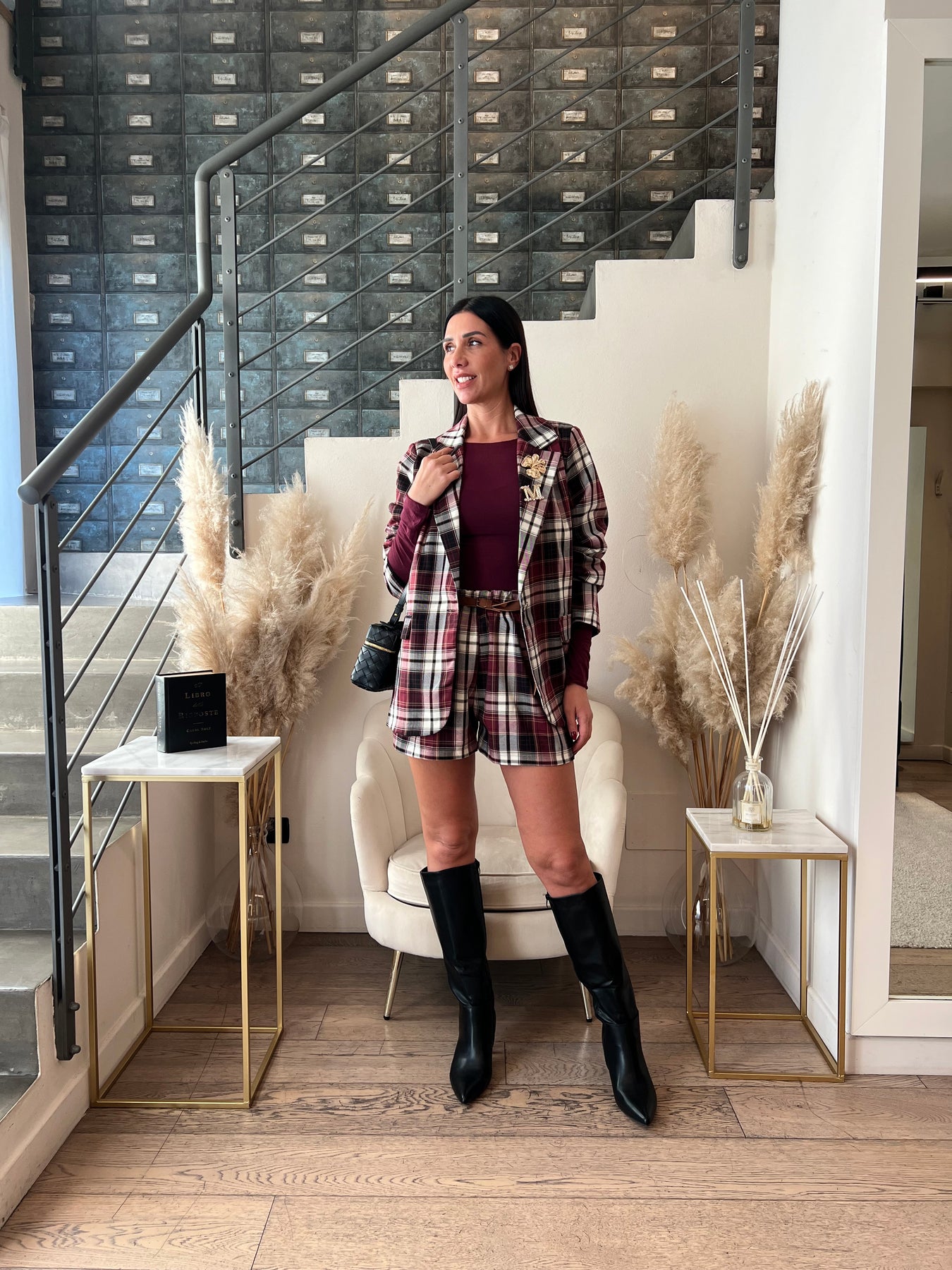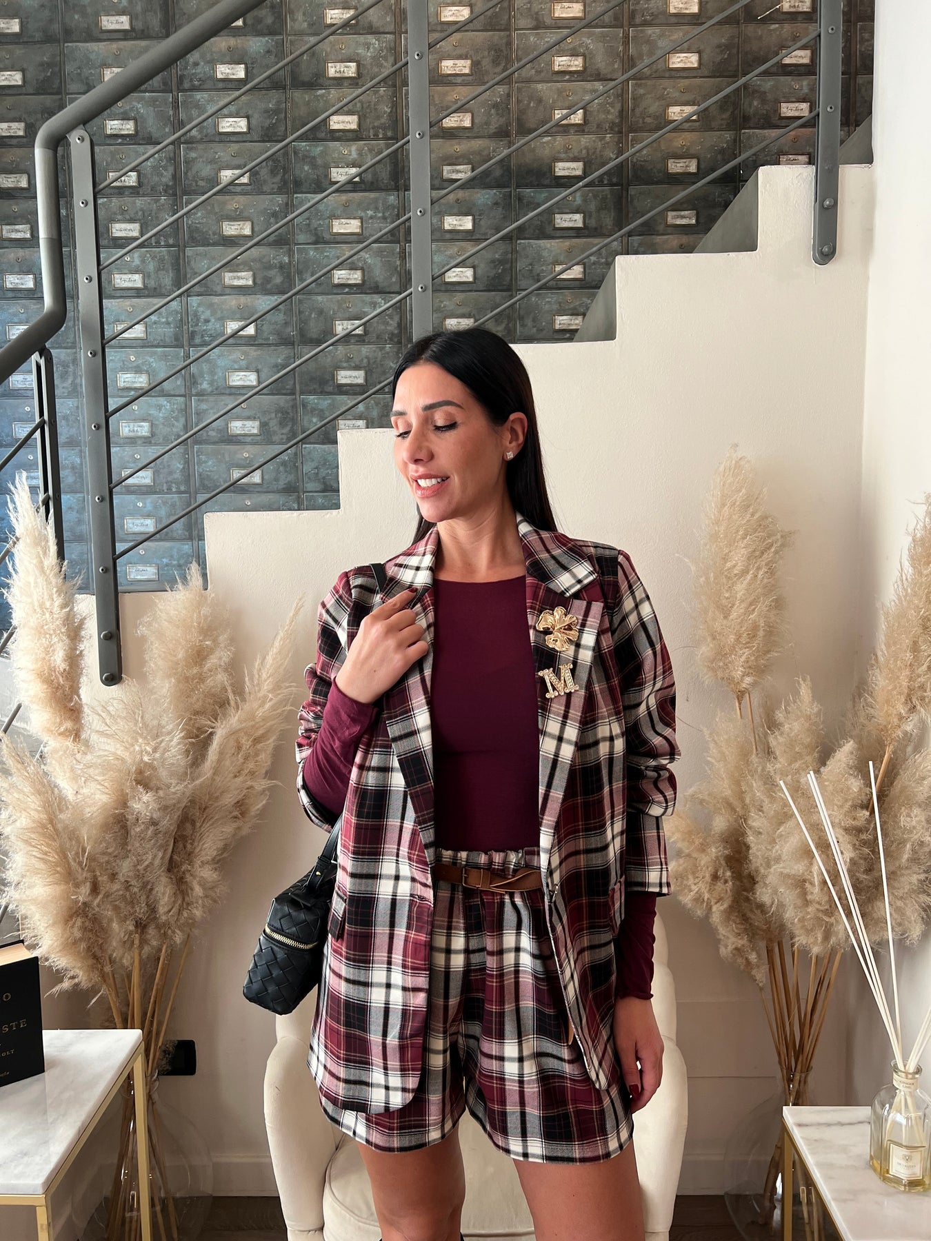 Set coordinato composto da giacca in fantasia scozzese e shorts. Veste dalla 40 alla 44