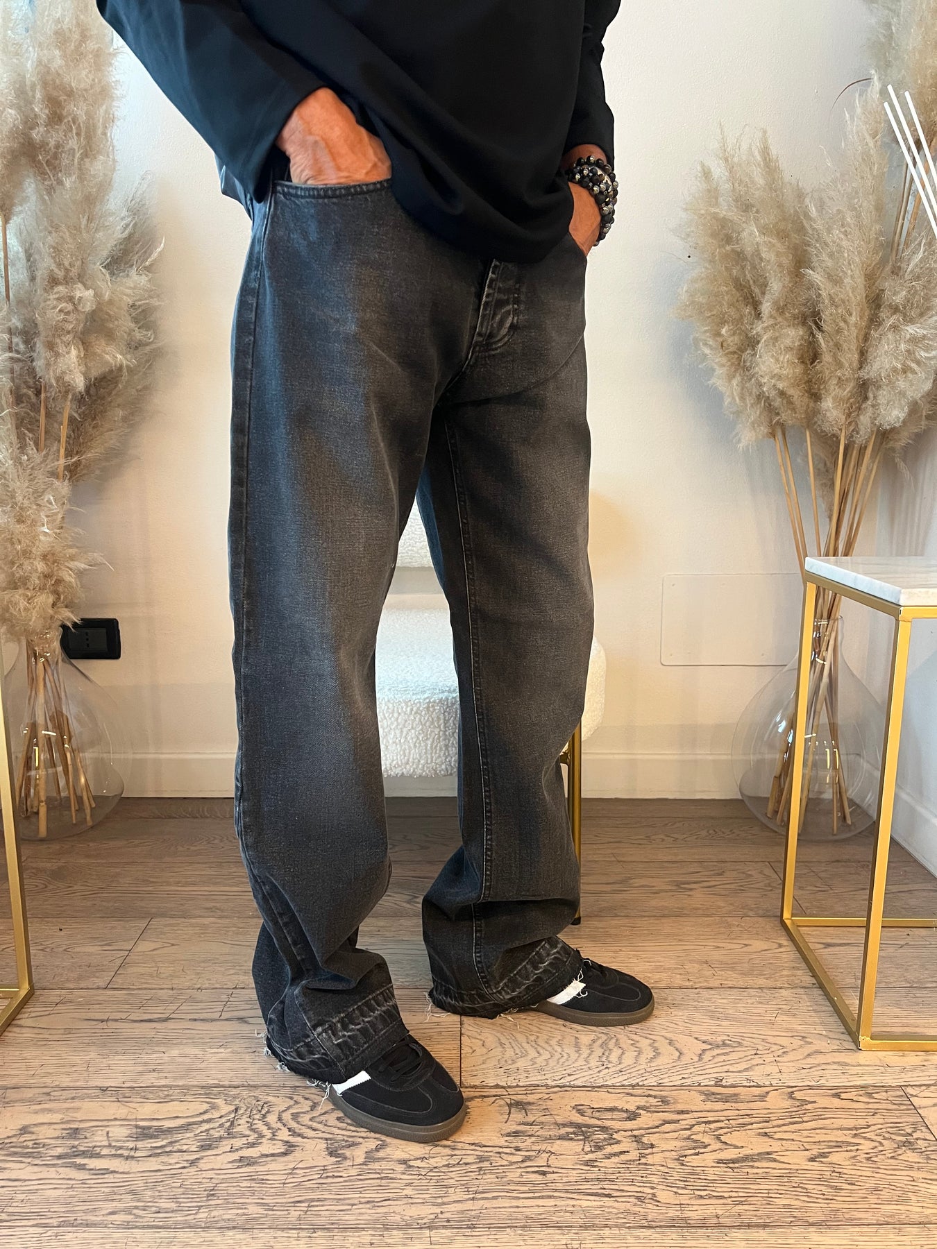 Jeans grigio con gamba dritta morbida e orlo sfrangiato.