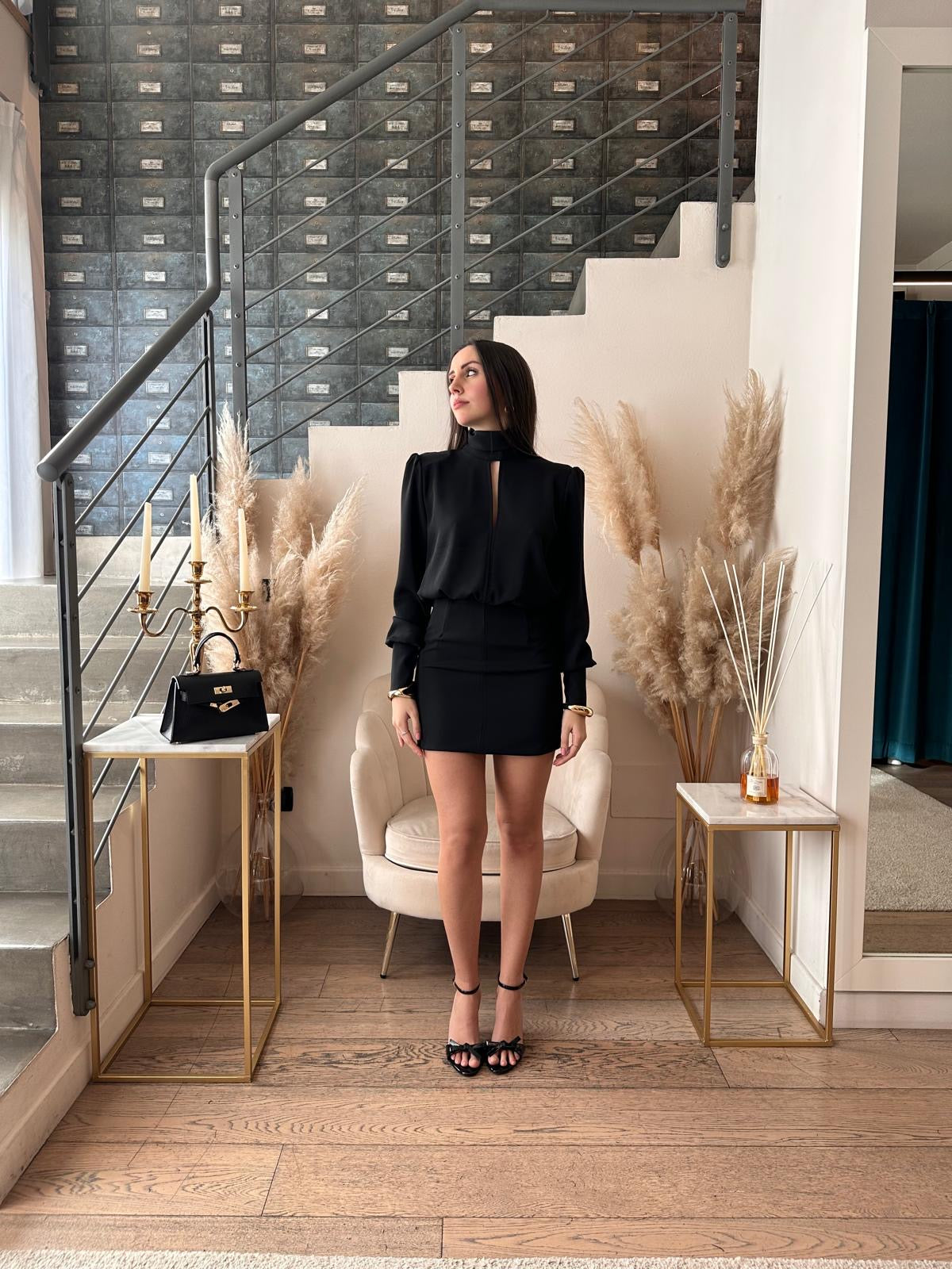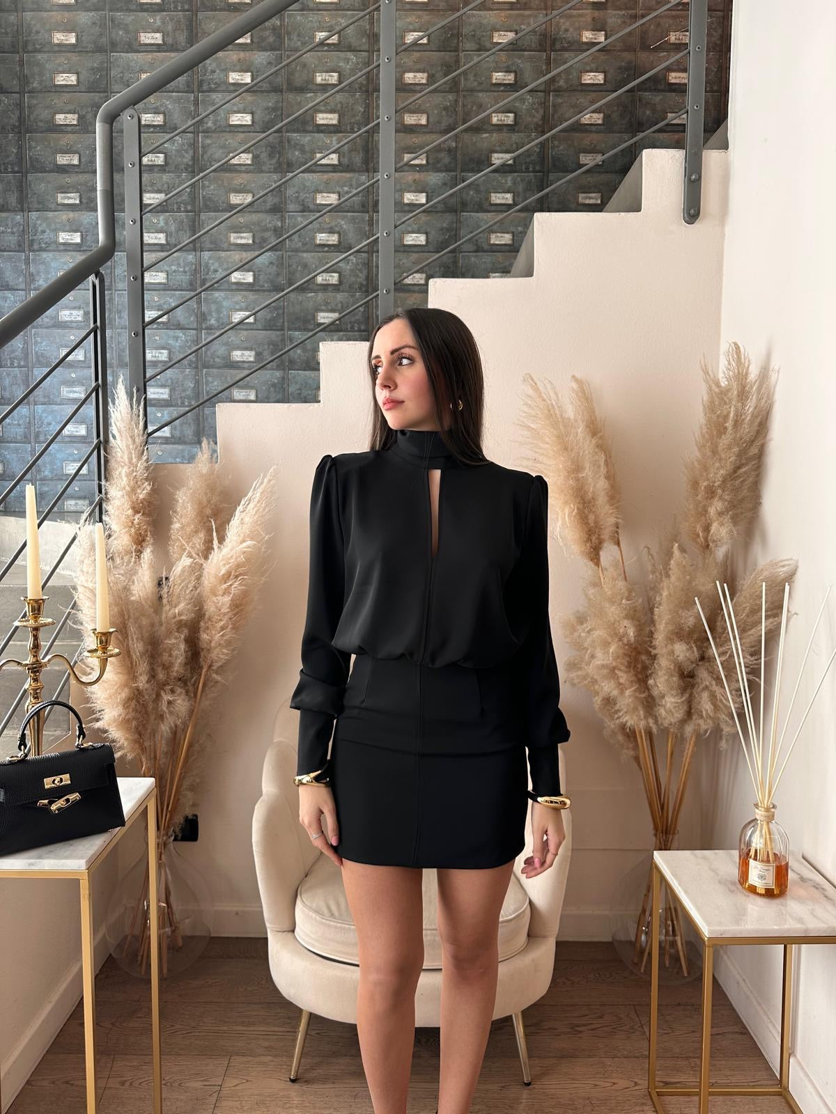 Abito corto con top morbido aperto nella schiena e gonna stretta.