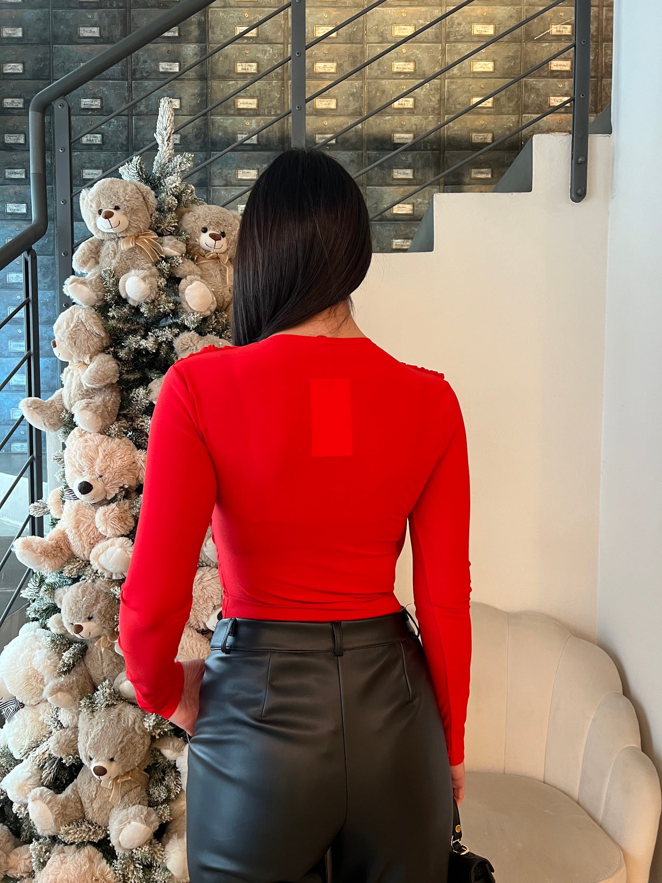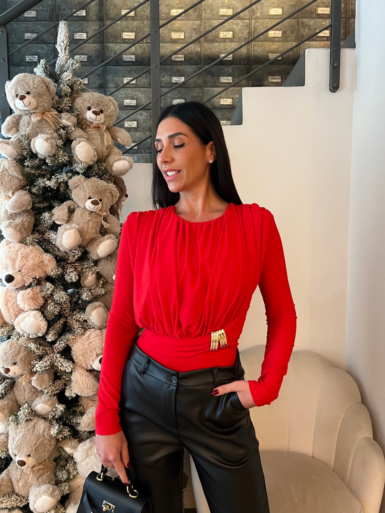 Body elasticizzato a maniche lunghe con drappeggio e dettaglio gamcio metallico. Veste dalla 40 alla 44