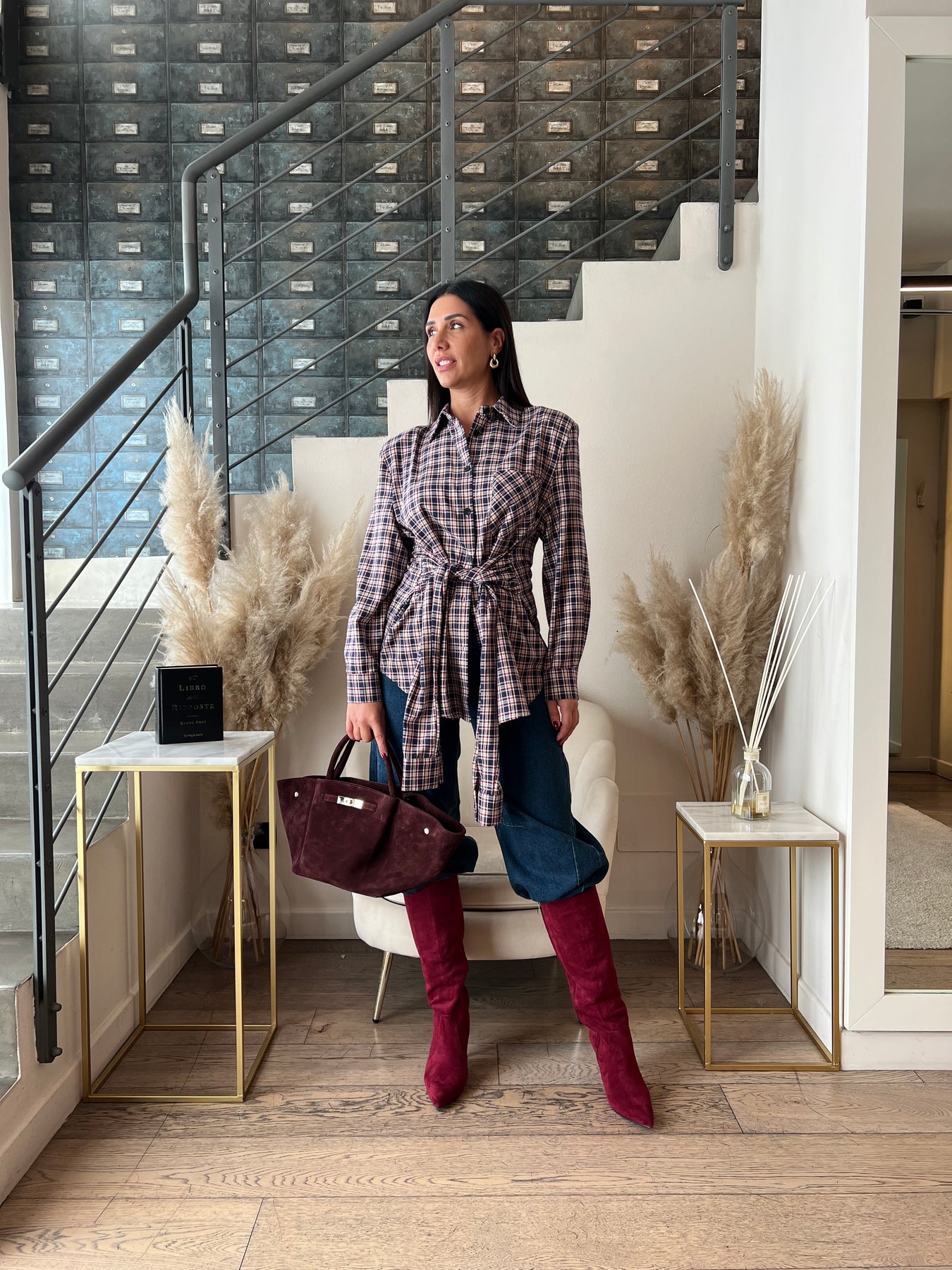 Camicia lunga in fantasia scozzese con spalline e dettaglio finte maniche applicate da annodare in vita.