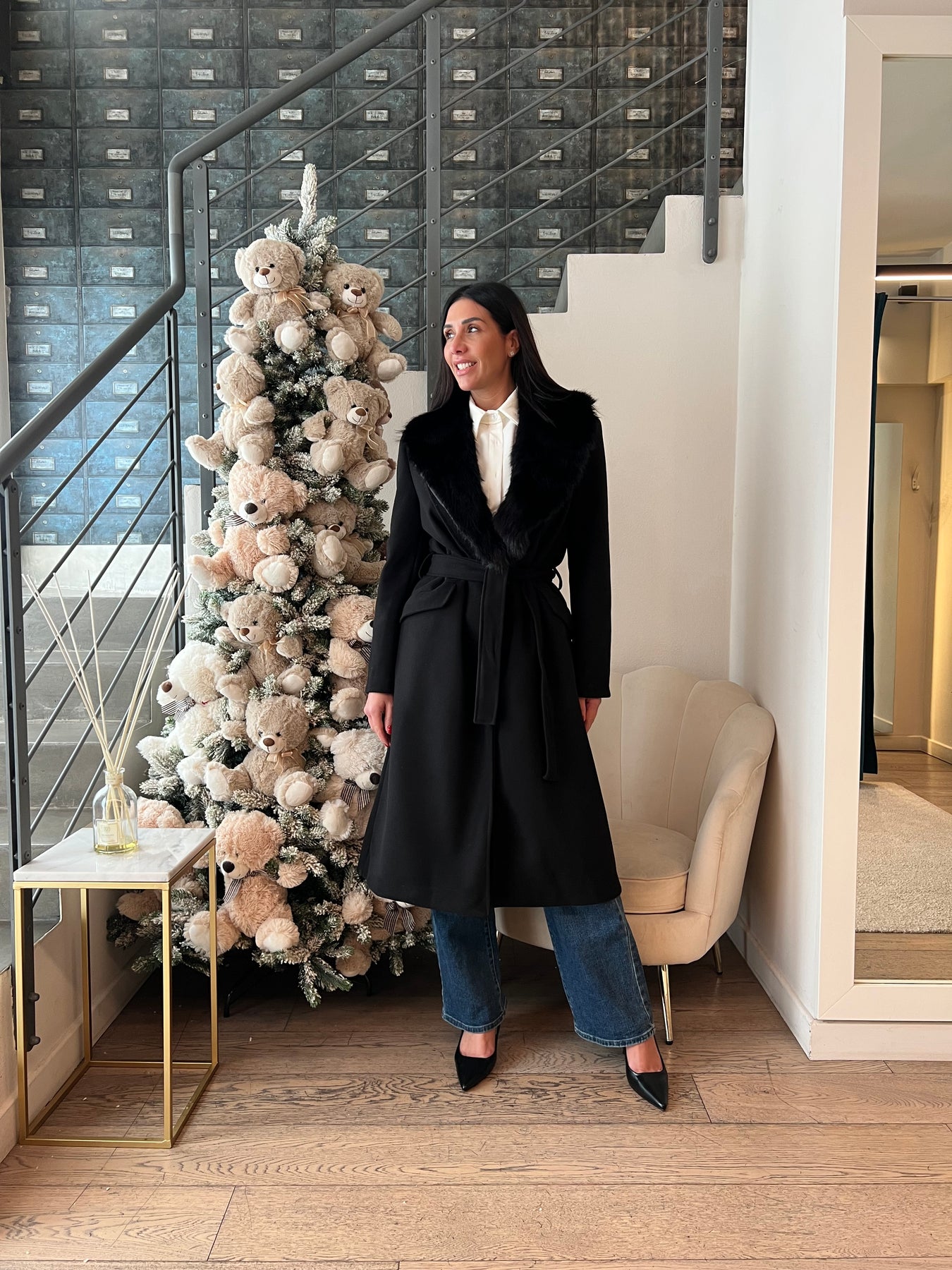 Cappotto lungo foderato dalla modellatura dritta con cintura per segnare il punto vita e collo in ecopelliccia staccabile. Veste dalla 40 alla 44