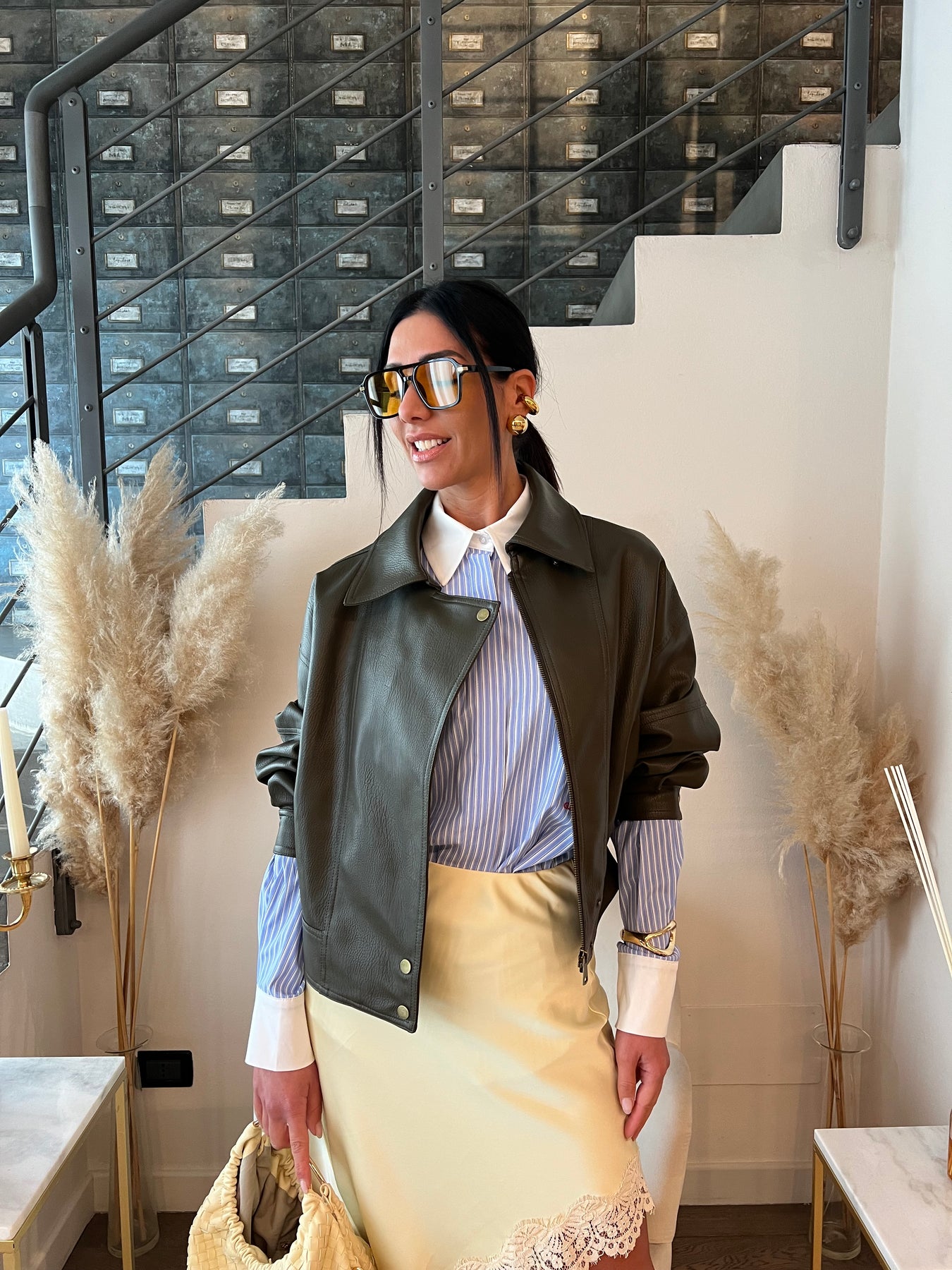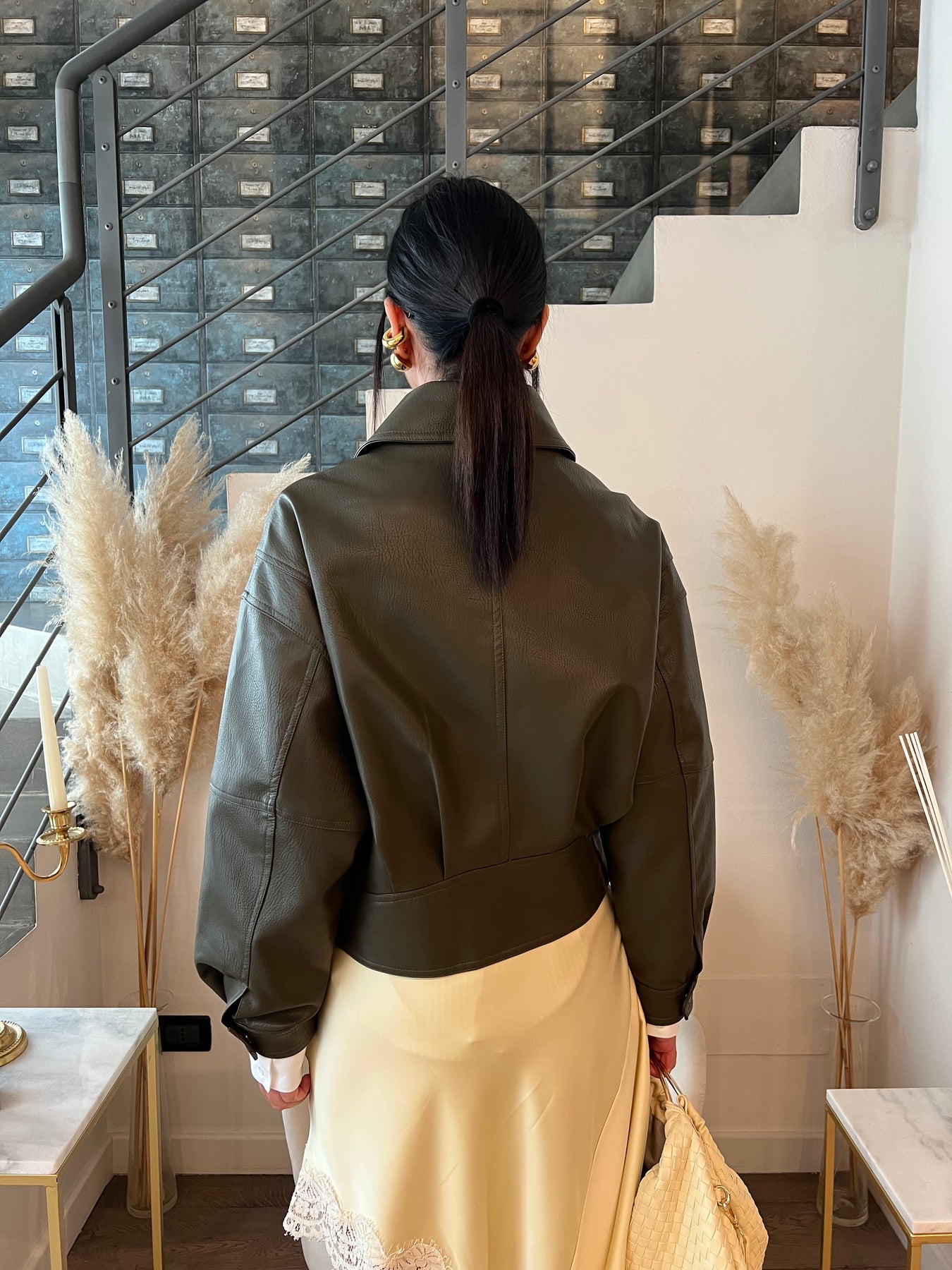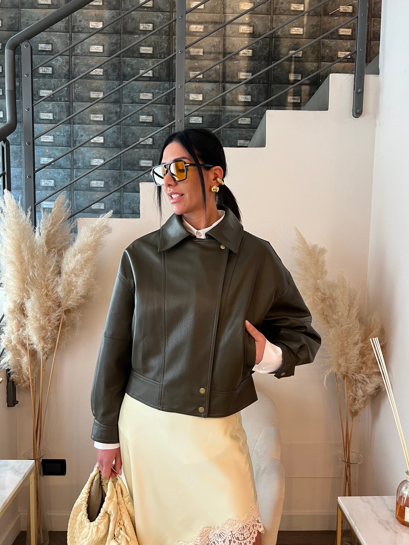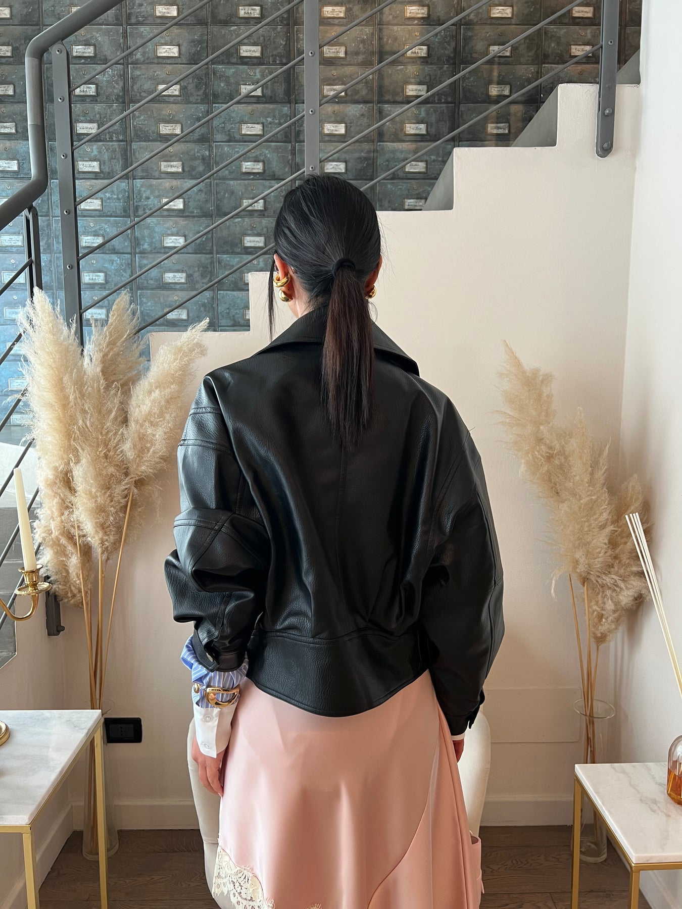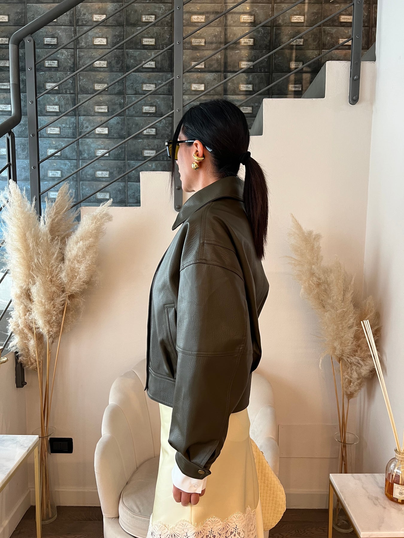 Bomber in ecopelle dalla vestibilità ampia con fondo più stretto. Chiusura con zip. Veste dalla 40 alla 44