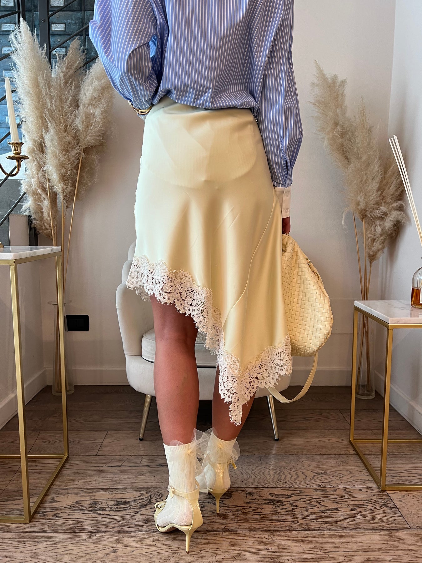 Gonna satin asimmetria con bordo in pizzo. Elastico in vita. Veste dalla 40 alla 44