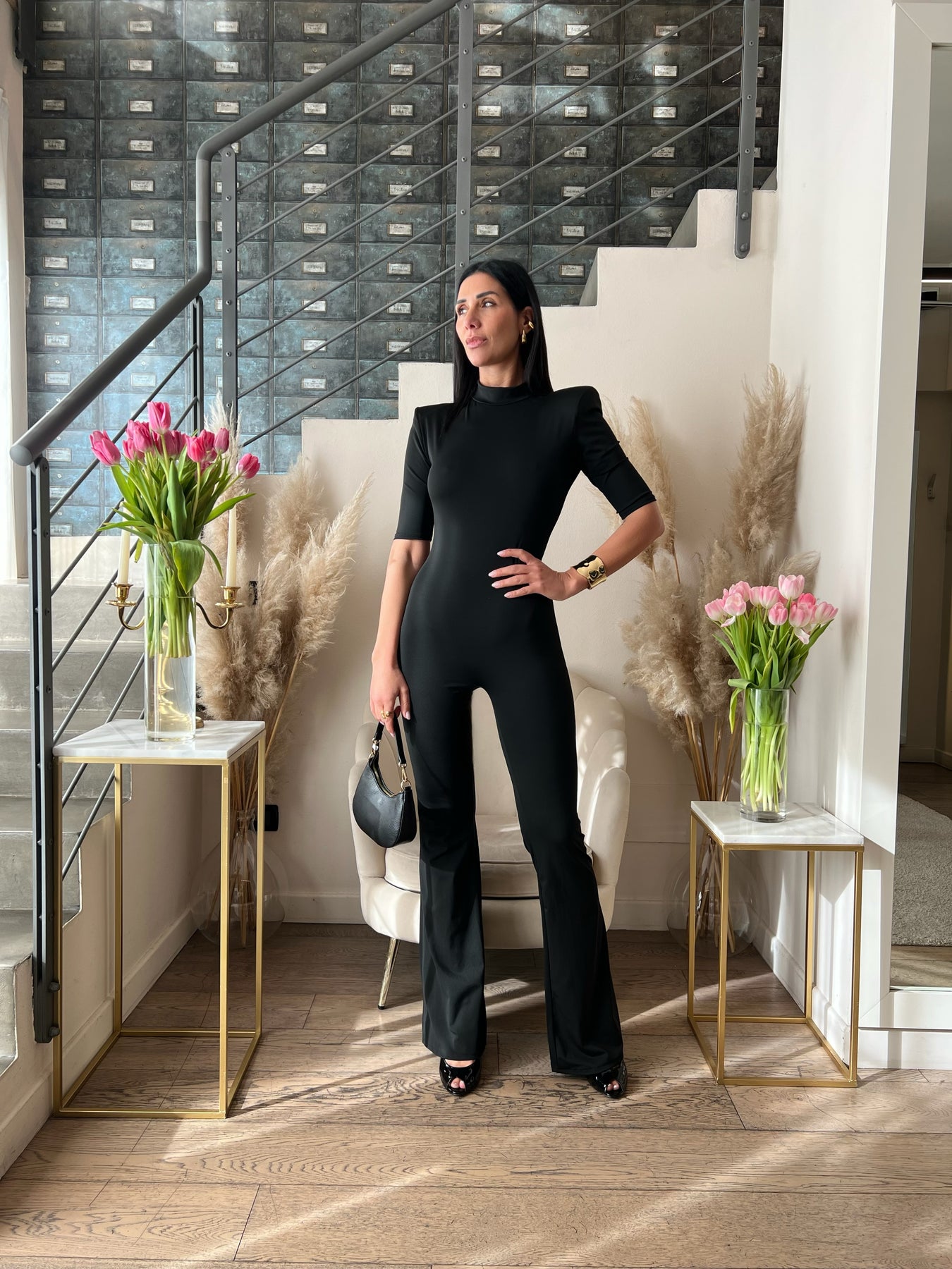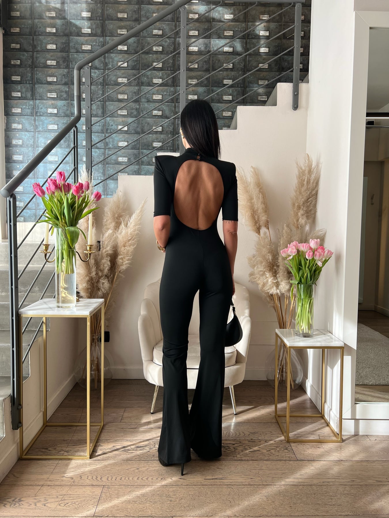 Tuta lunga con spalline, maniche al gomito, apertura nella schiena e pantaloni a zampa. Veste dalla 40 alla 44