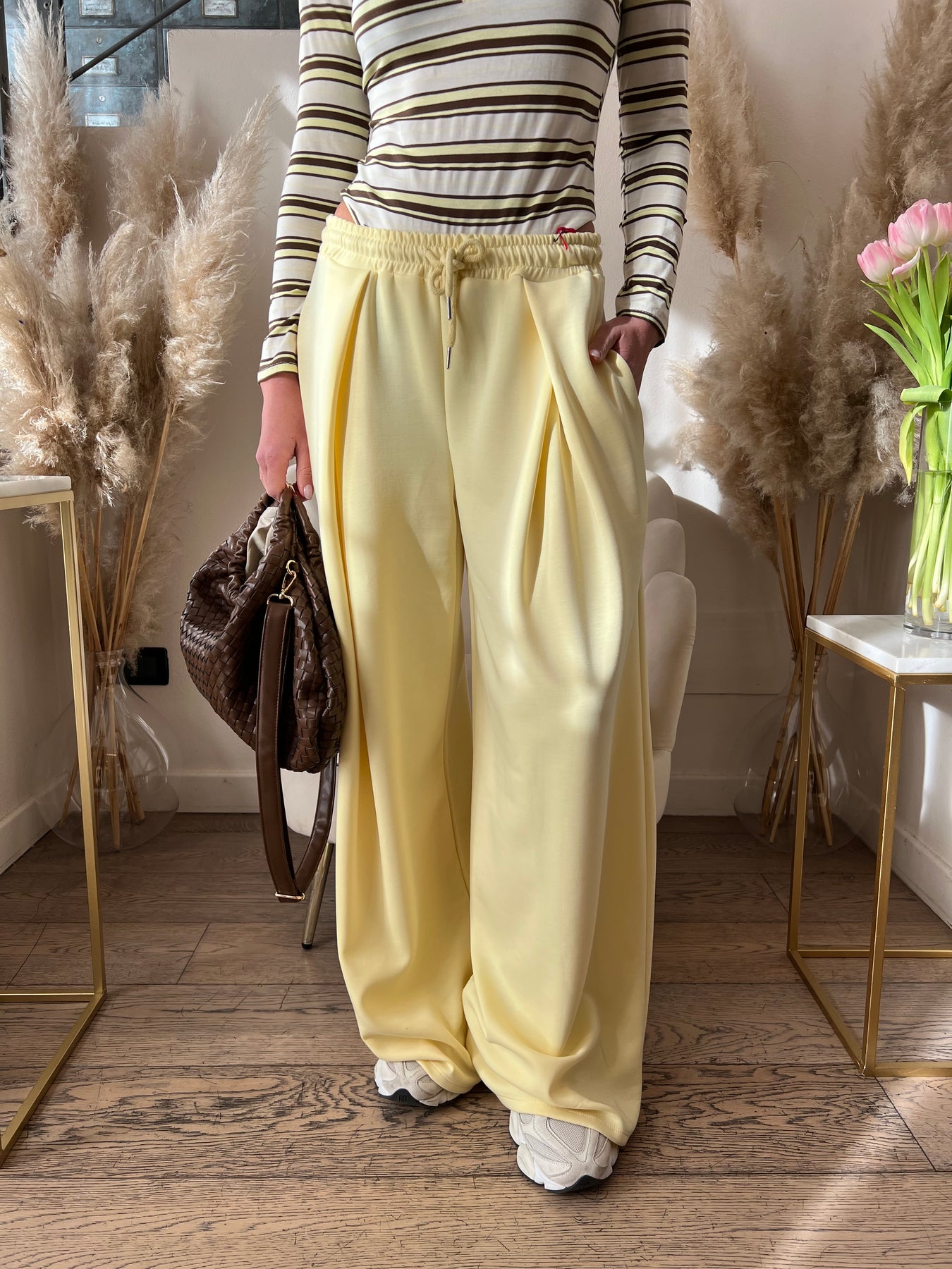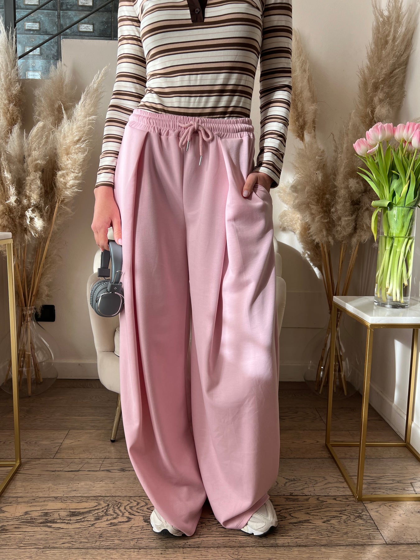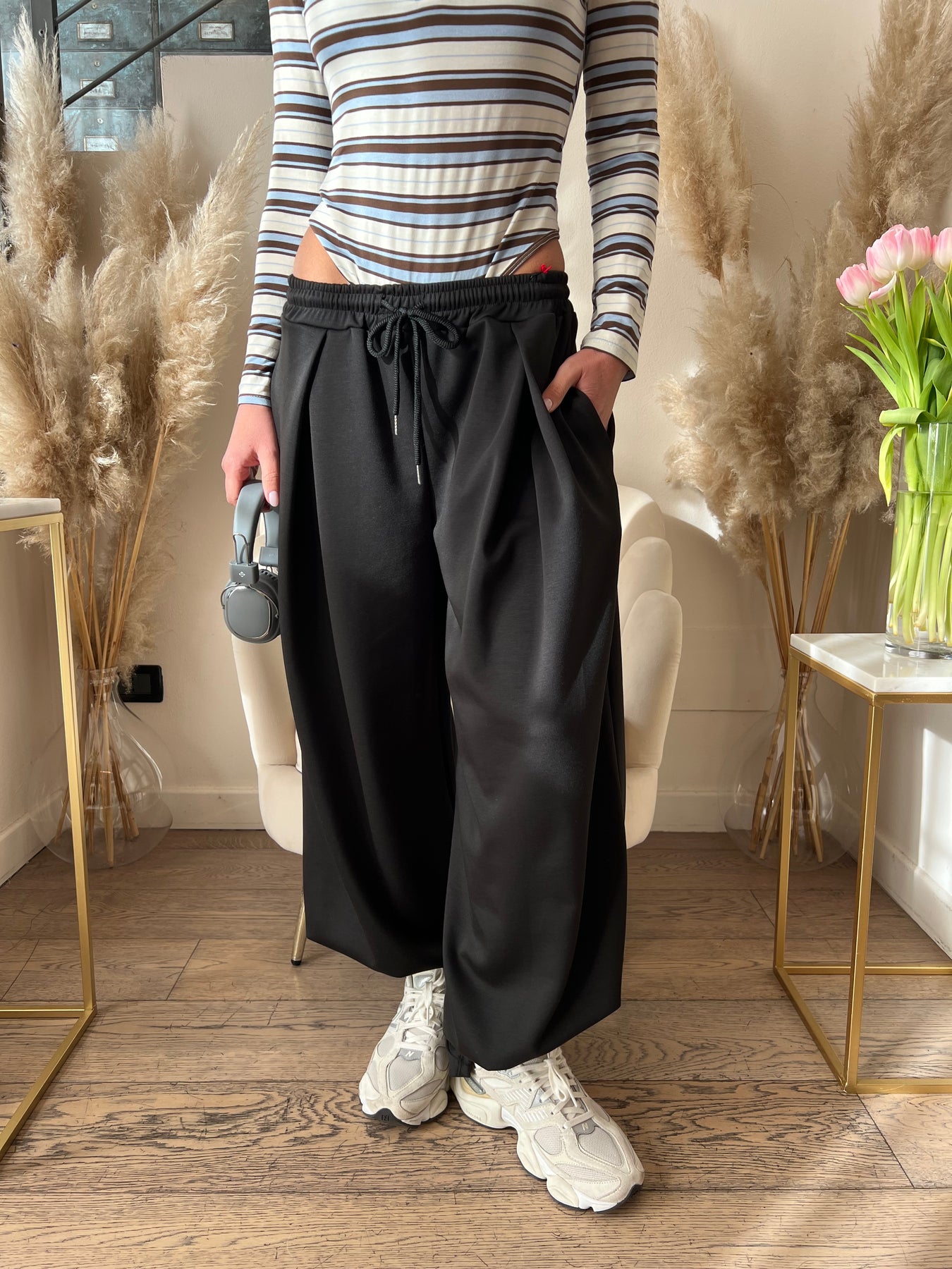 Pantaloni in cotone garzato dalla vestibilità over con elastico in vita, pinces e gamba molto ampia. Vestono dalla 40 alla 46