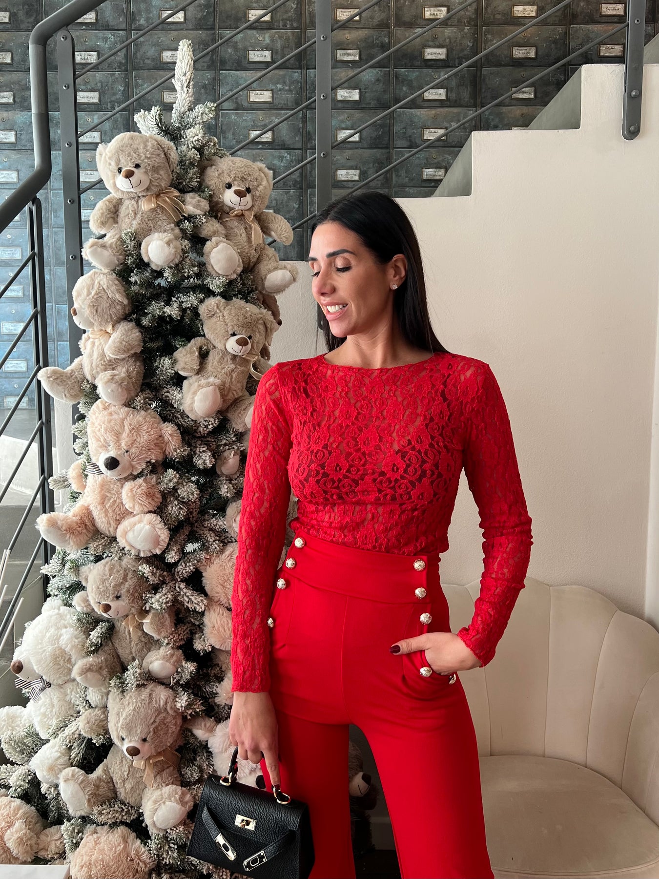 Top in pizzo semitrasparente a maniche lunghe dalla modellatura slim. Veste dalla 40 alla 44
