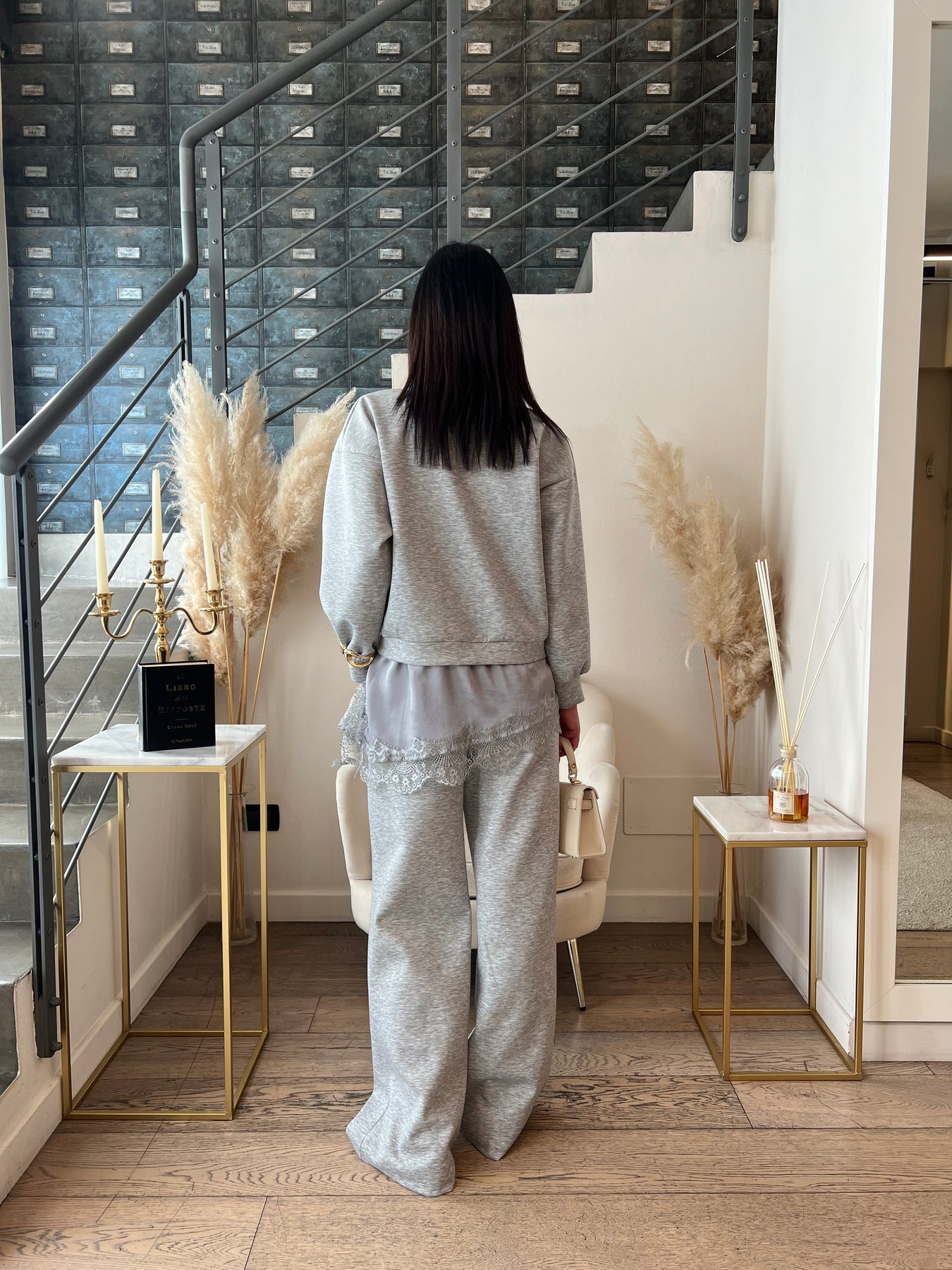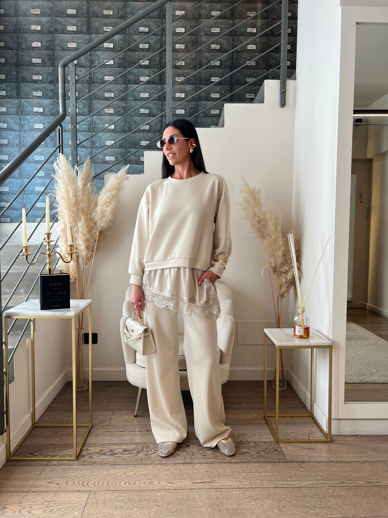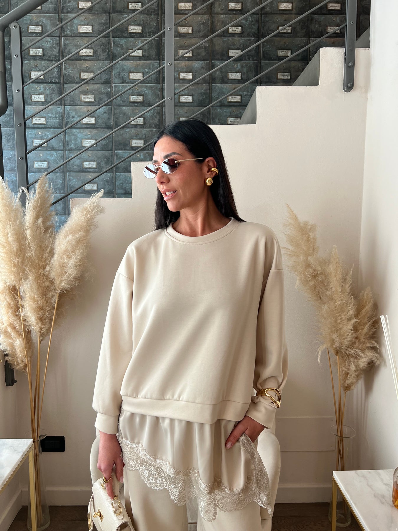 Tuta in viscosa dalla vestibilità ampia composta da felpa girocollo con bordo in satin e pizzo e pantaloni dritti con elastico in vita. Veste dalla 40 alla 46