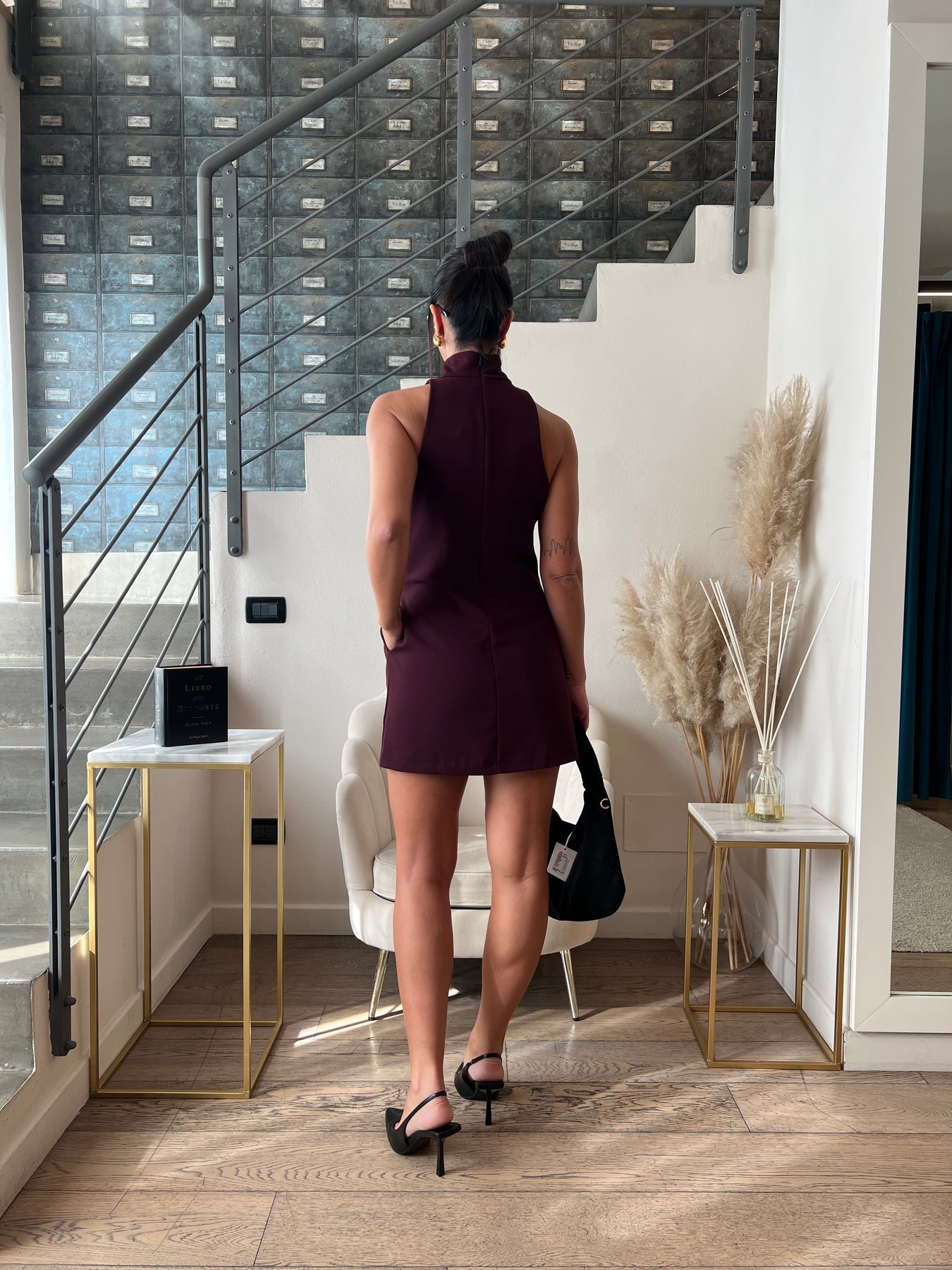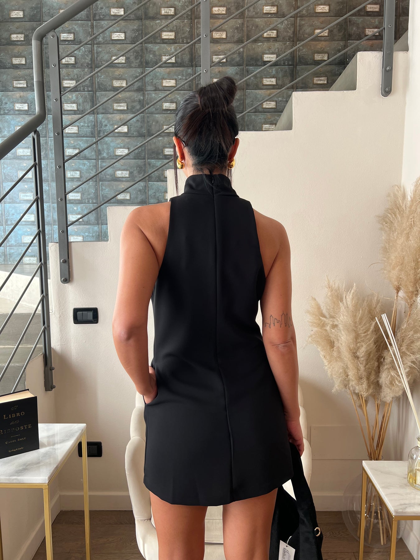Abito corto a collo alto senza maniche con goccia profonda e tasche.