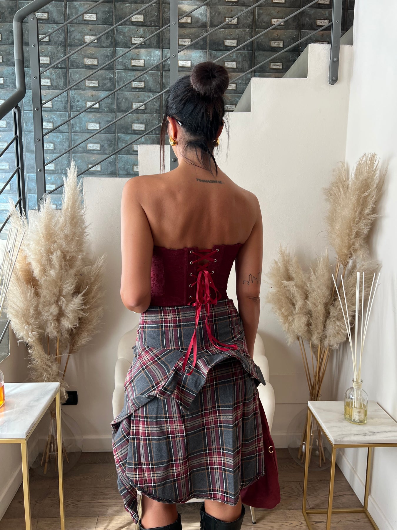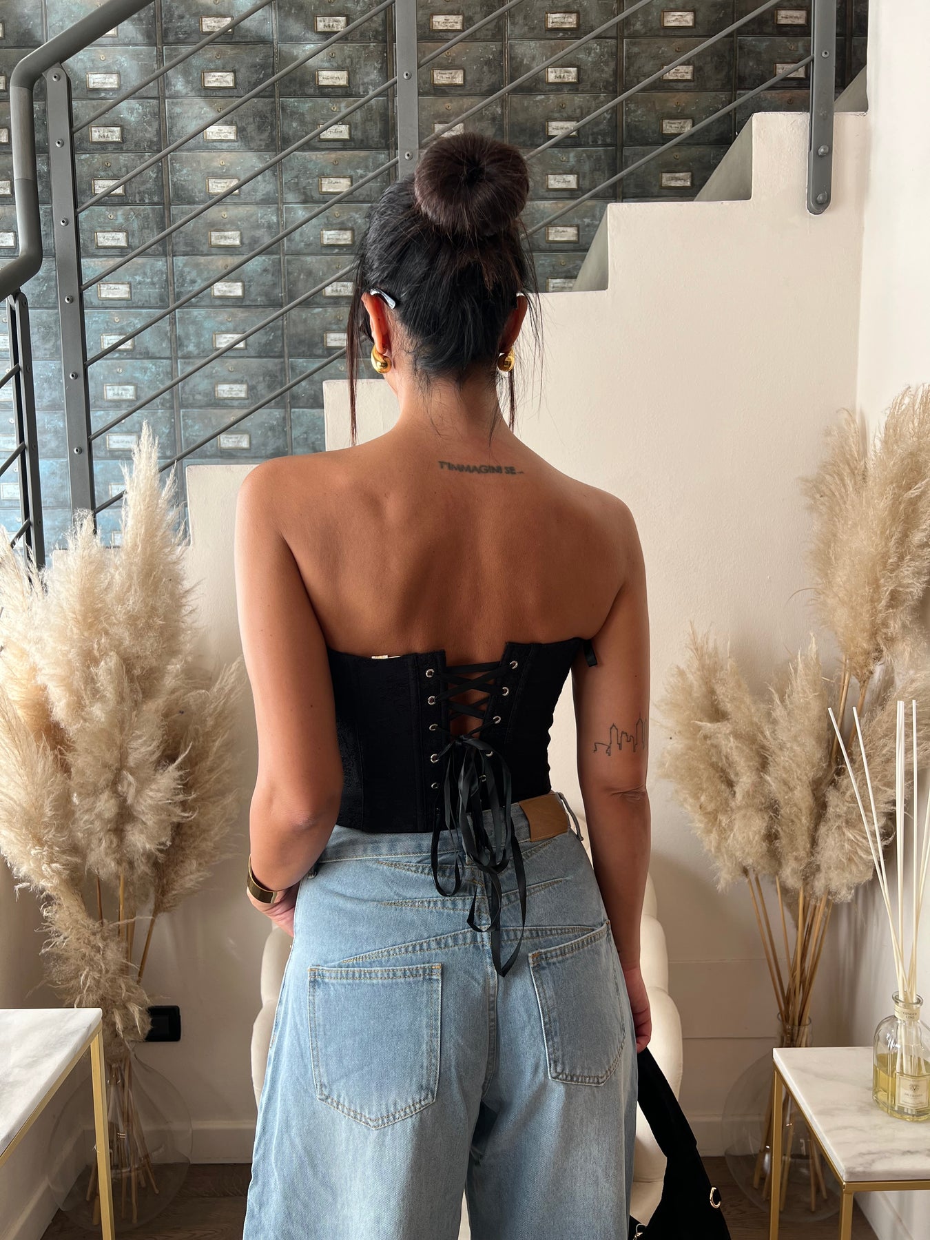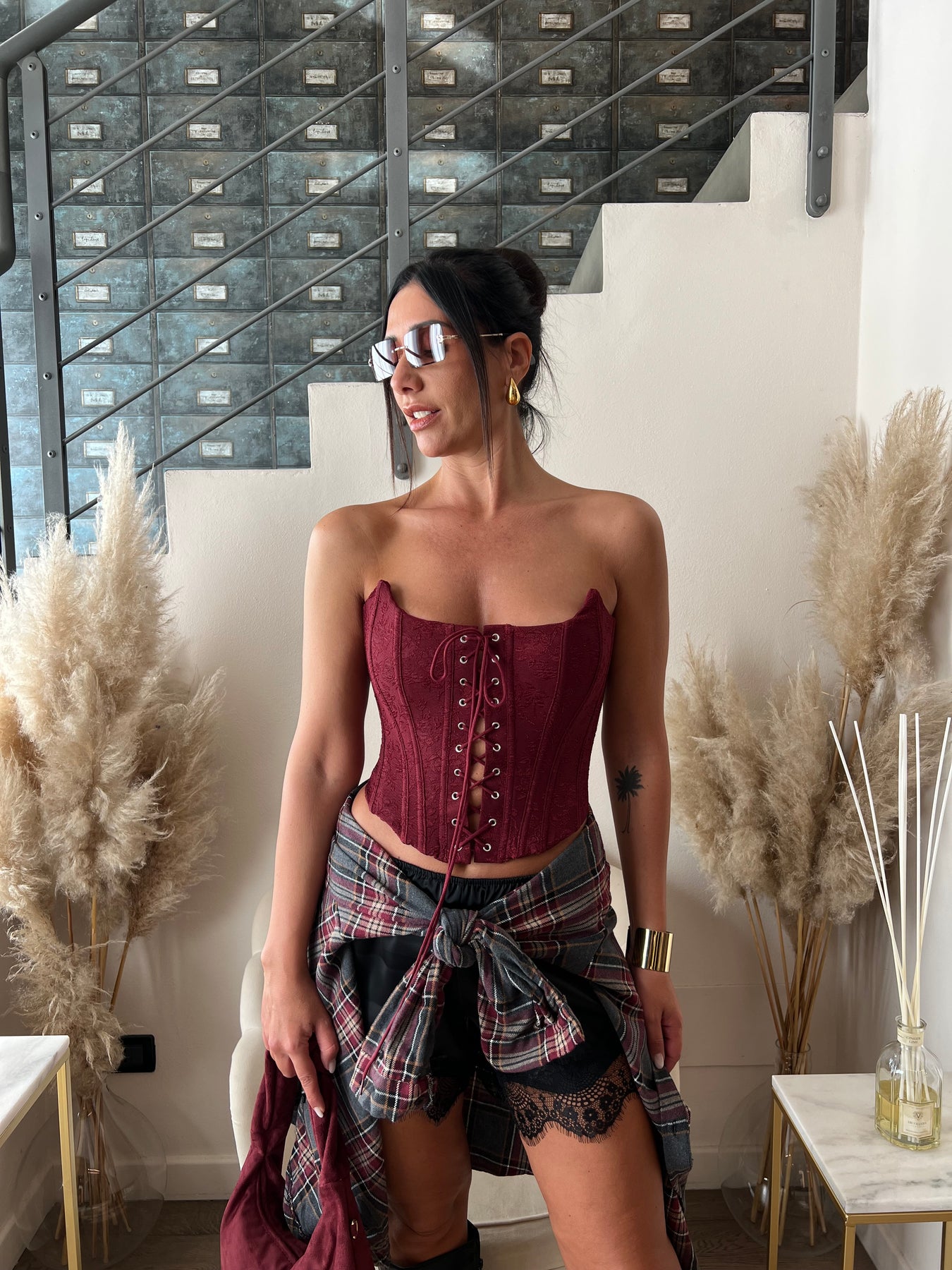 Bustino in pizzo con stecche e lacci da tirare per regolare la misura.
