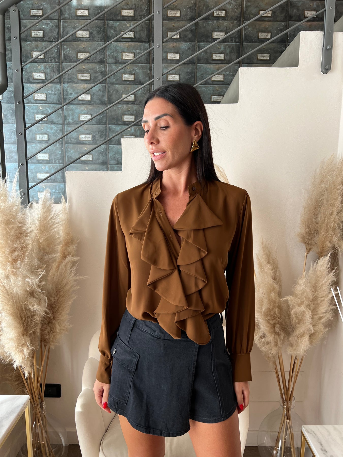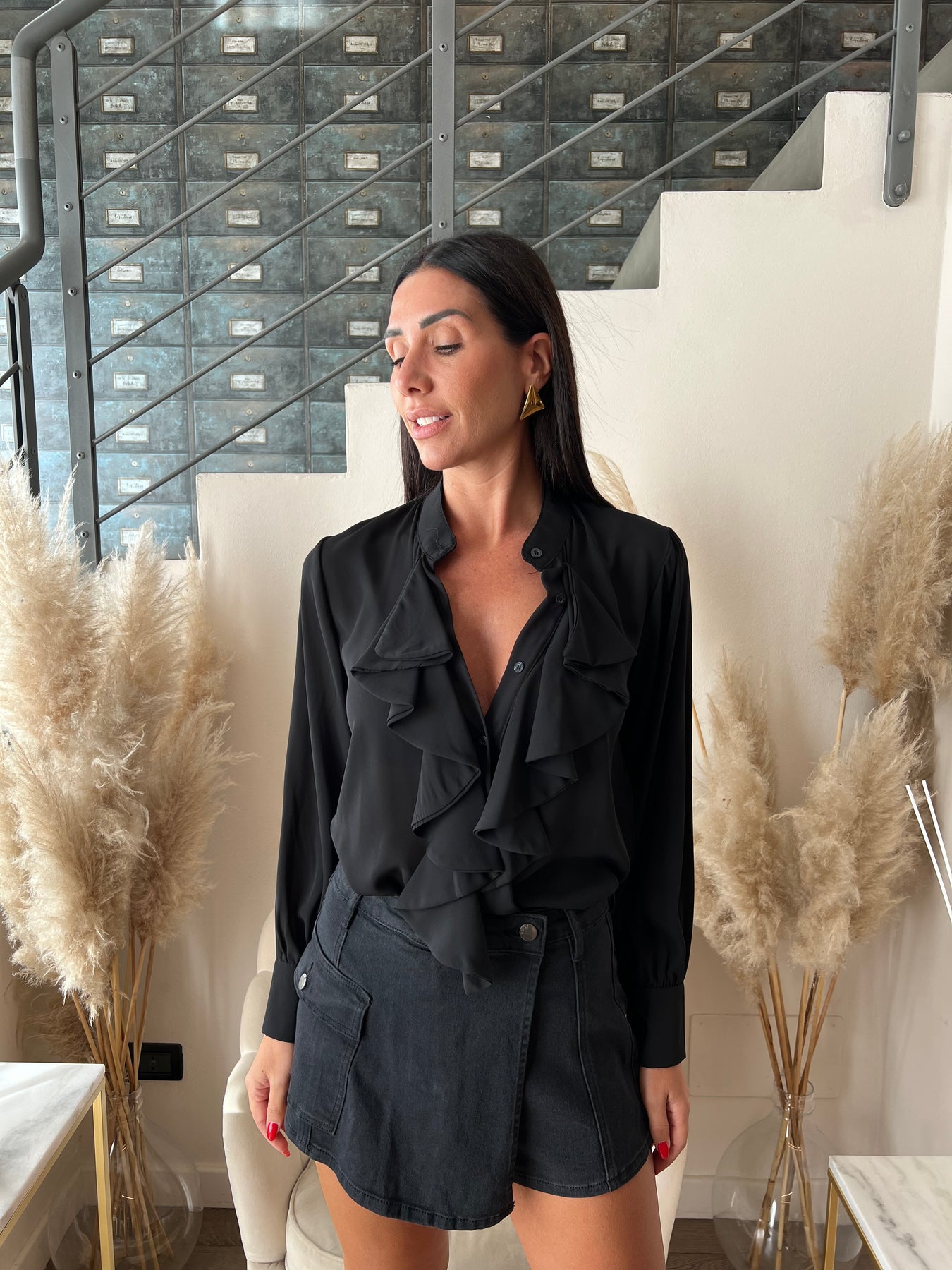 Camicia in tessuto sottile semitrasparente dalla vestibilità morbida con dettaglio jabot. Veste dalla 40 alla 44