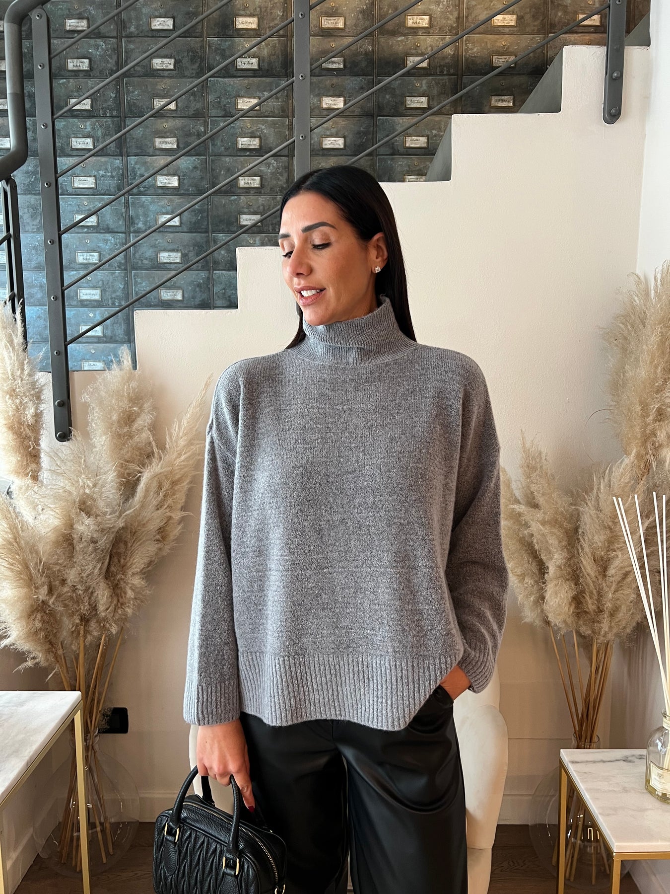 Maglione misto lana a collo alto dalla vestibilità ampia con spacchi laterali e retro più lungo. Veste dalla 40 alla 44