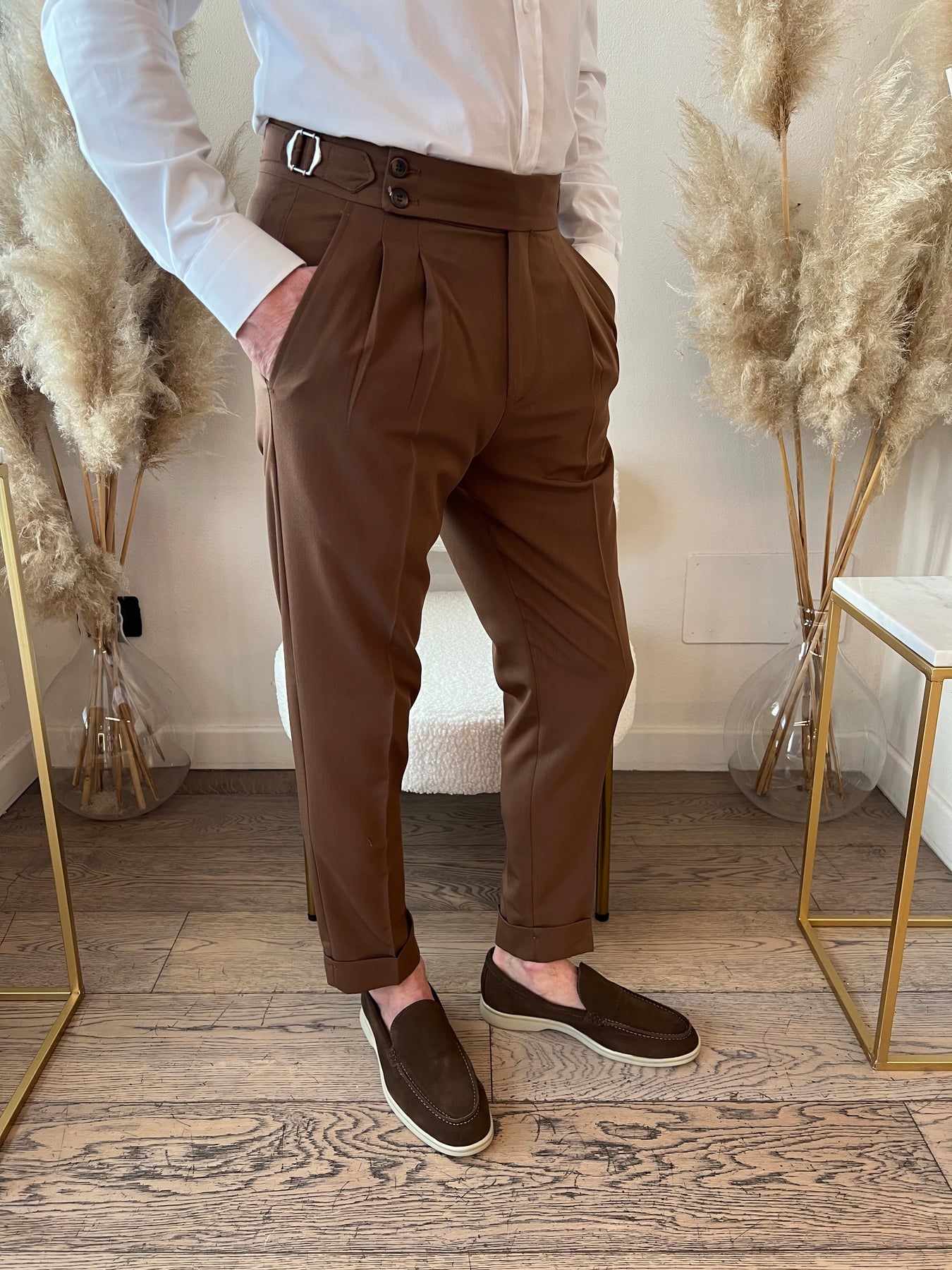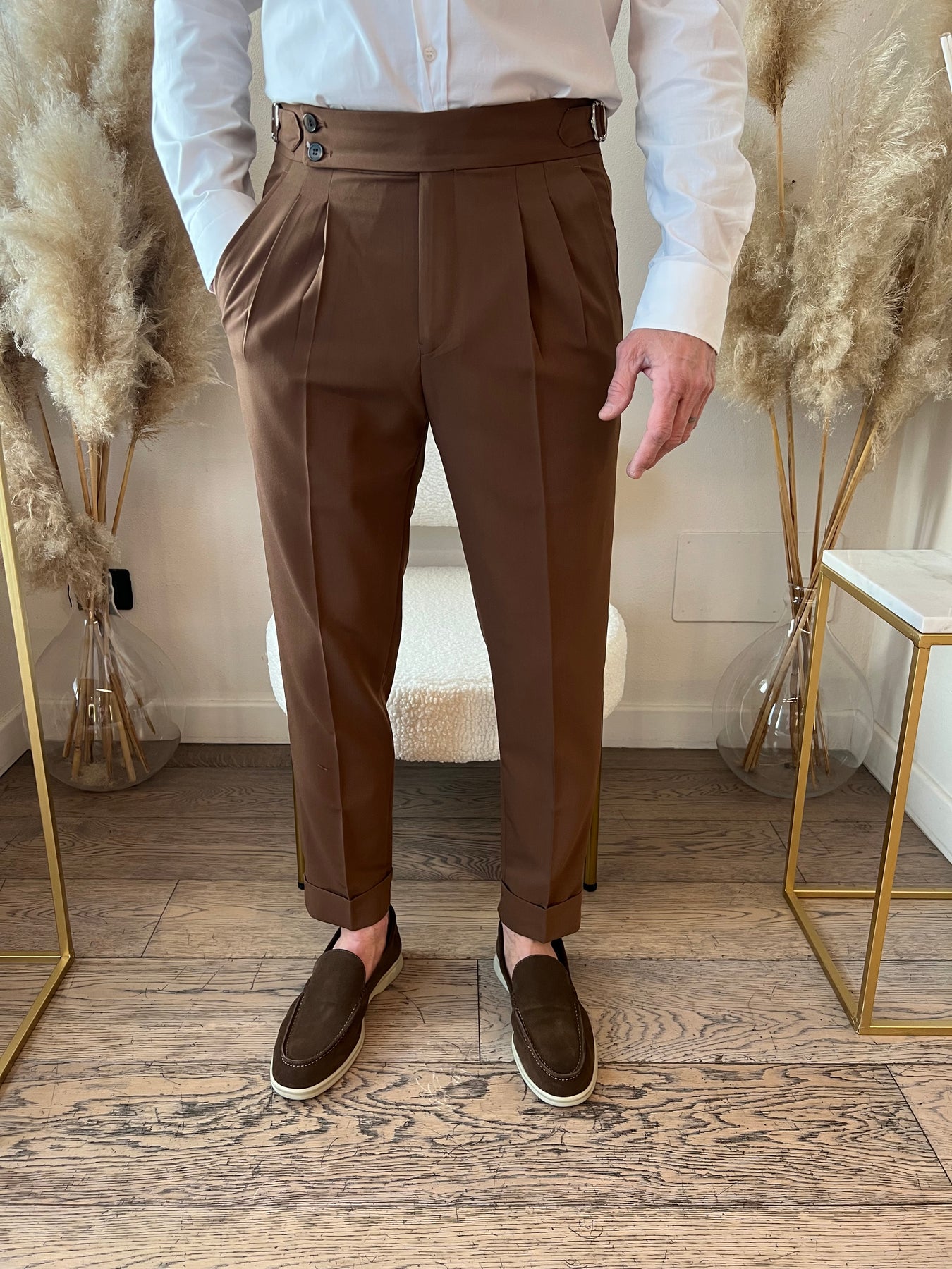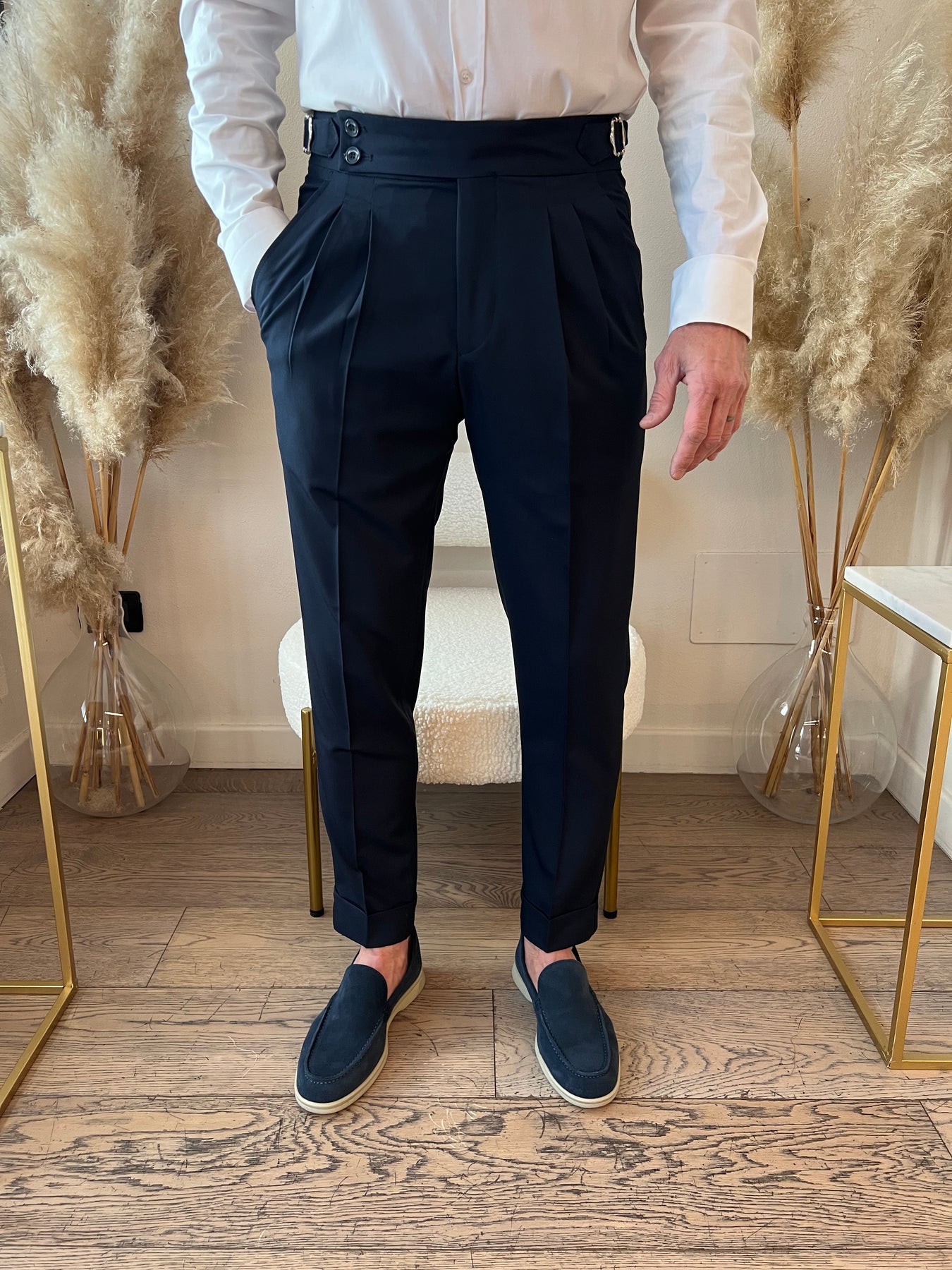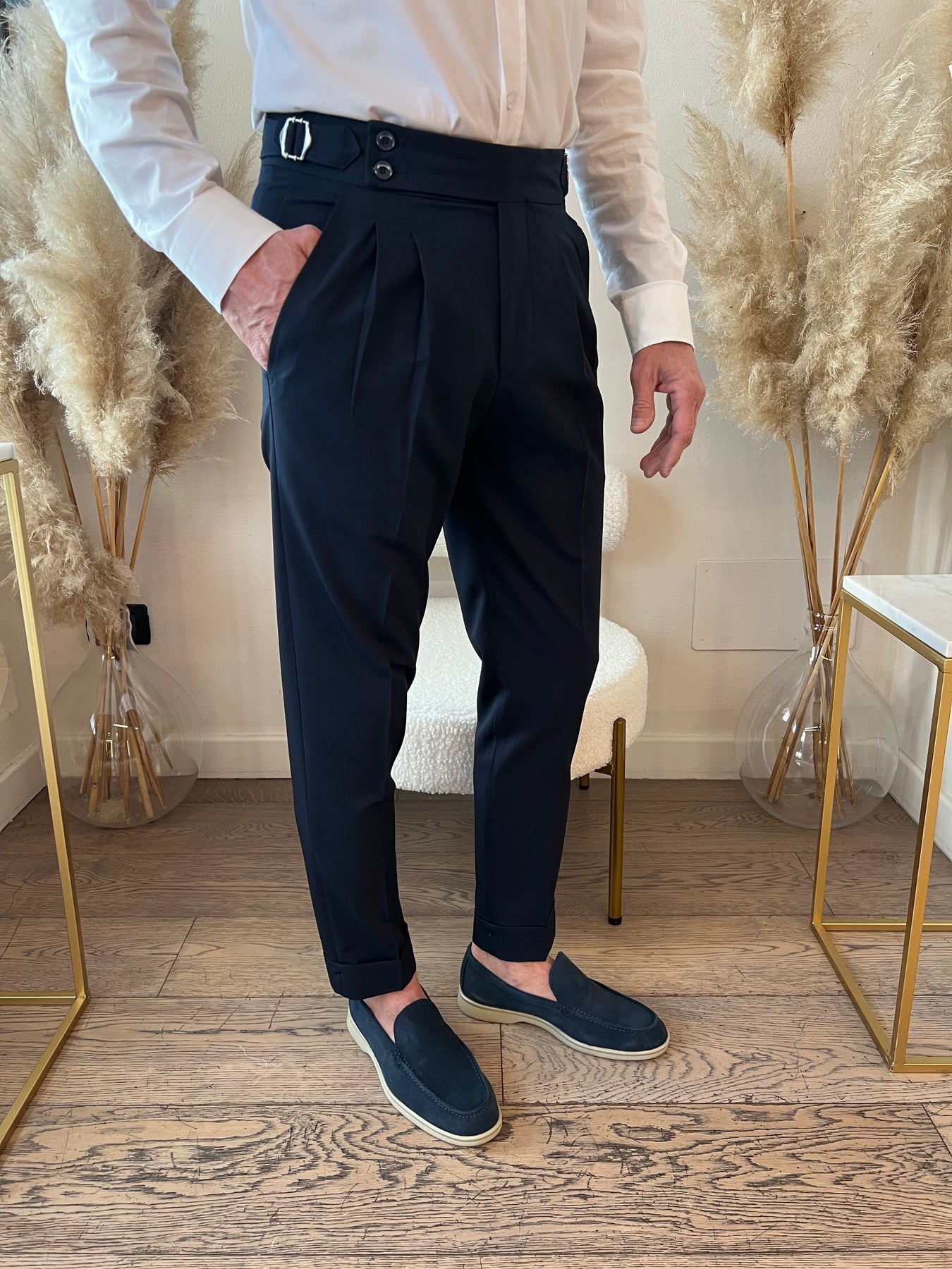Pantaloni a vita alta con pinces e fibbie laterali.