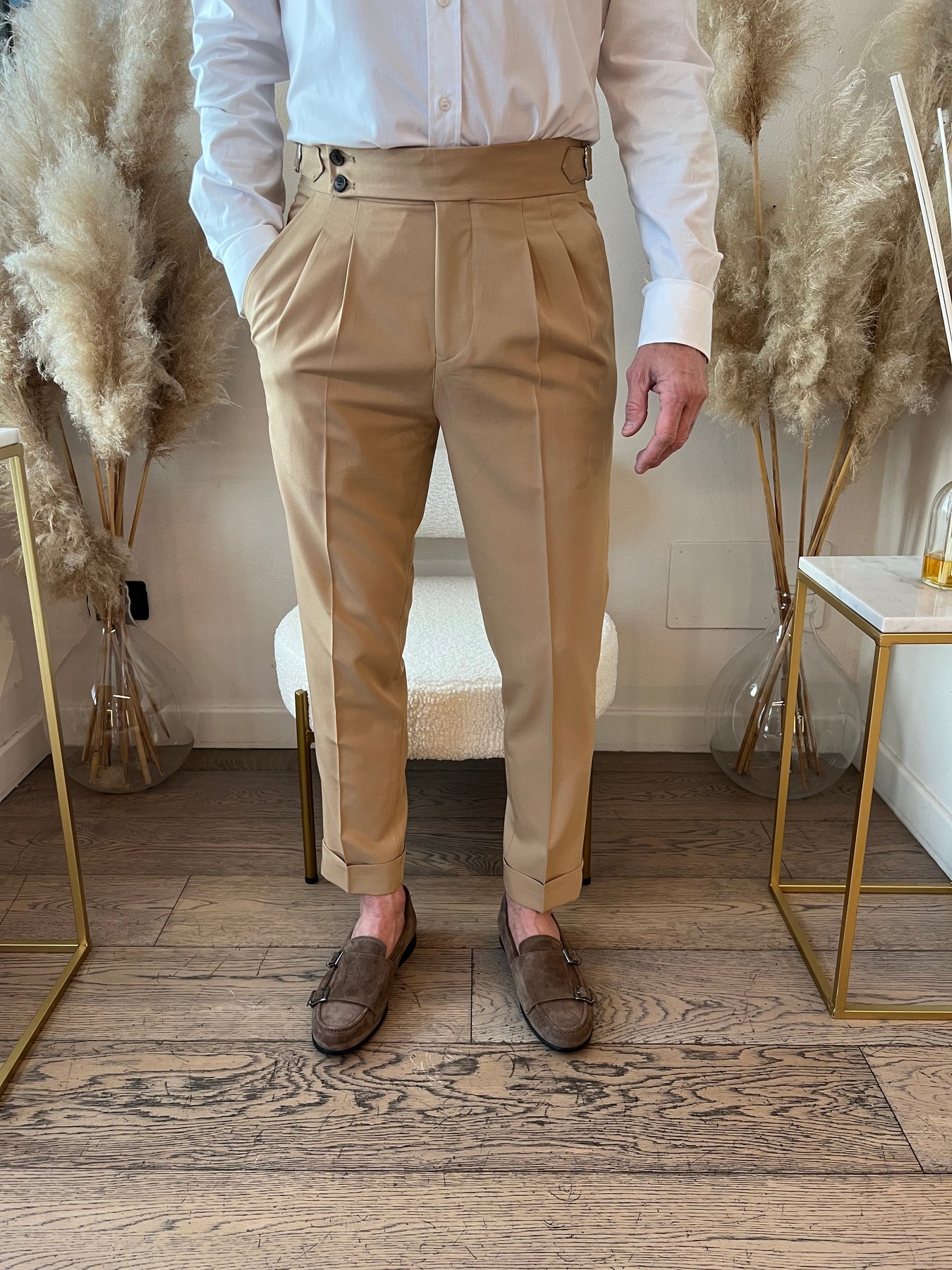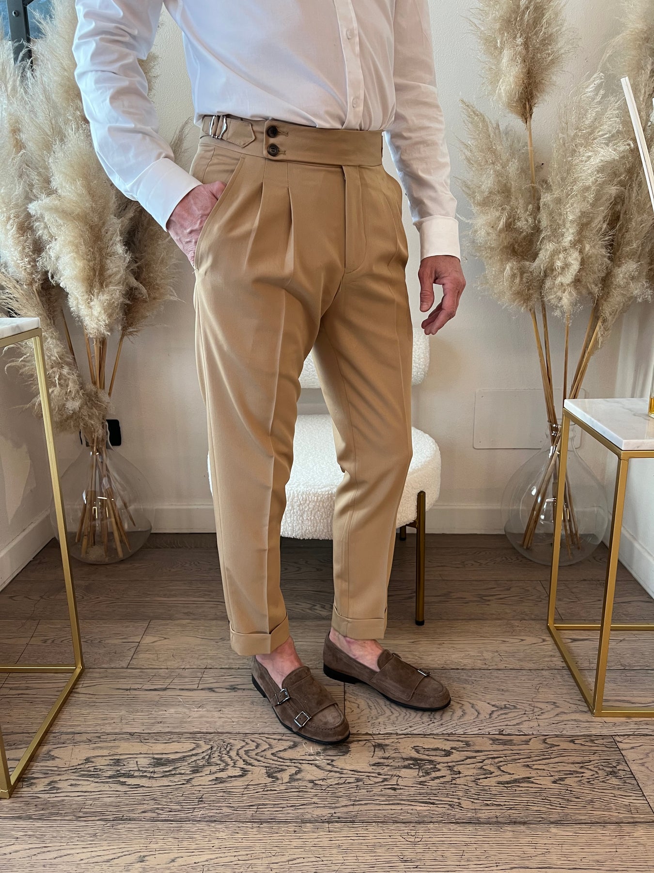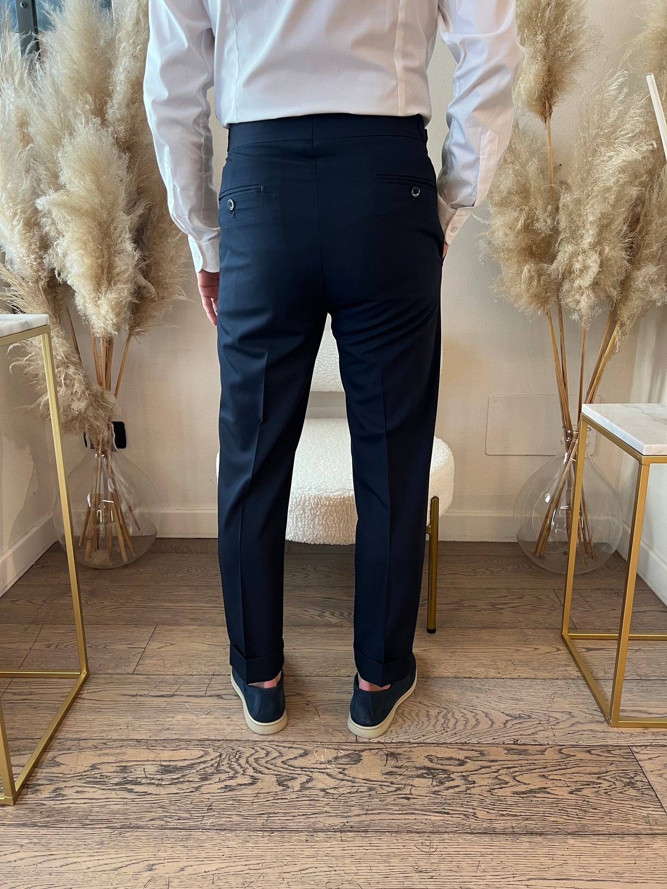 Pantaloni a vita alta con pinces e fibbie laterali.
