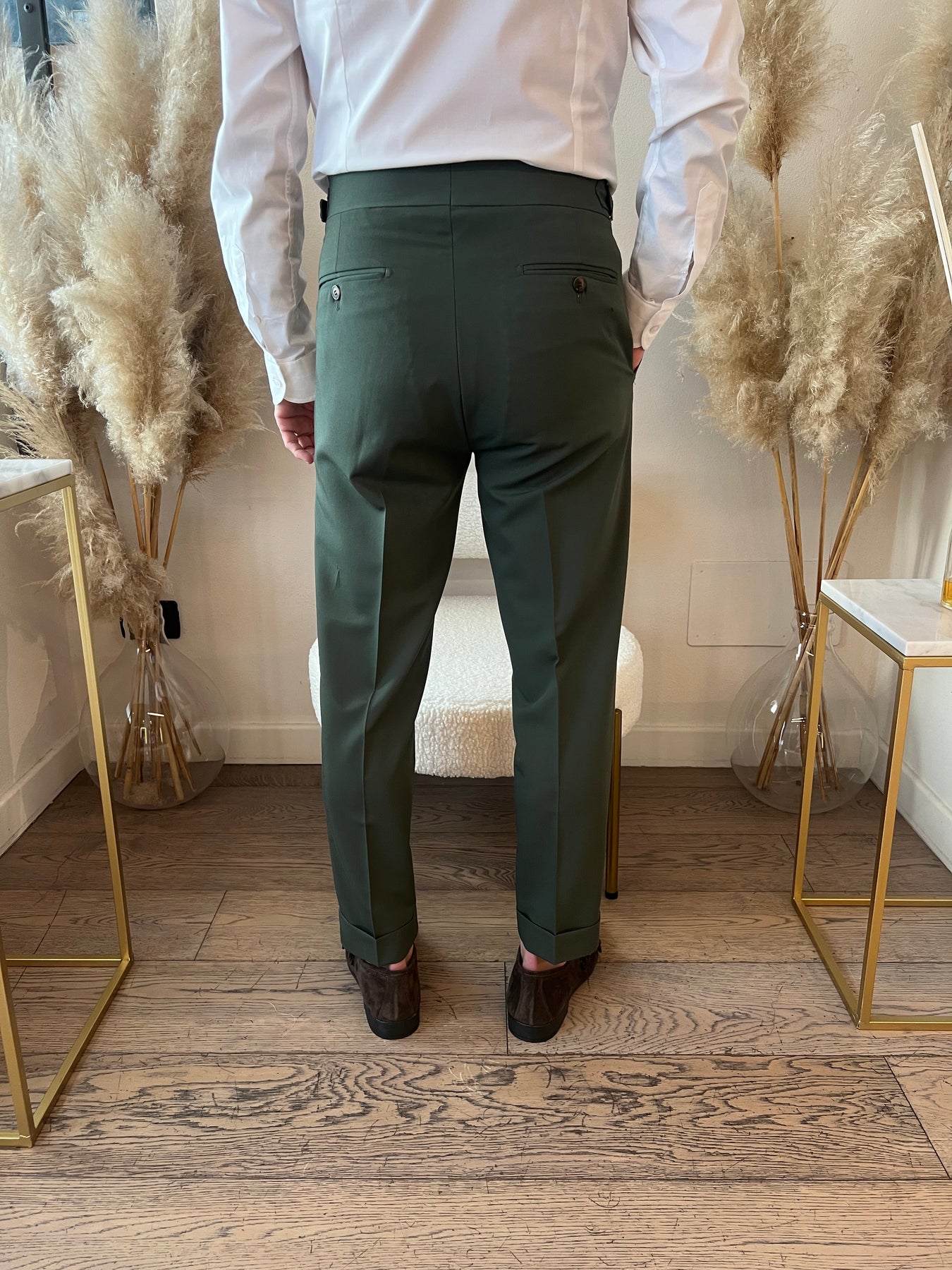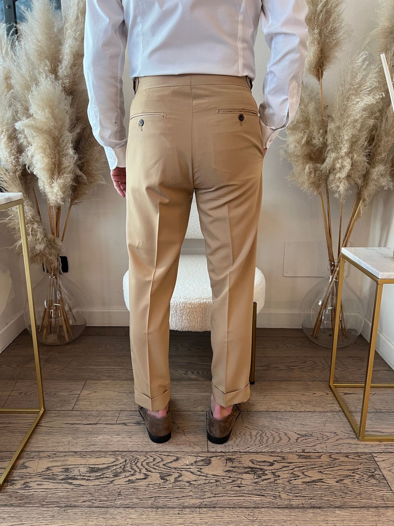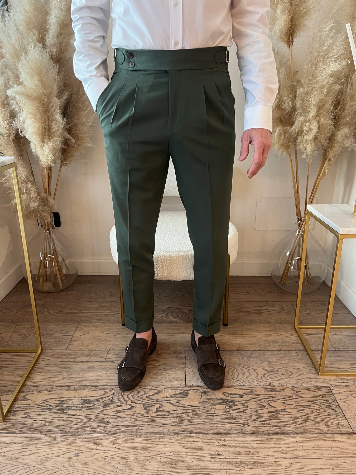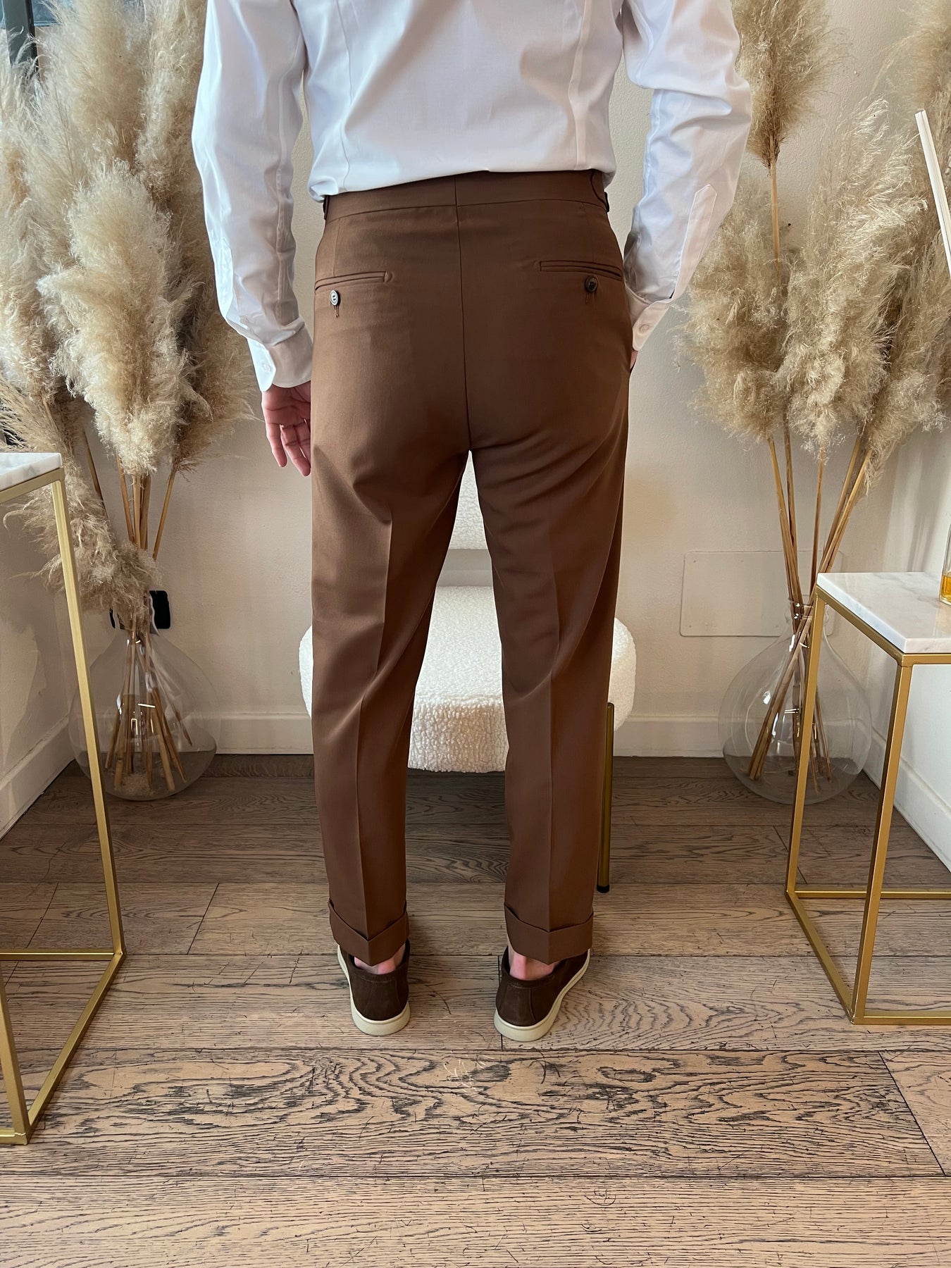 Pantaloni a vita alta con pinces e fibbie laterali.