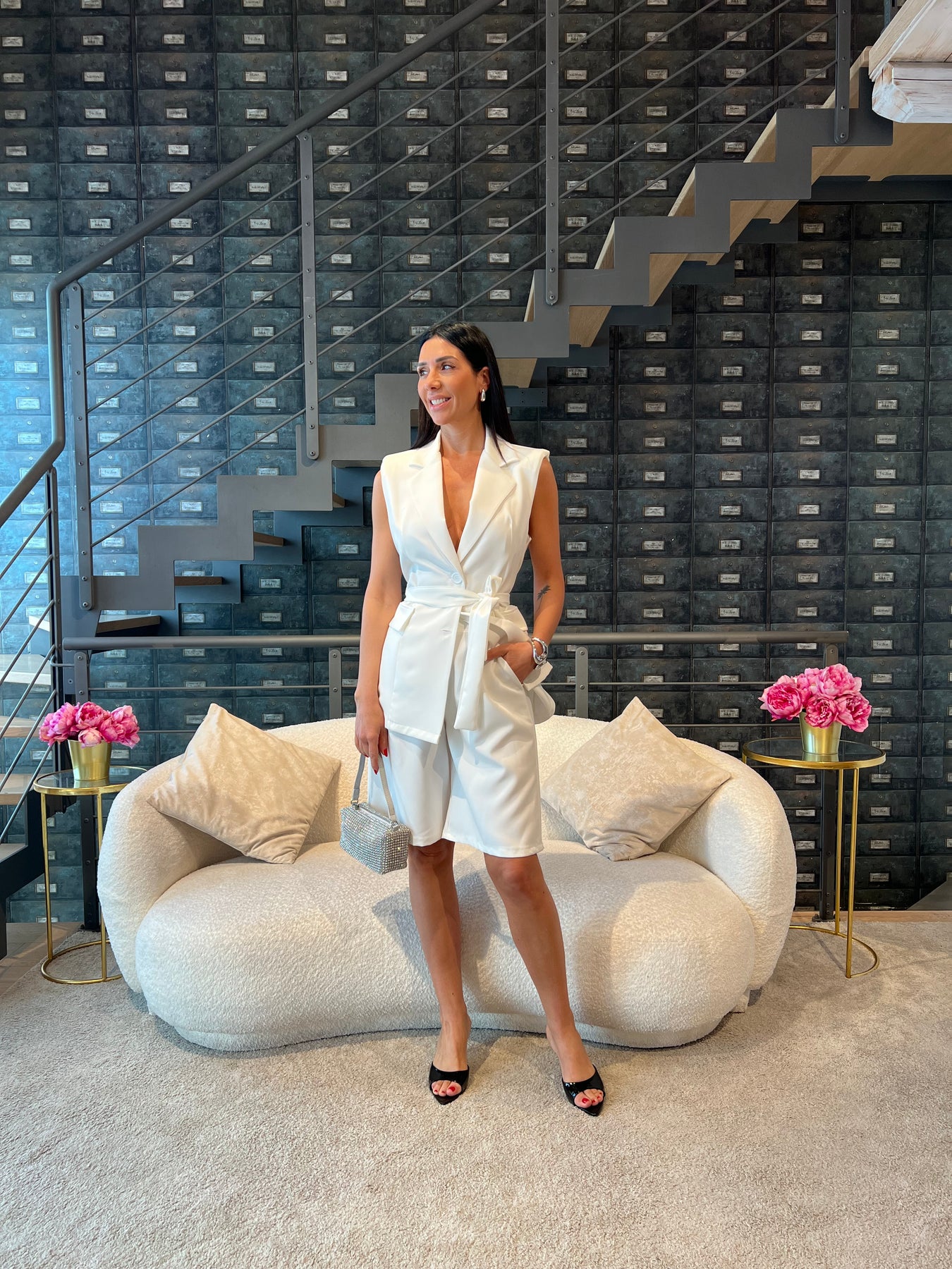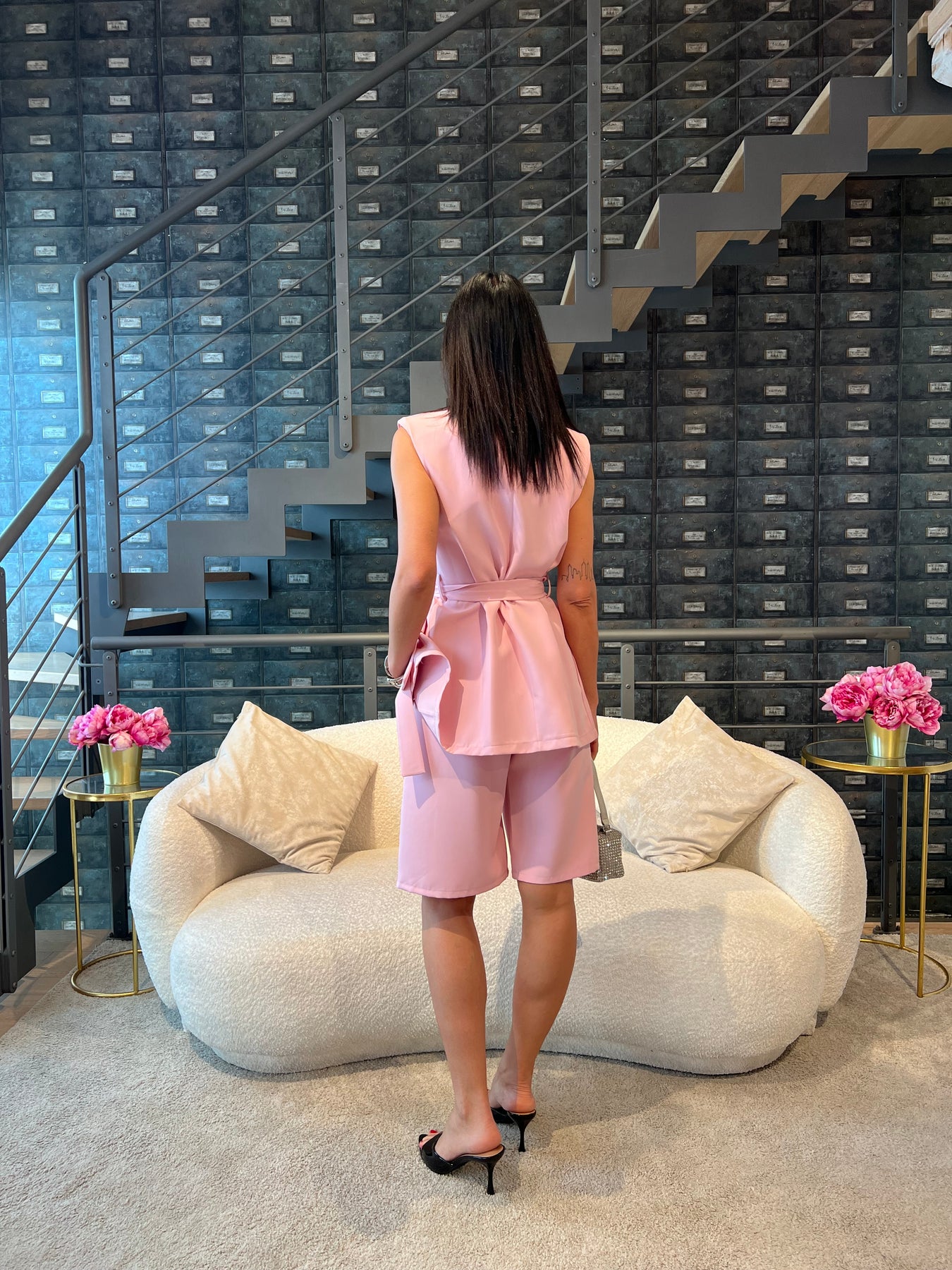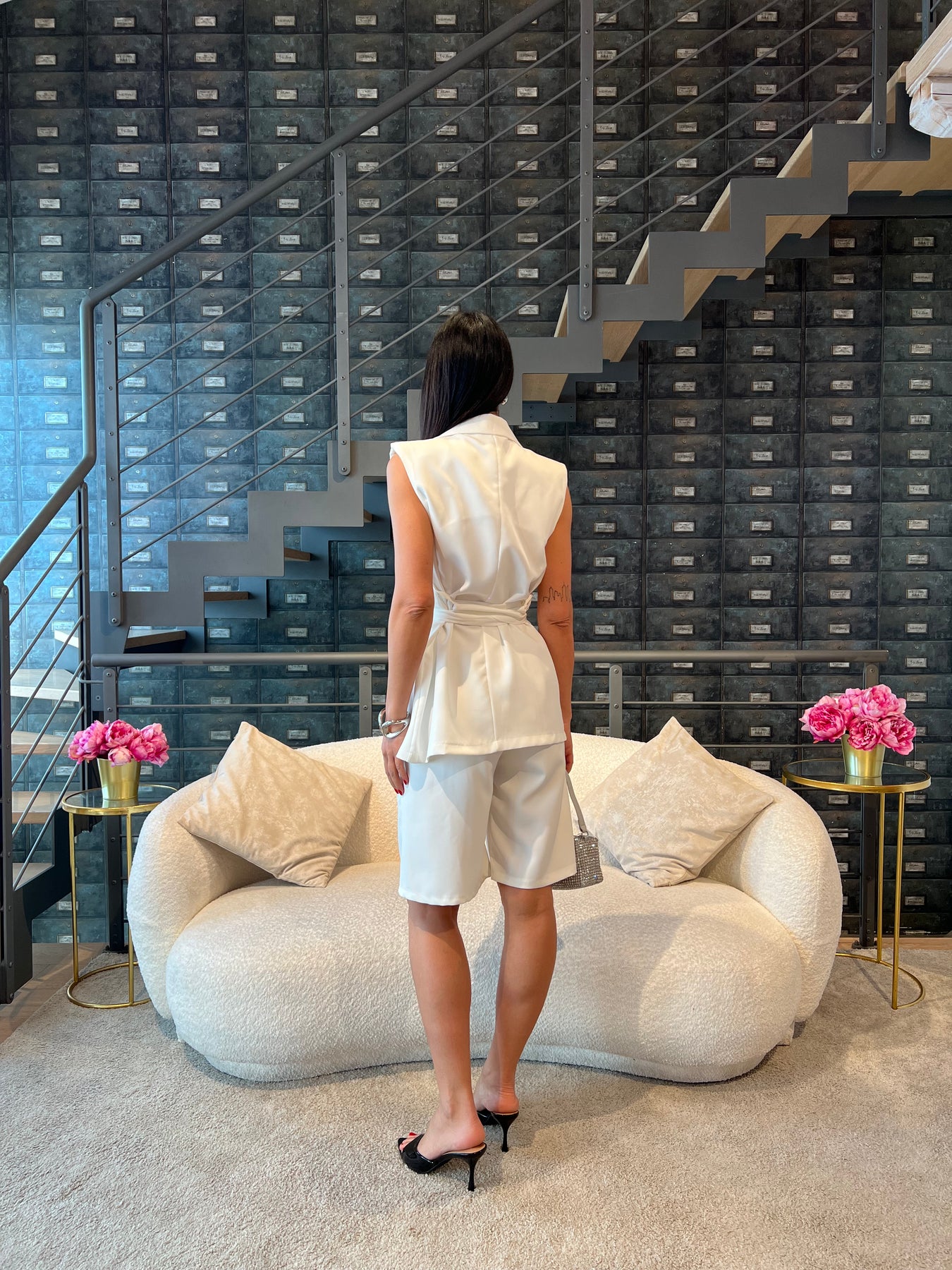 Completo composto da gilet lungo con cintura e bermuda con elastico nella parte posteriore della vita. Veste dalla 40 alla 44