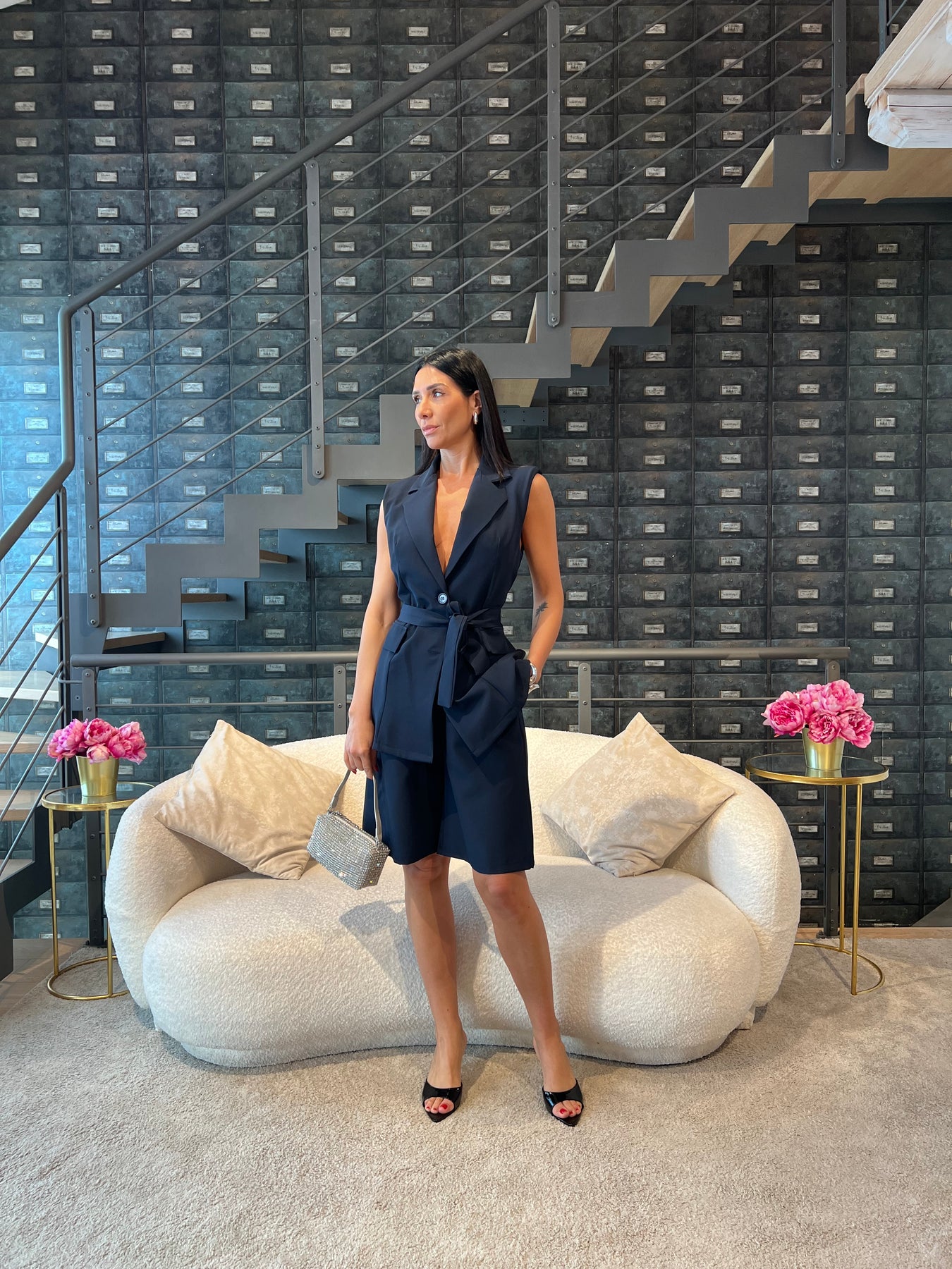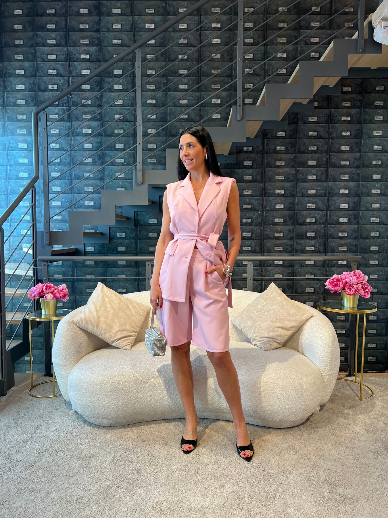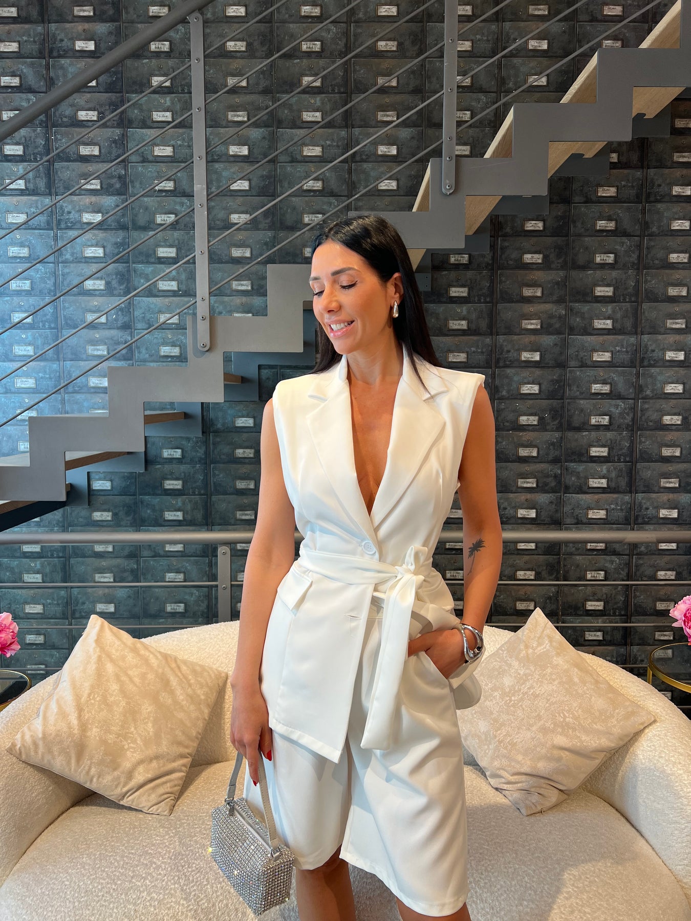 Completo composto da gilet lungo con cintura e bermuda con elastico nella parte posteriore della vita. Veste dalla 40 alla 44