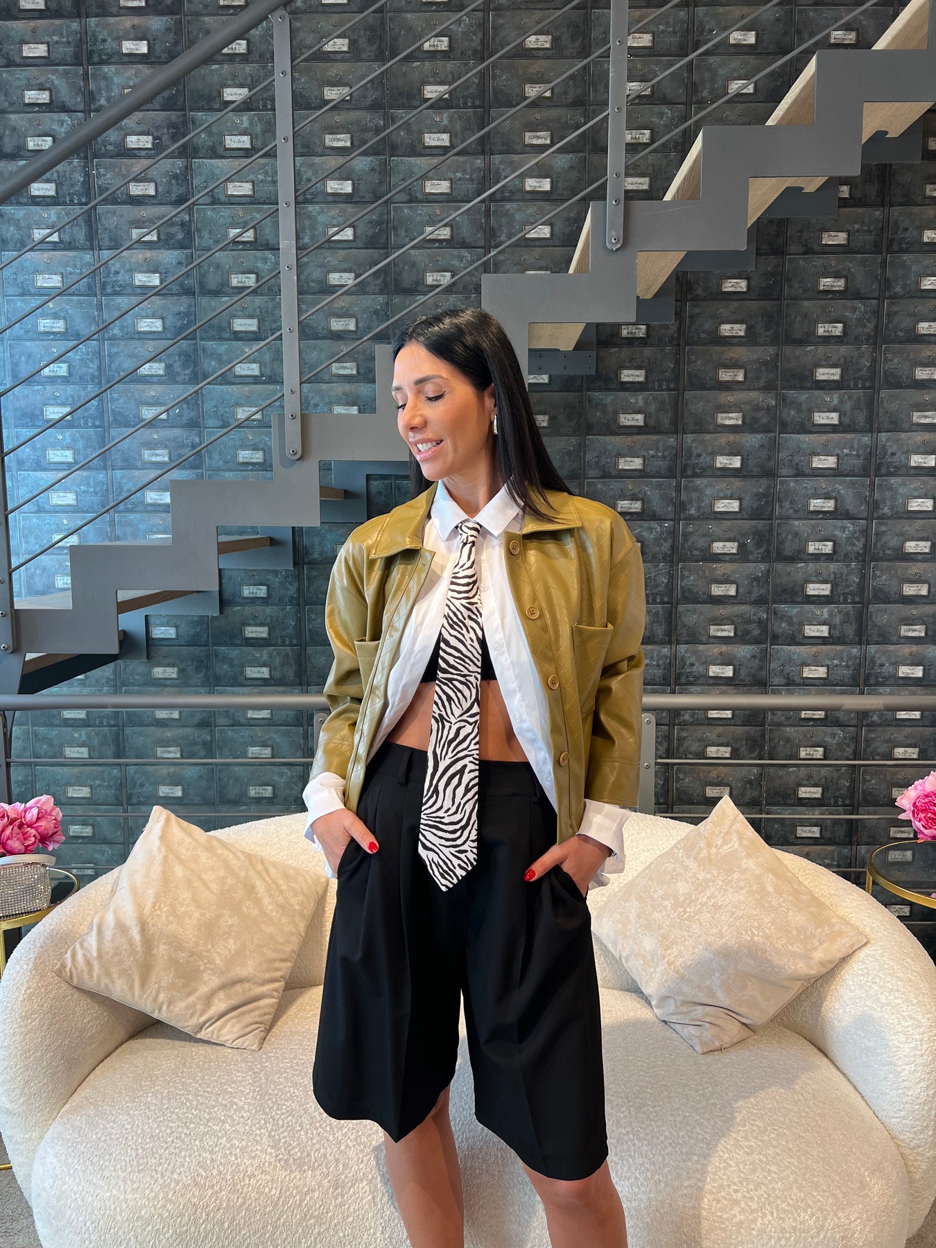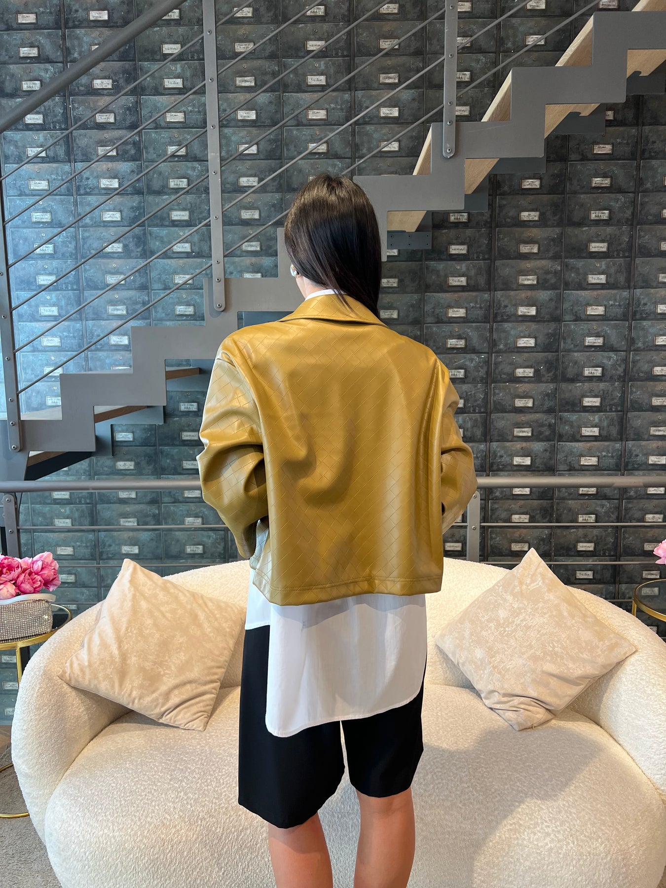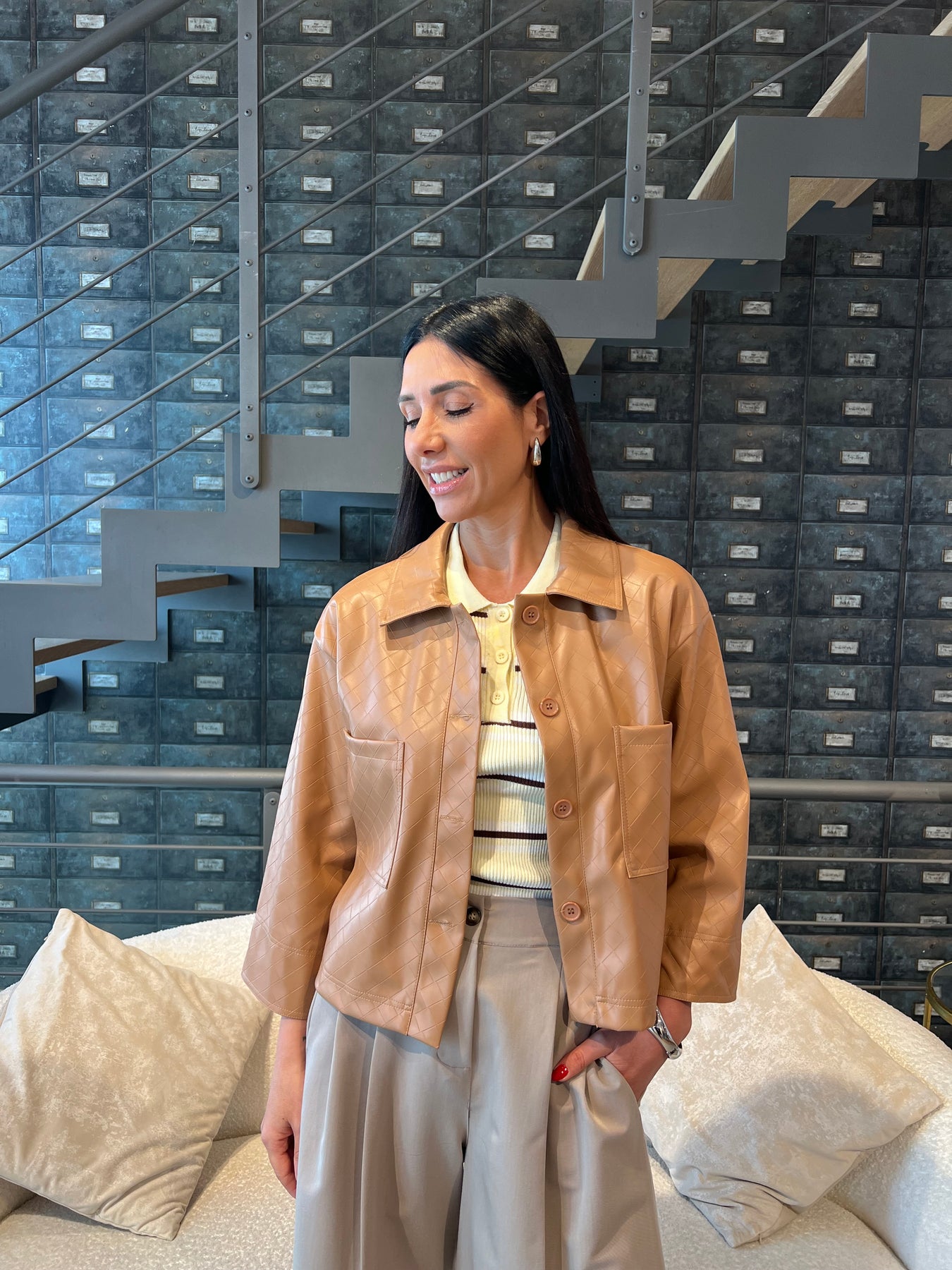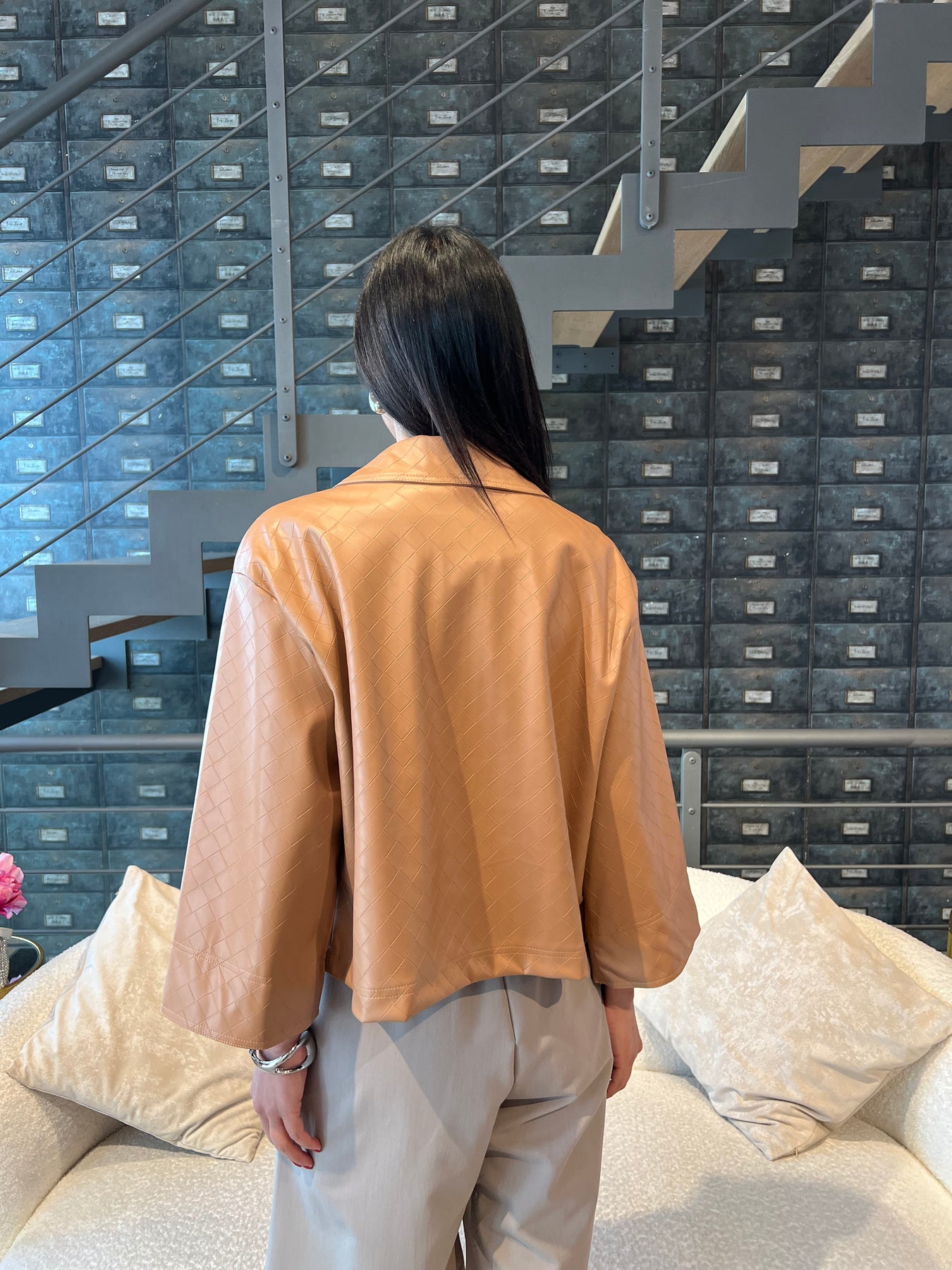 Giacca in ecopelle lavorata dalla vestibilità ampia con maniche al gomito e tasche applicate. Veste dalla 40 alla 44