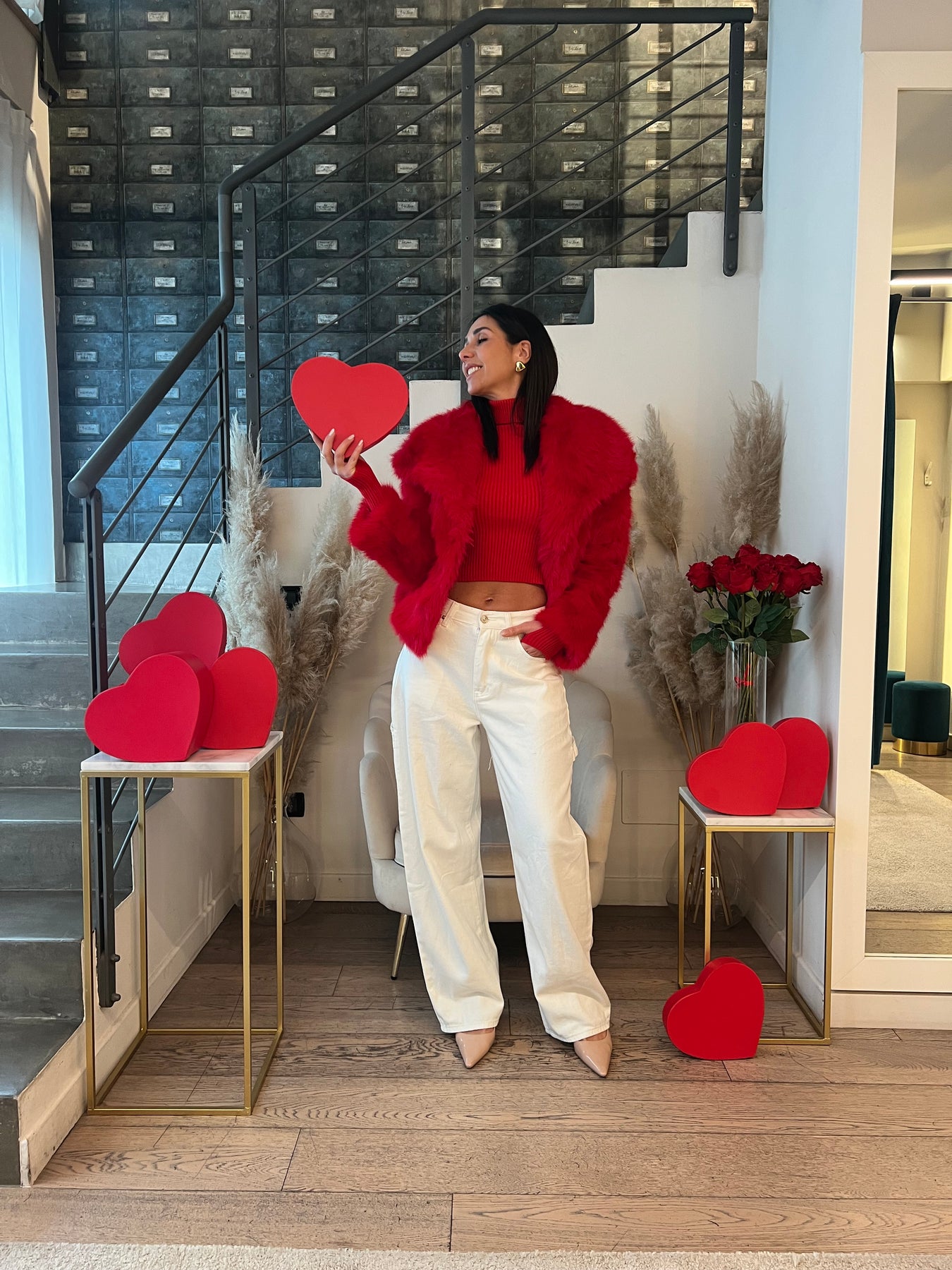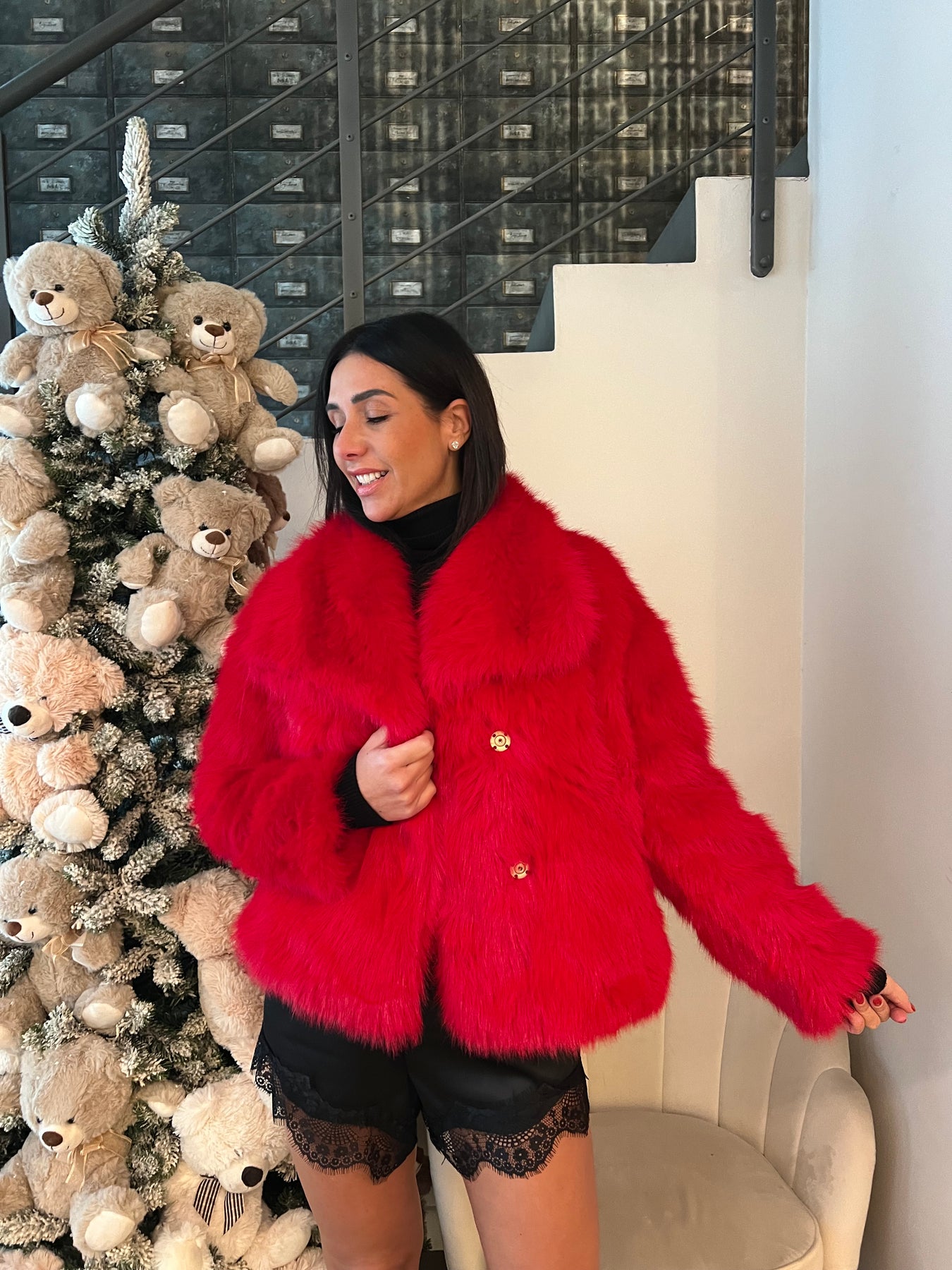 Ecofur foderata dal taglio dritto con tasche e chiusura con bottoni a pressione interni. Veste dalla 40 alla 44
