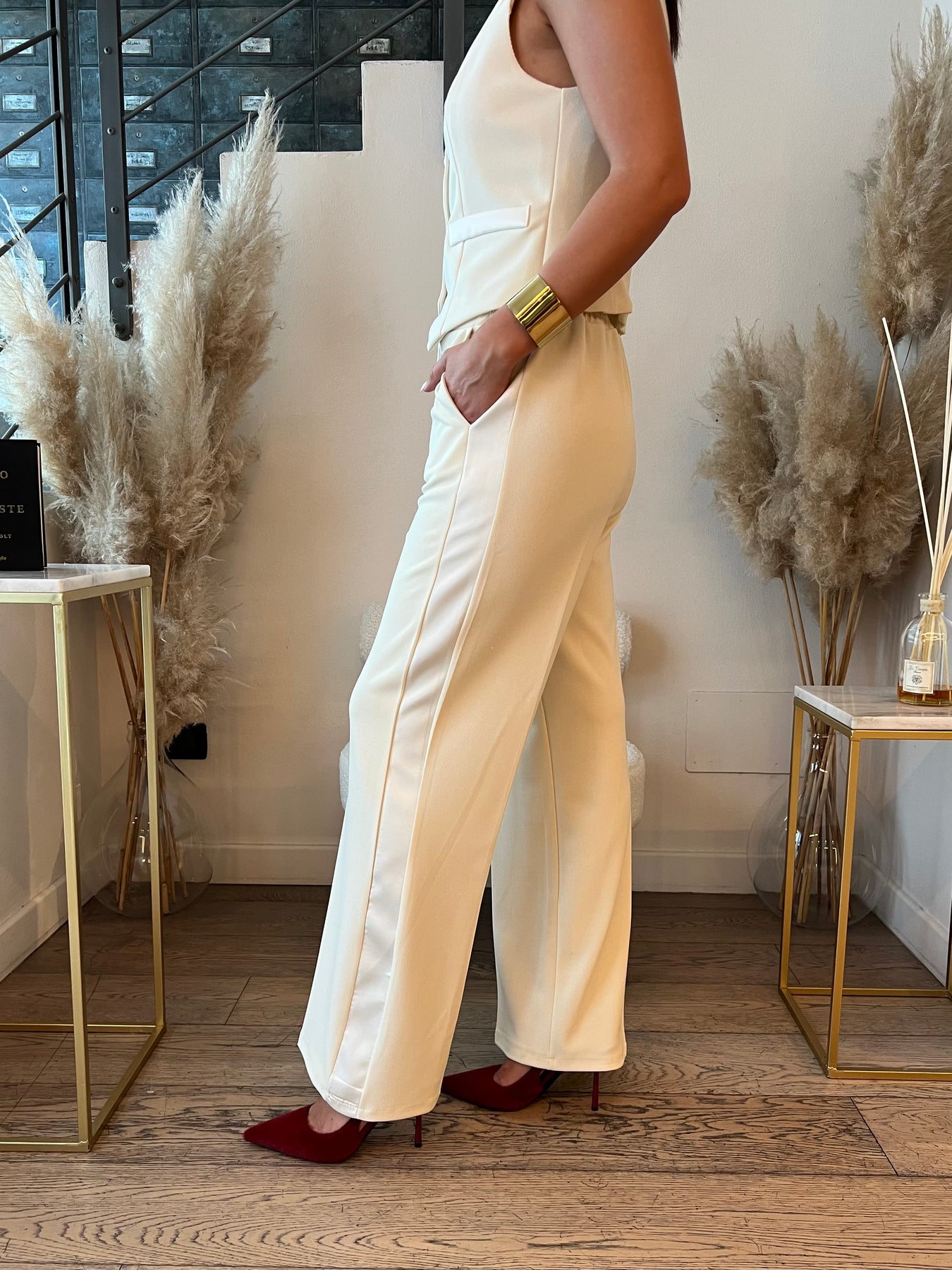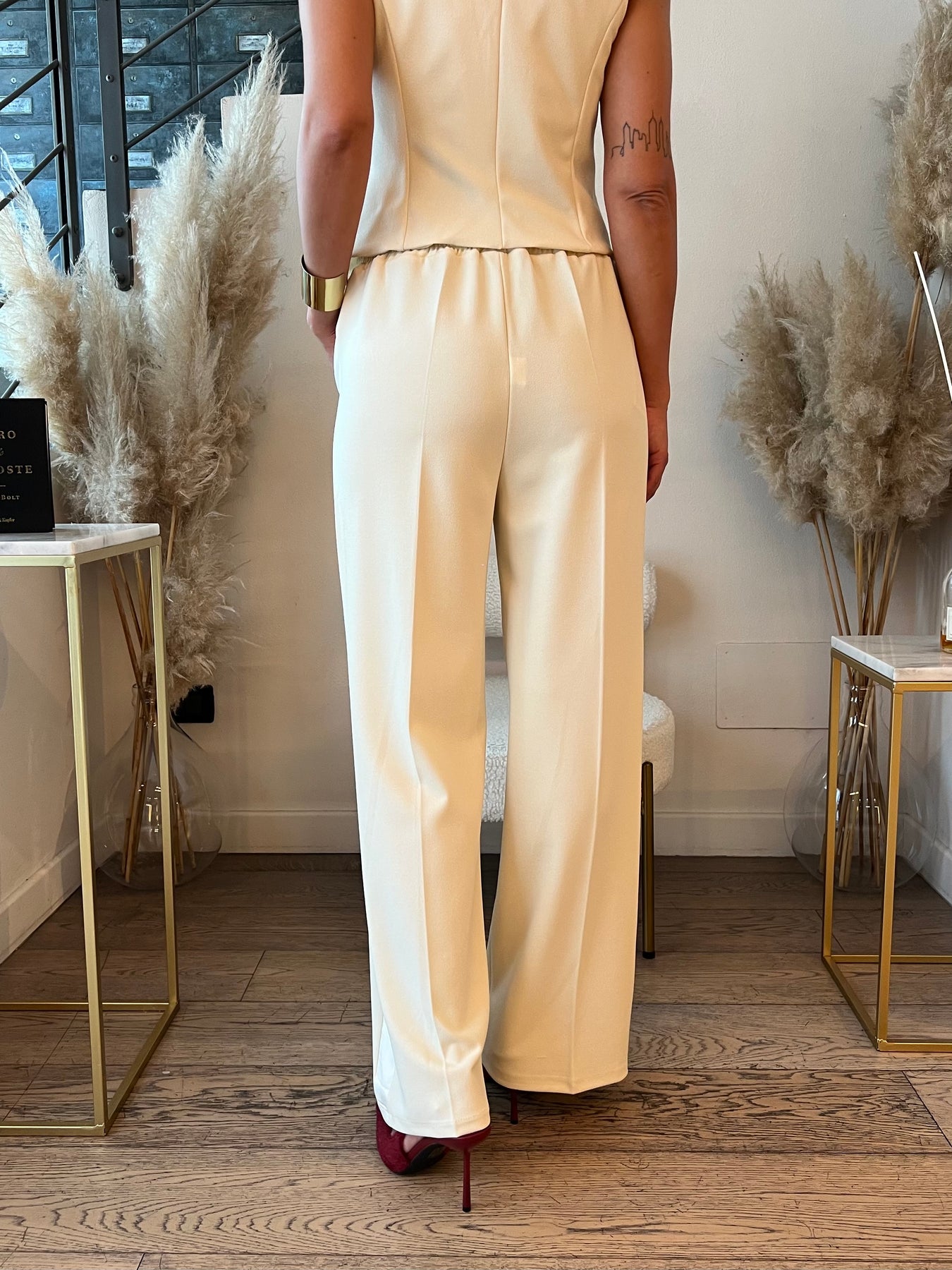 Pantaloni in punto milano elasticizzato con elastico in vita e gamba morbida. Dettaglio bordo satin