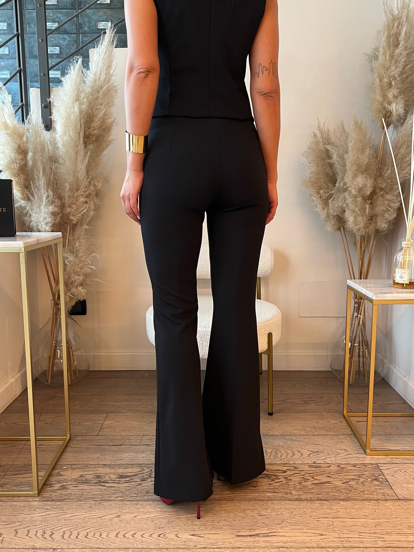 Pantaloni elasticizzati con bordo satin e fondo a zampa.
