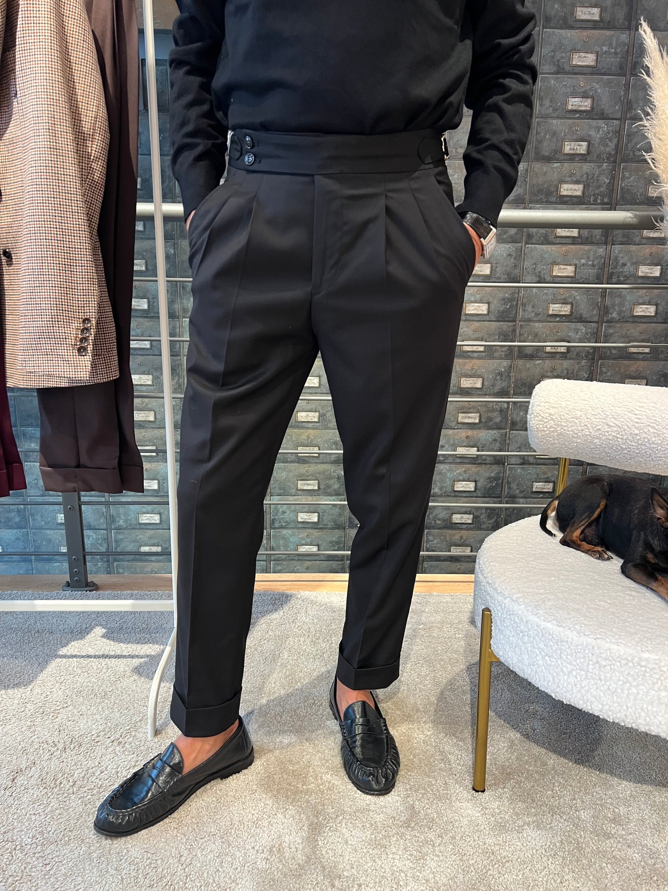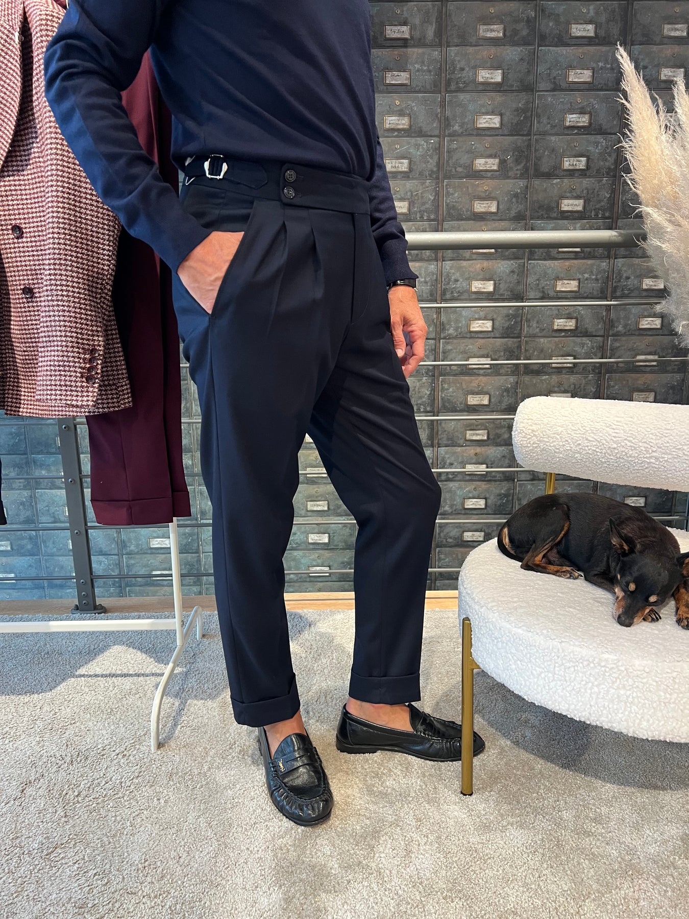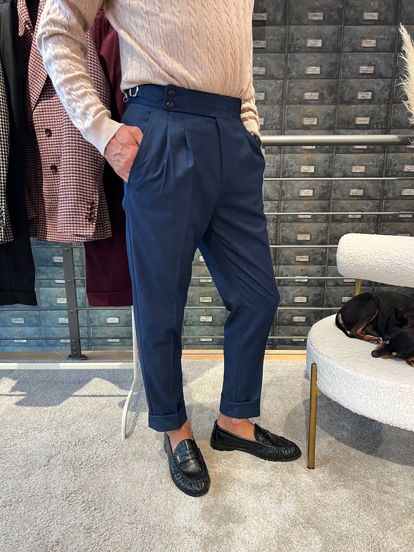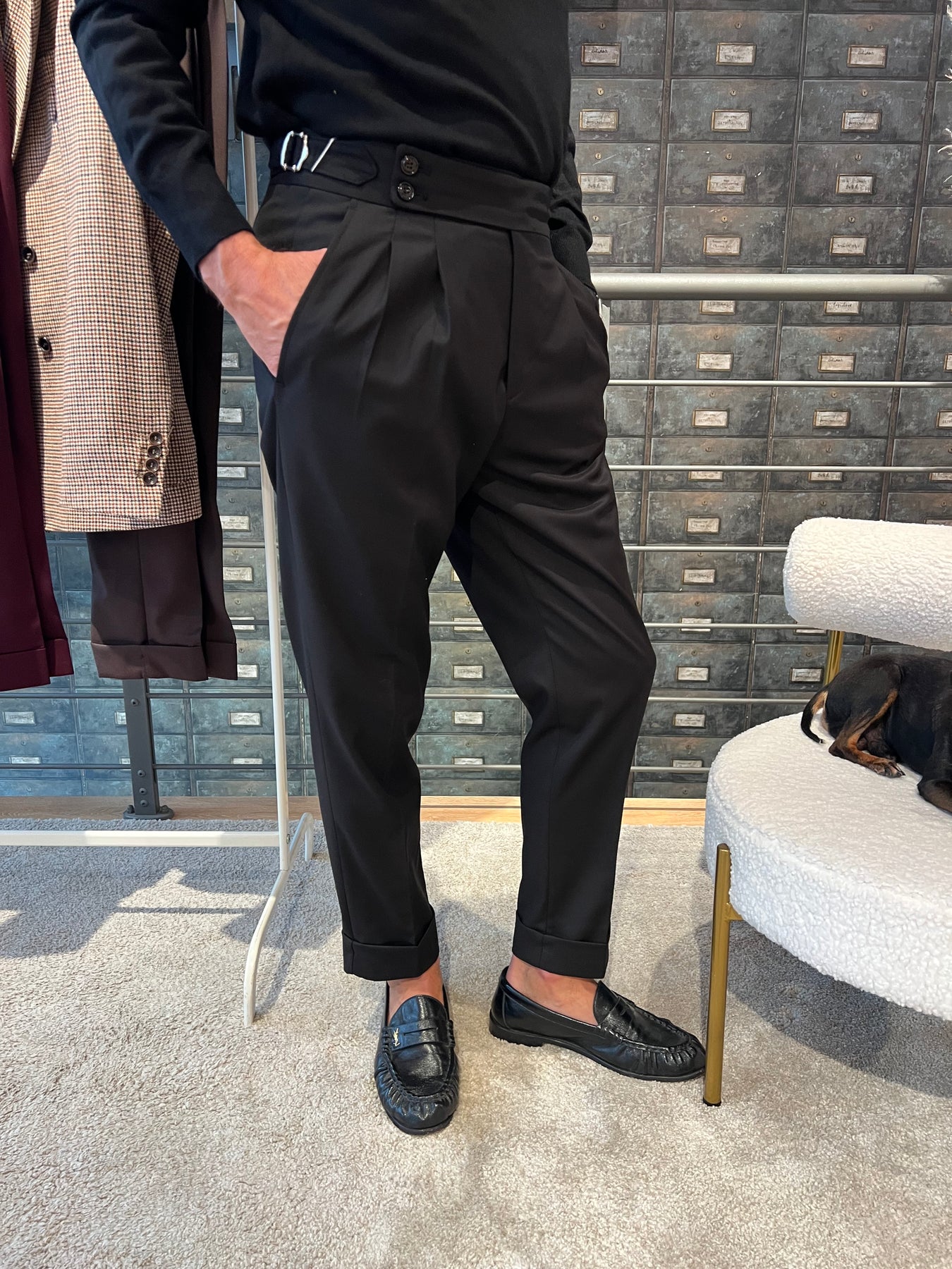 Pantaloni dal taglio slim a vita alta con pinces e fibbie laterali, fondo asciutto con risvolto.