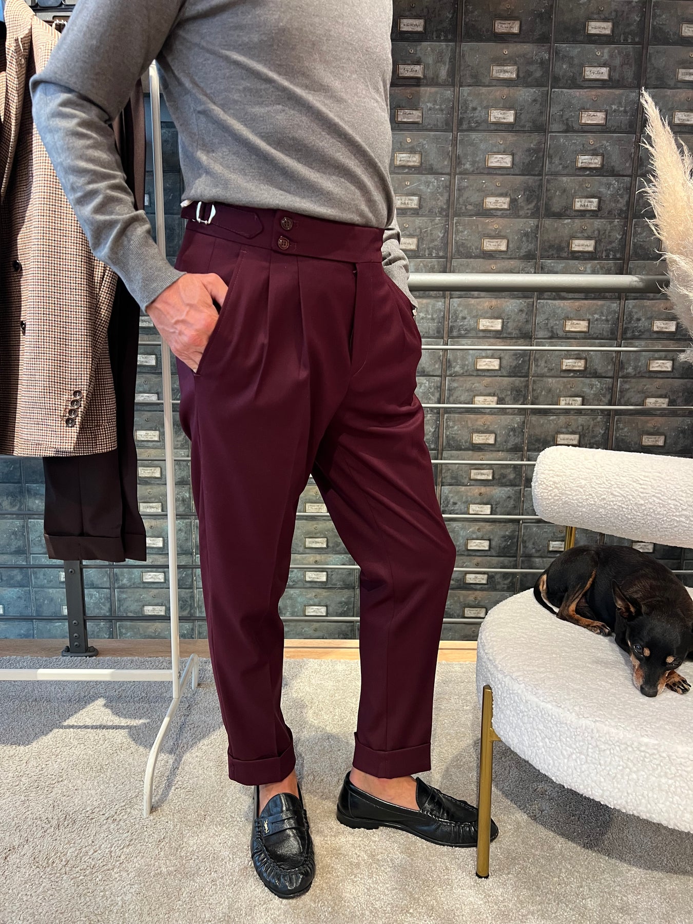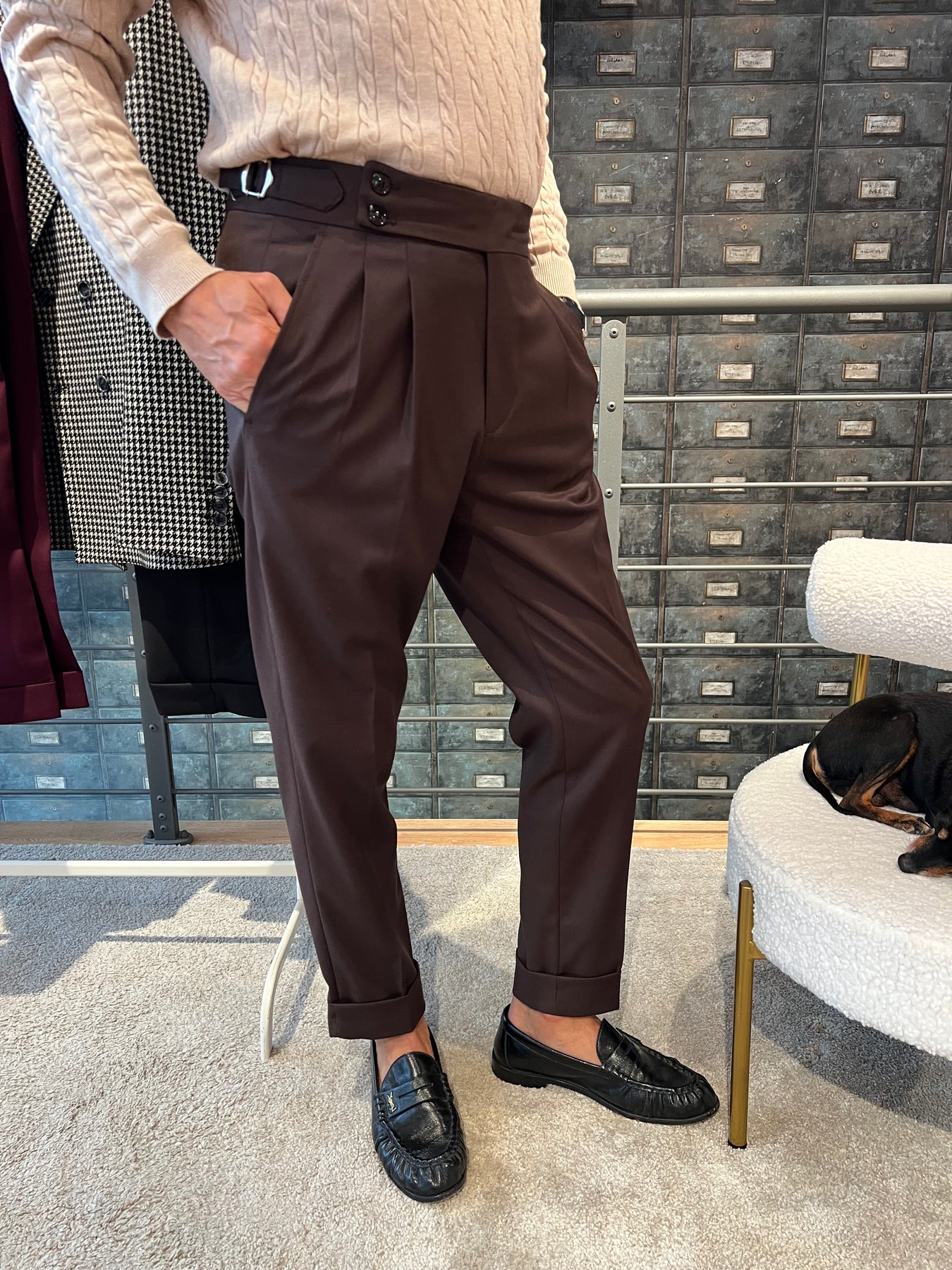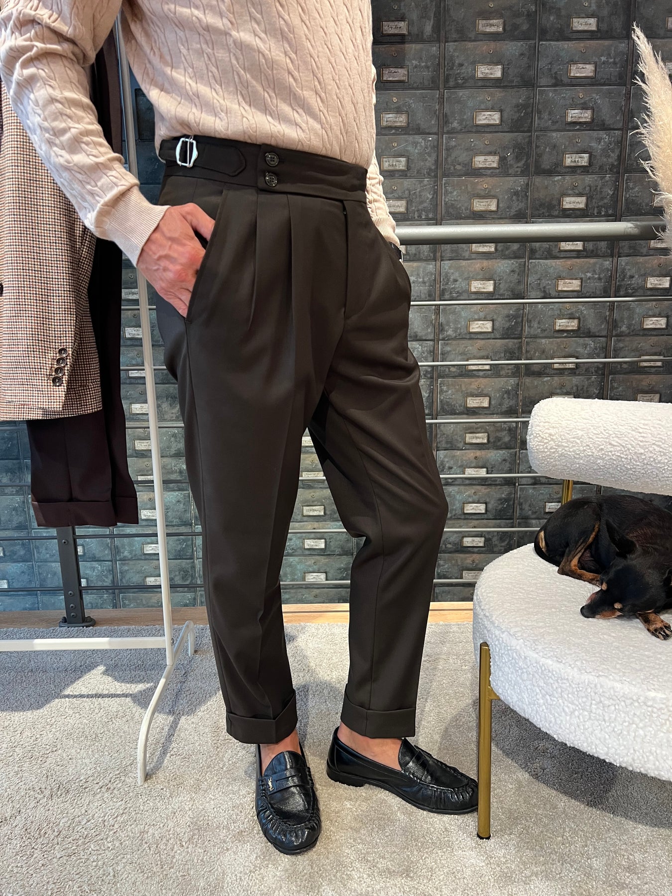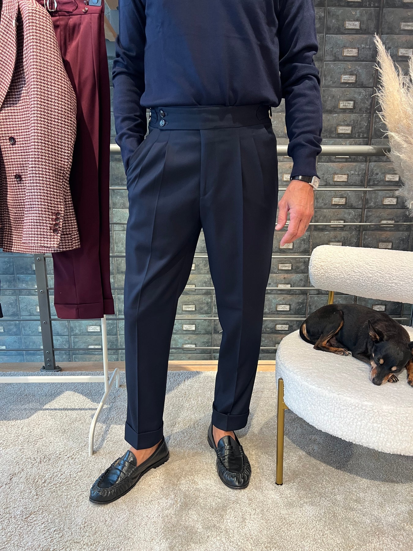 Pantaloni dal taglio slim a vita alta con pinces e fibbie laterali, fondo asciutto con risvolto.