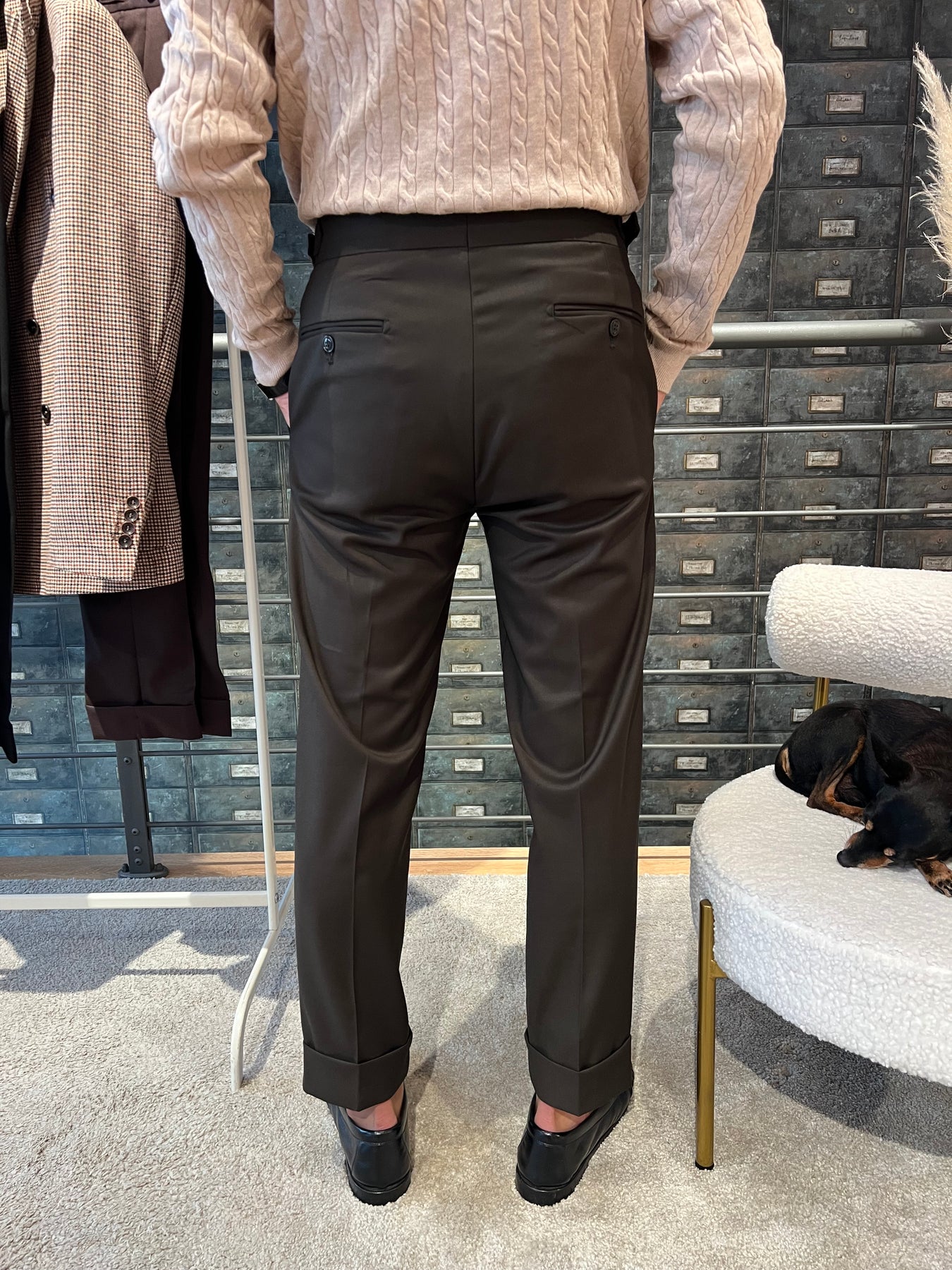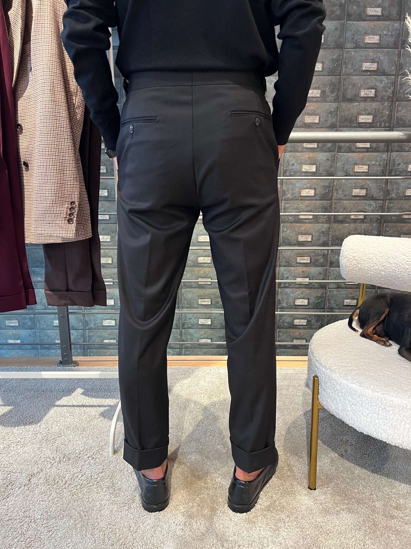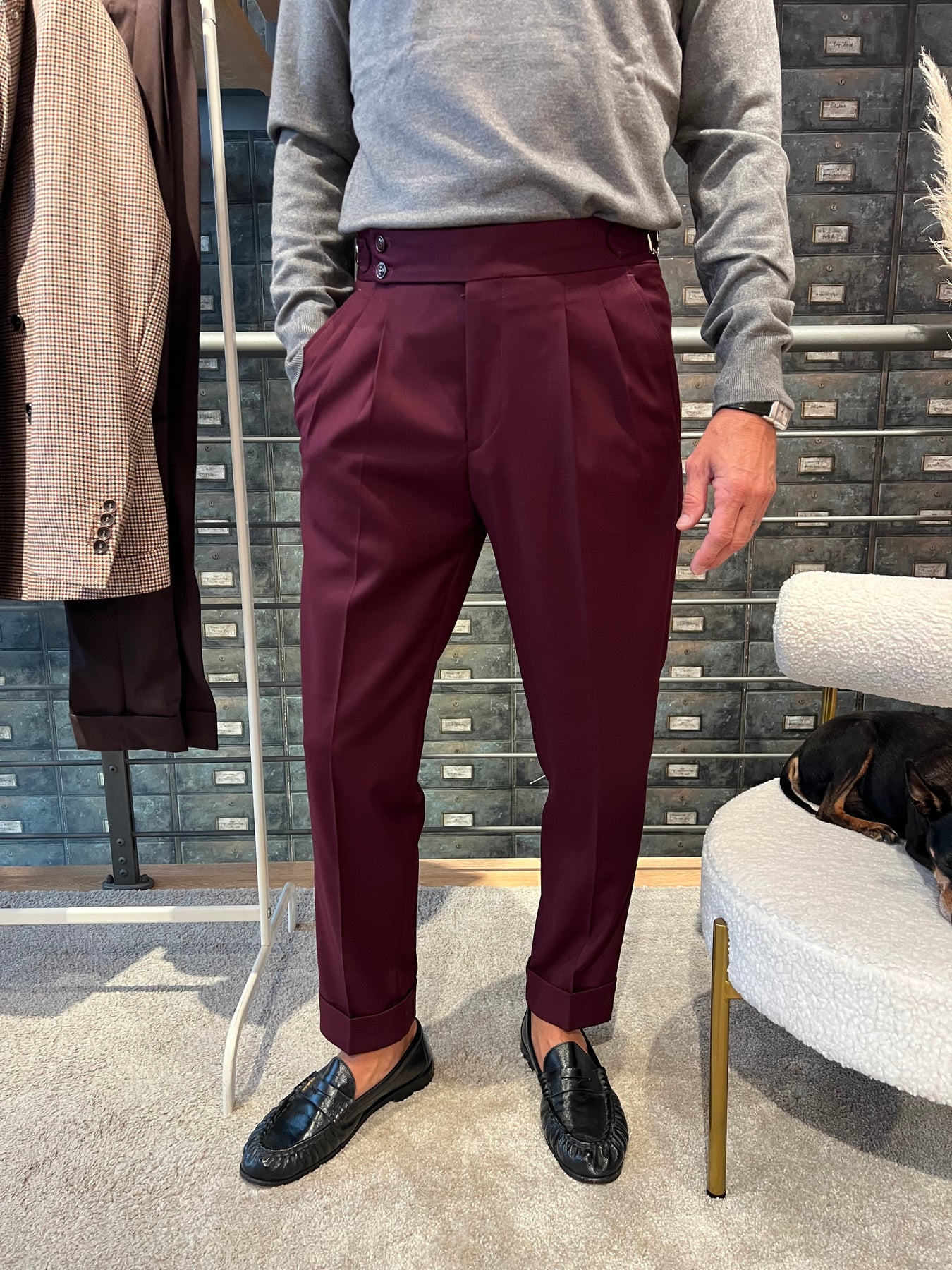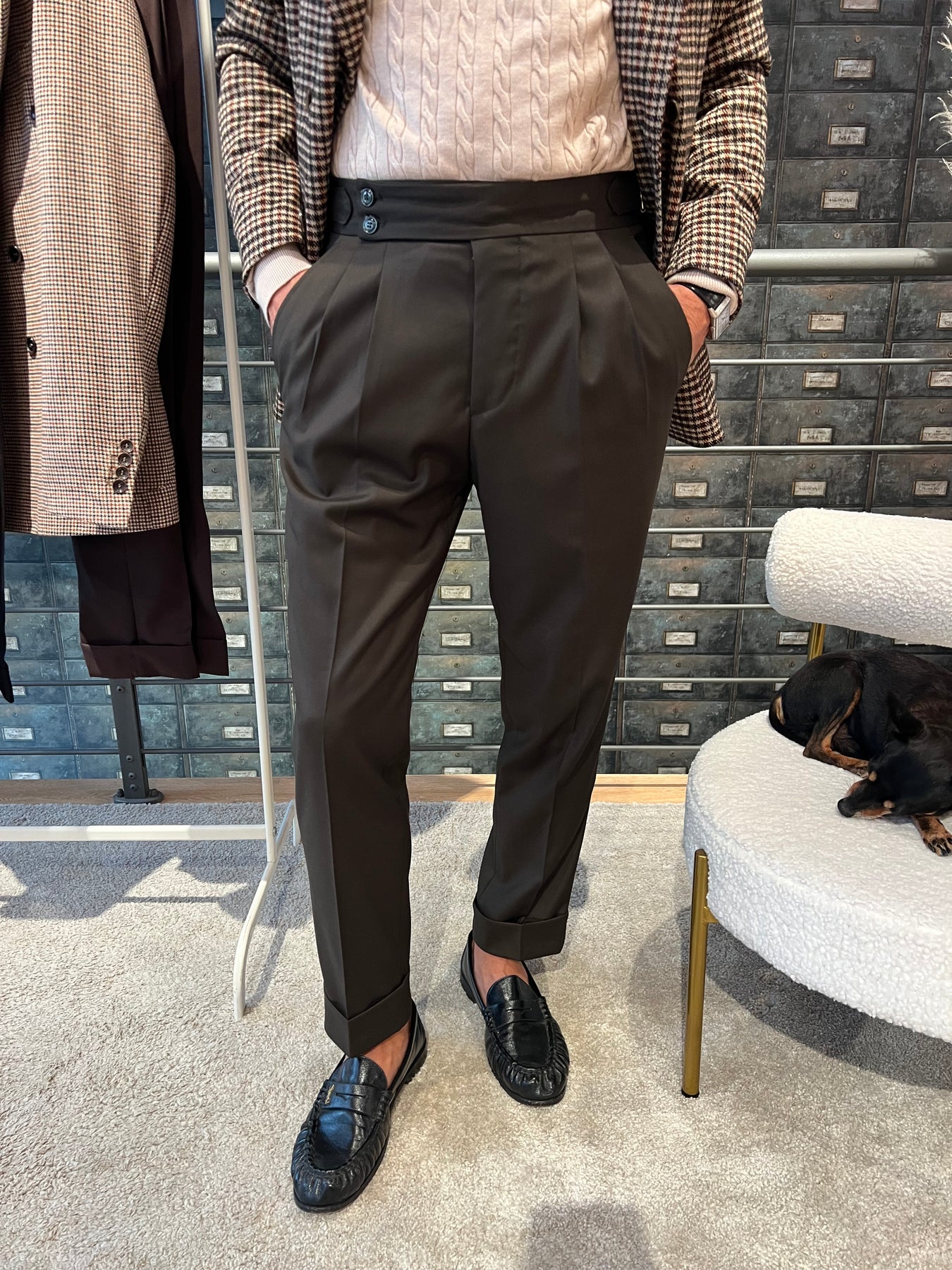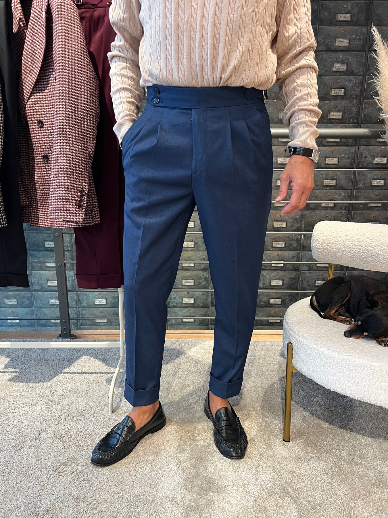 Pantaloni dal taglio slim a vita alta con pinces e fibbie laterali, fondo asciutto con risvolto.